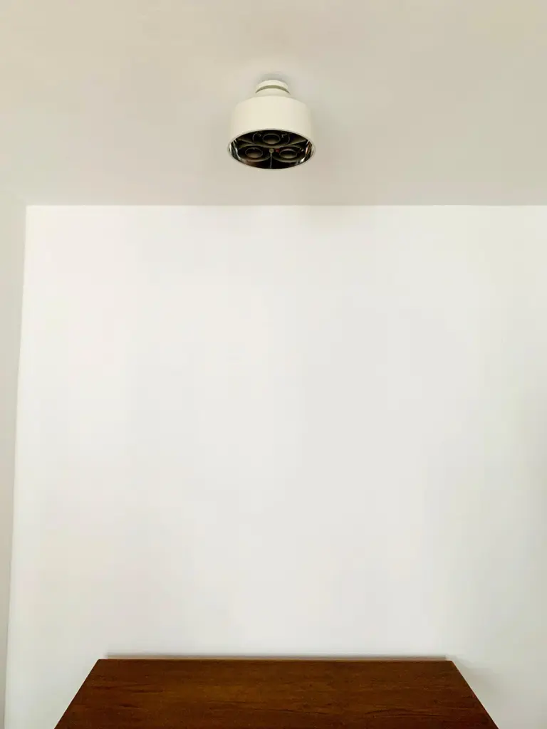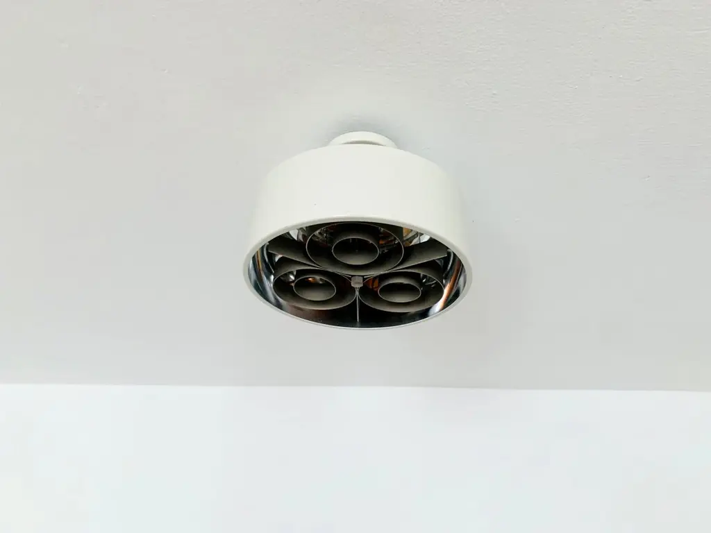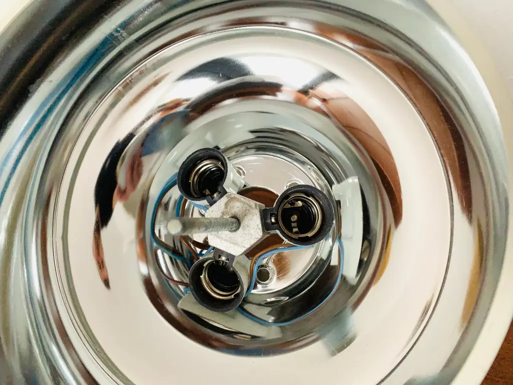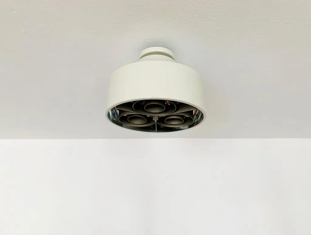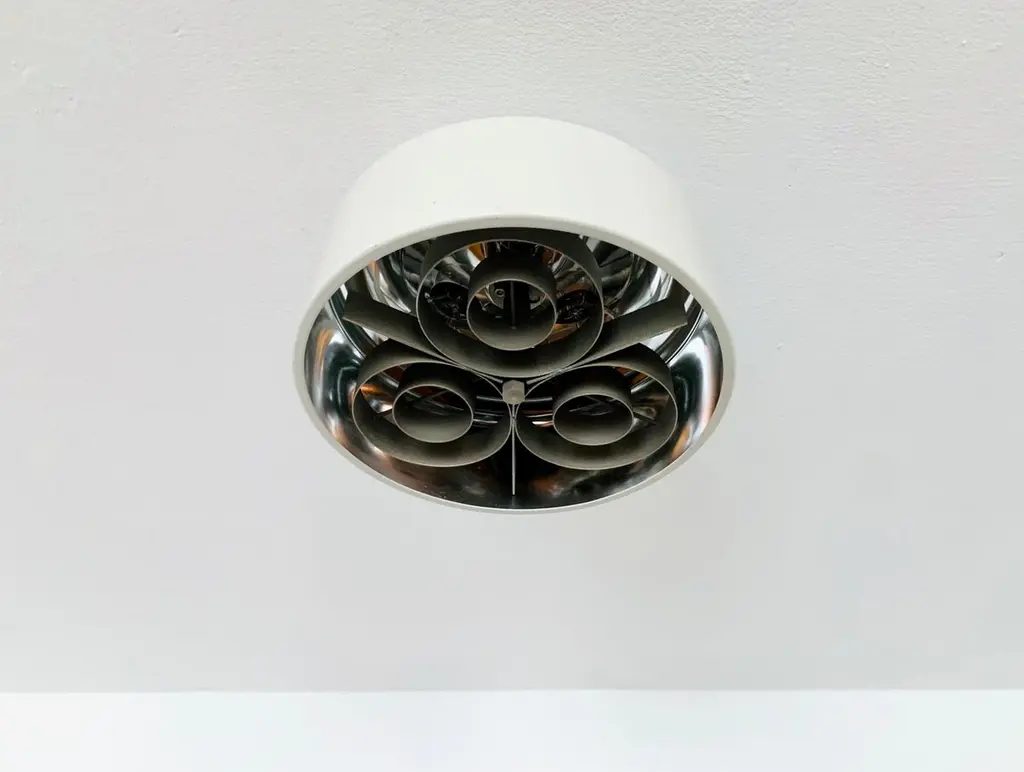 Danish ceiling lamp from the 1960s.Exceptional design and very high quality workmanship.The lamp is a highlight for every room.The reflector creates a spectacular play of lightCondition:Very good vintage condition with slight signs of age-related wear.Slightly patinated metal parts.The pictures are part of the description.I would be happy to help with any questions.Dimensions: Diameter: 26 cm/ 10.24 in.Height: 18 cm/ 7.09 in.Bracket diameter: 10 cm/ 3.94 in.3x E27/ E26 socketShipping takes place without bulbs.Works from 110V to 230V and is suitable for all countries.