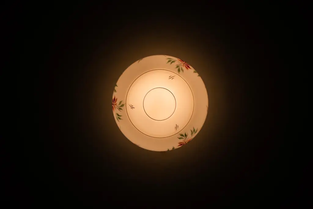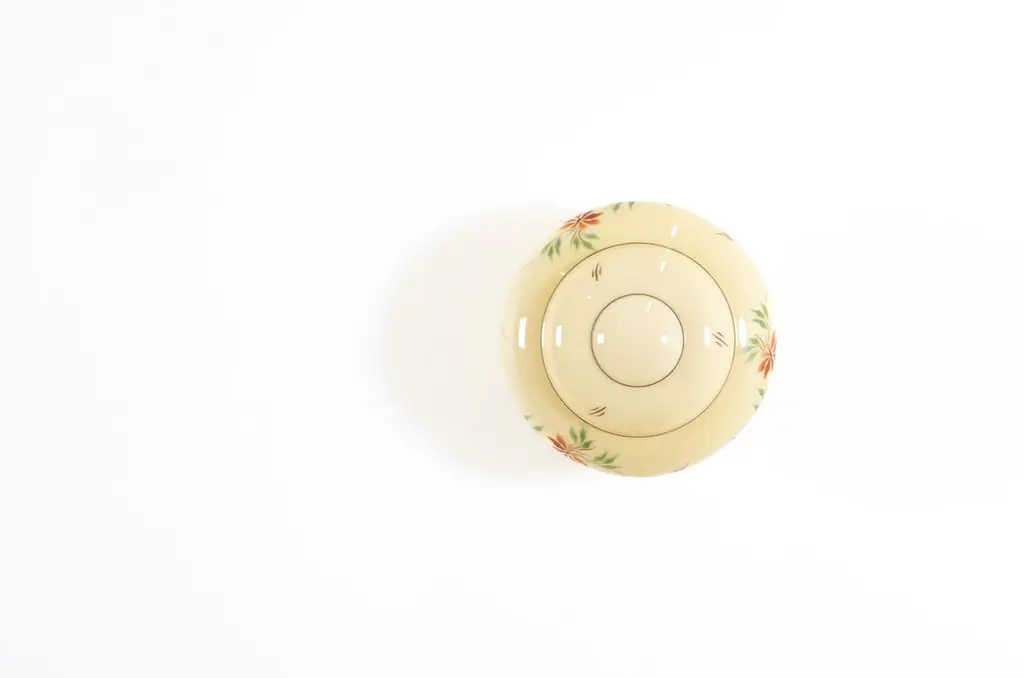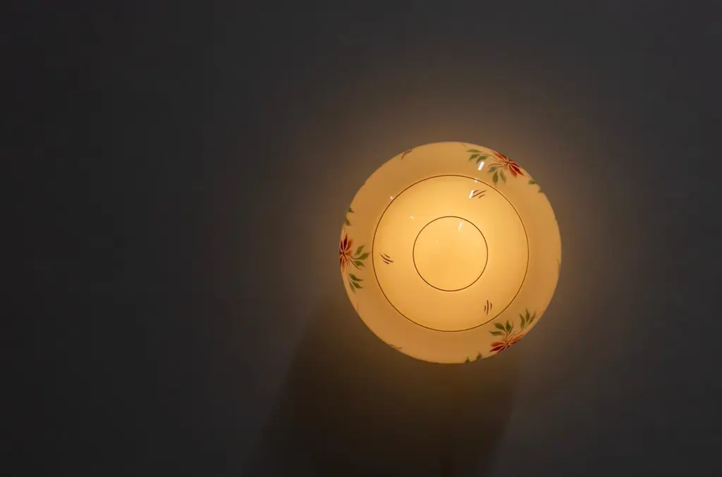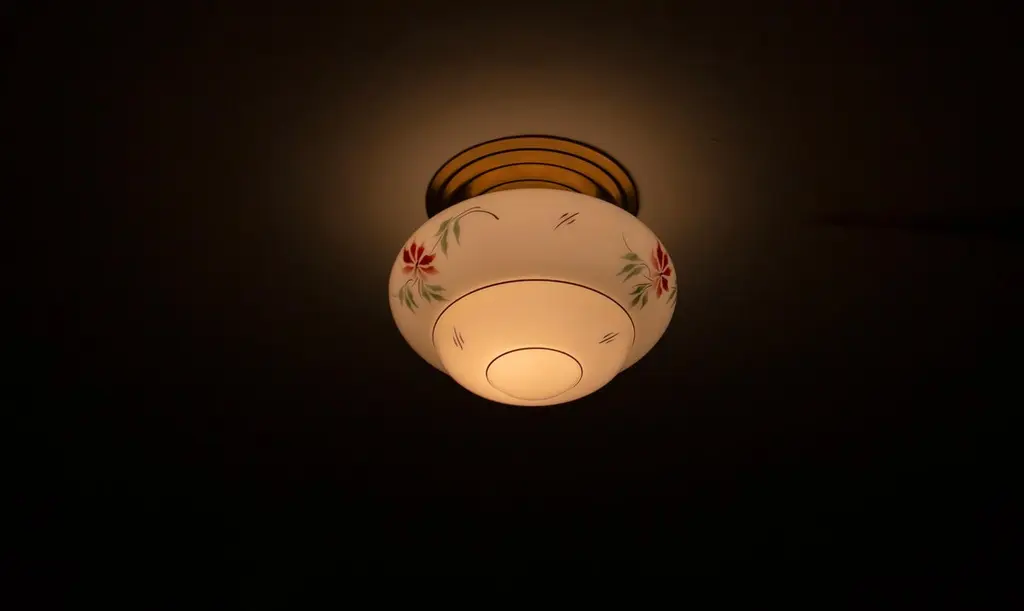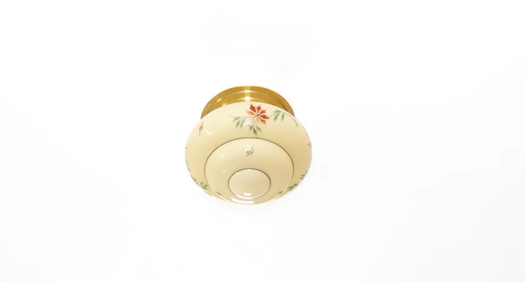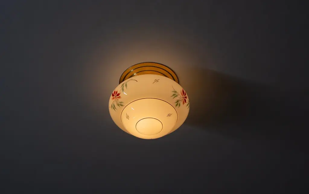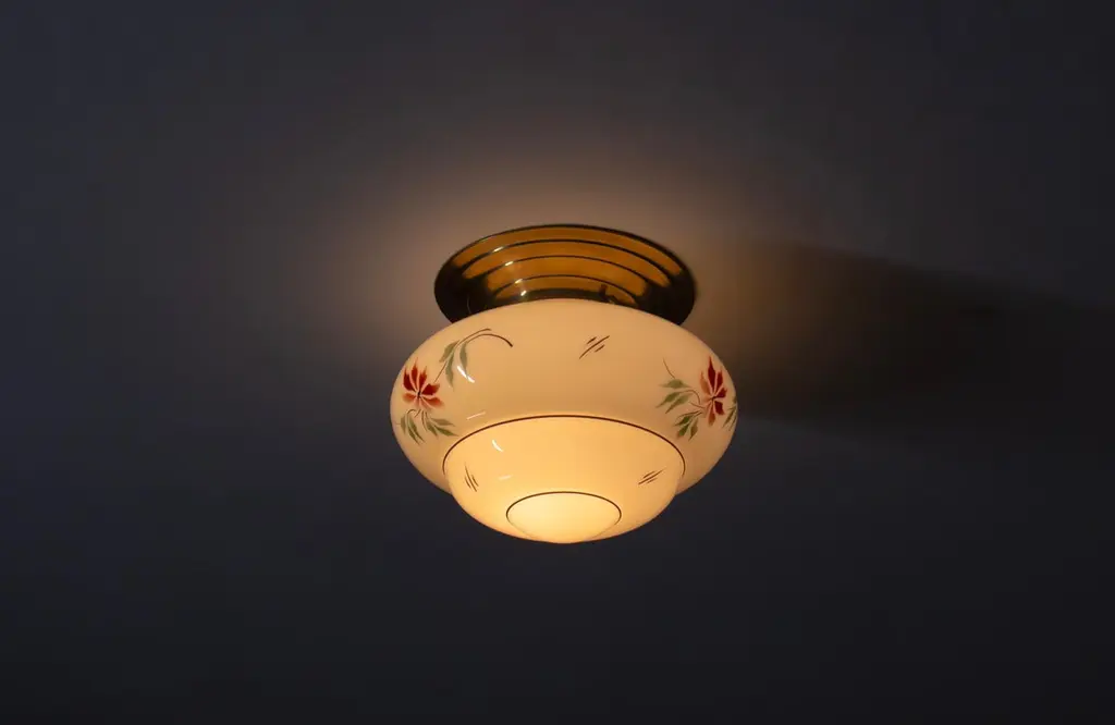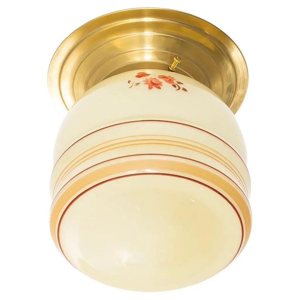 Wonderful ceiling light with hand-decorated glass shade and brass metal base. Designed and made in Norway from ca 1950s first half. Perfectly suited for entryways, hallways, or restrooms. The ceiling light provides a warm, diffused glow and an authentic presence.The light is fully working and in good vintage condition. It is UL-ready, pre-wired for the US market, and compatible with standard US voltage and the E26 bulb size. You can connect it directly to the electrical outlet without any additional rewiring.