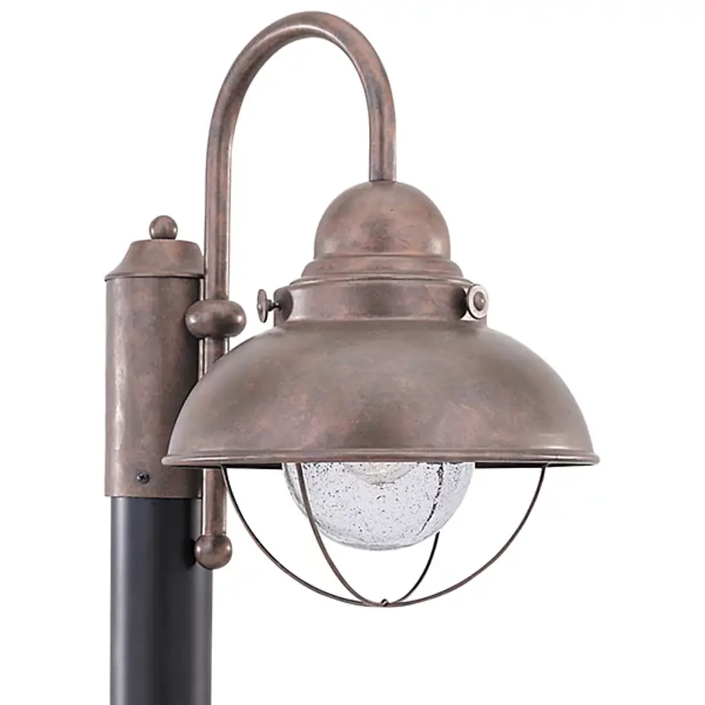 The Sebring one light outdoor ceiling fixture in weathered copper creates a warm and inviting welcome presentation for your home's exterior. This industrial and nautically inspired Sebring collection by coordinates perfectly in coastal locations, while adding eye catching contrast to facades of any kind. Offered in Black, Brushed Stainless and Weathered Copper finishes, Sebring is a complete outdoor collection with small and large one-light outdoor wall lanterns, a one-light outdoor ceiling flush mount and one-light outdoor post lantern to unify any home's appearance. Incandescent as well as integrated LED are available. The advanced, integrated LED light source has warm-on-dim technology that warms in color when dimmed, and is California Title 24 compliant.