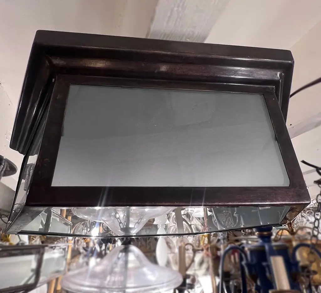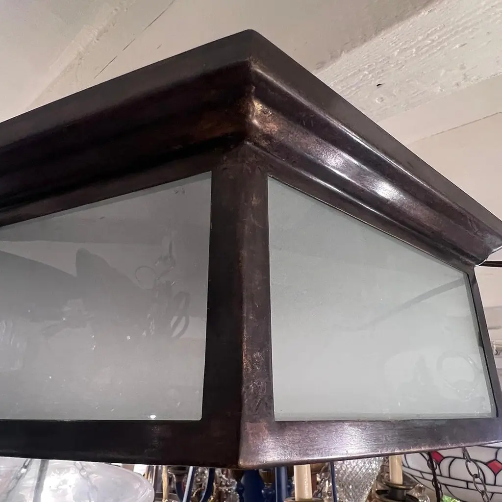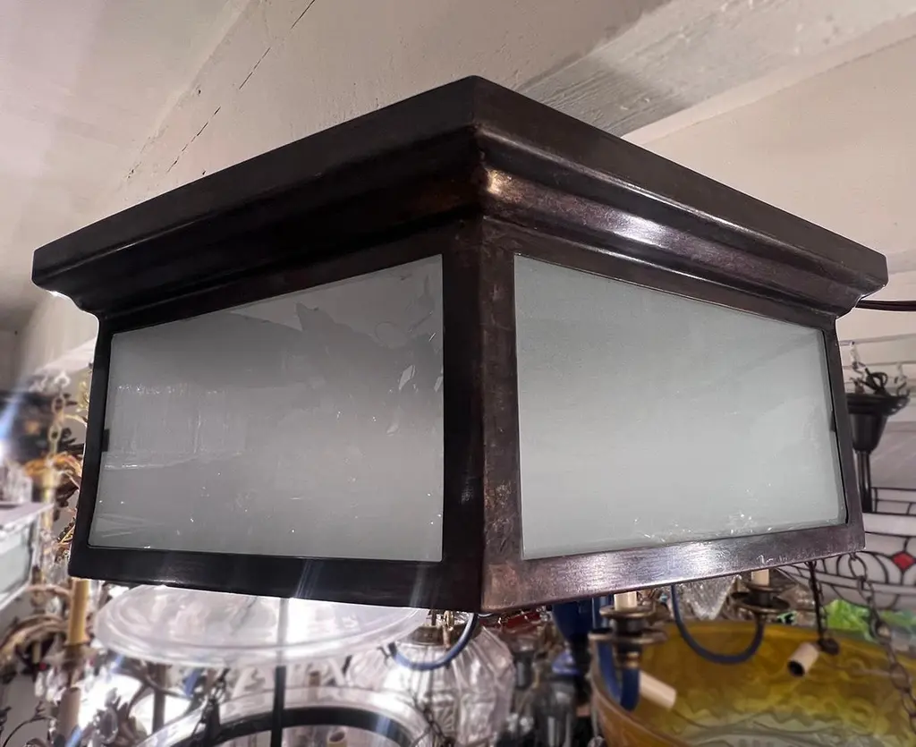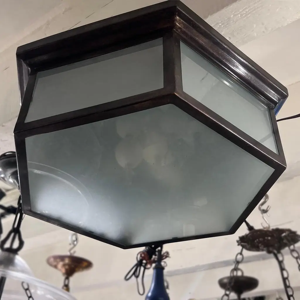 A set of 12 circa 1950s Italian patinated brass light fixtures with inset frosted glass and 3 candelabra interior lights. Sold individually.Measurements:Height: 5"Diameter: 16"