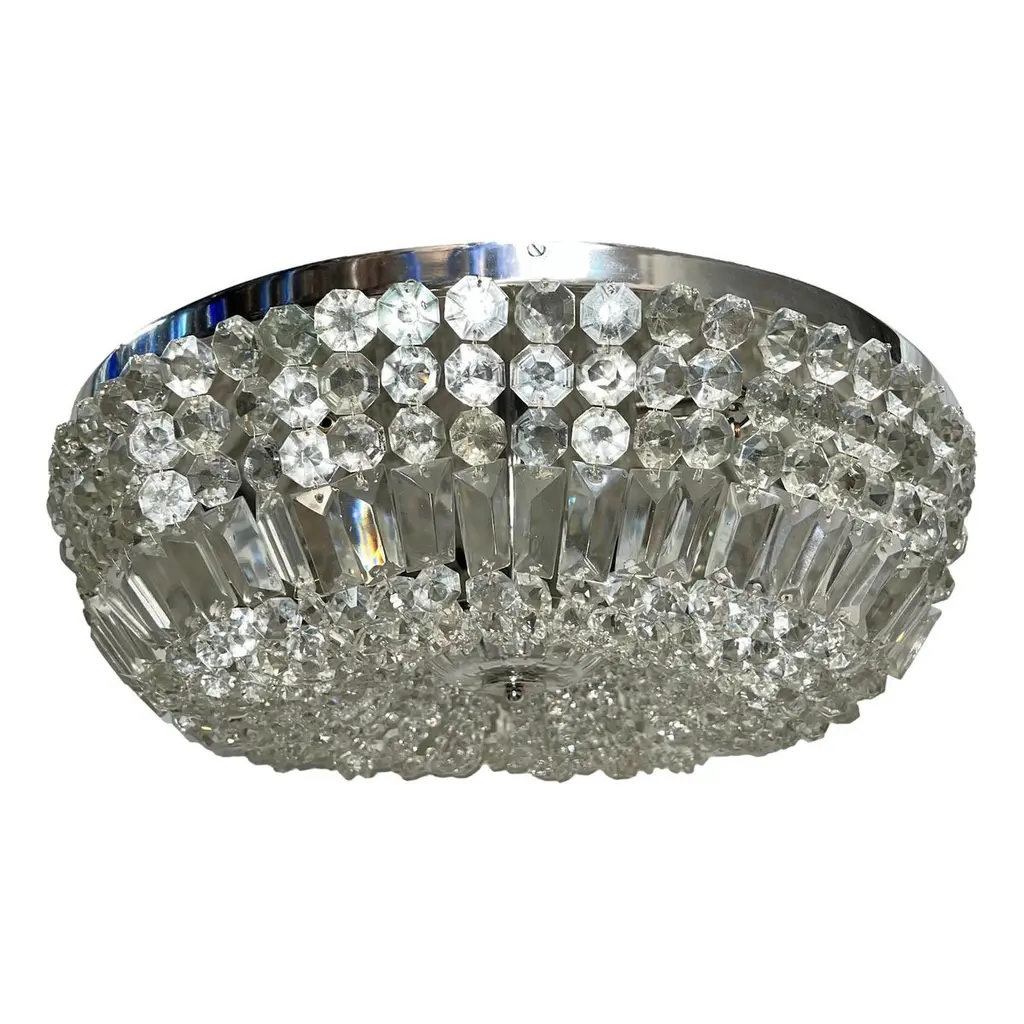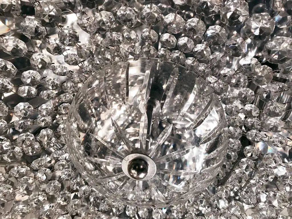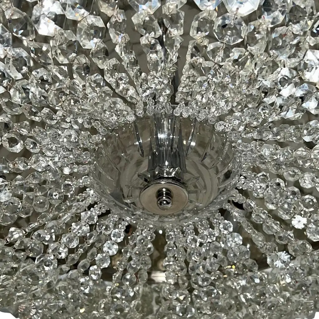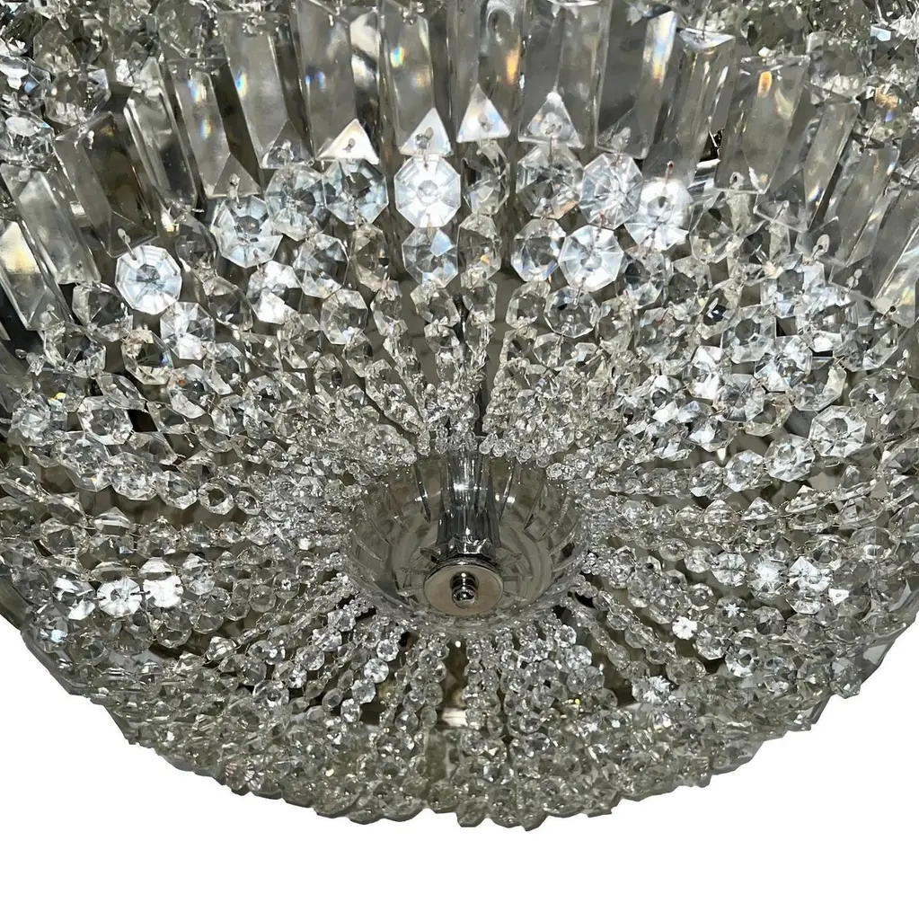 A set of four nickel-plated Art Deco crystal French flush mounted light fixtures with six lights each. Sold individually.Measurements:Diameter: 23"Drop: 7"