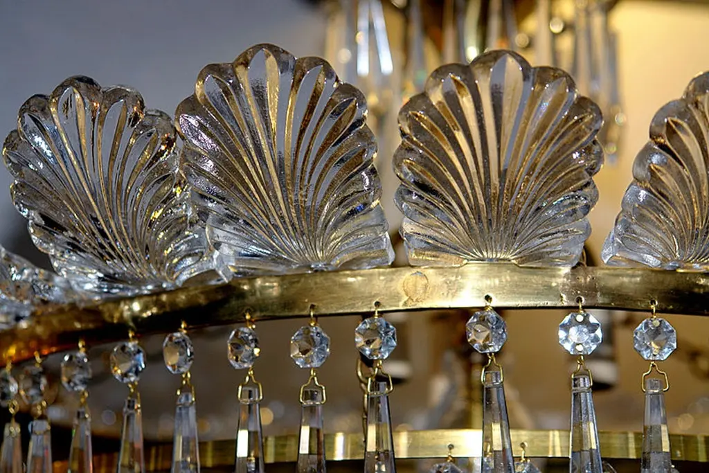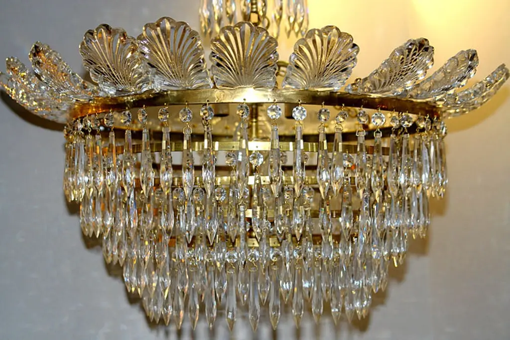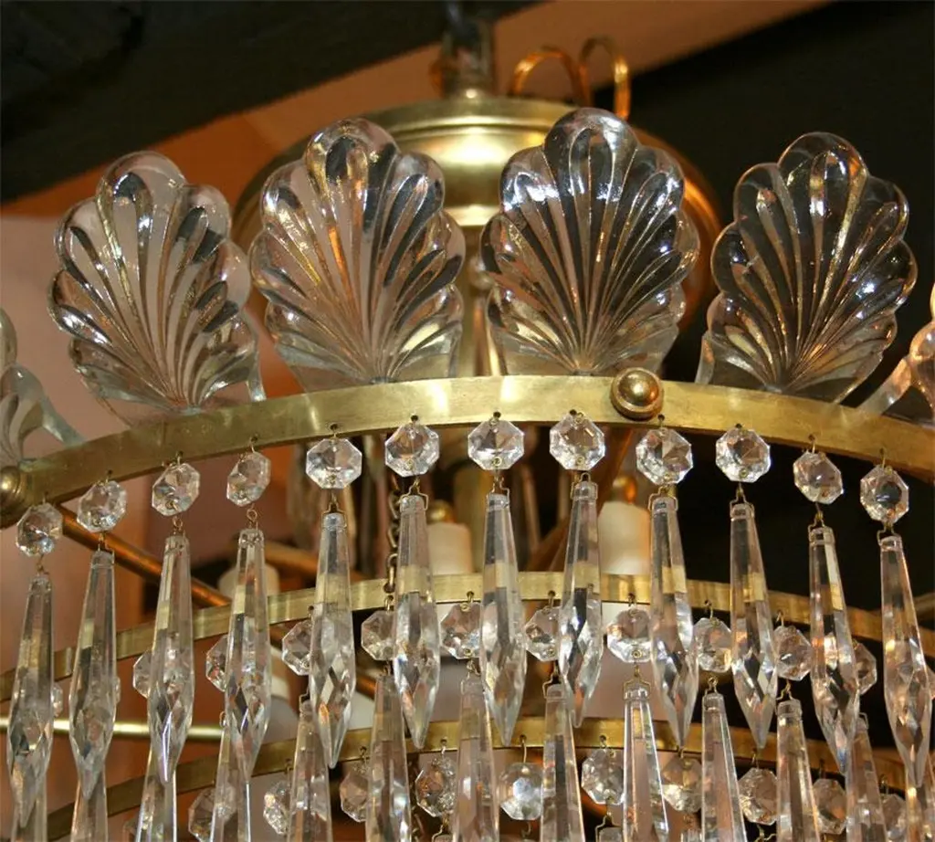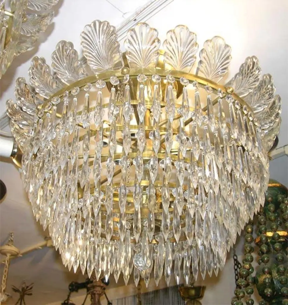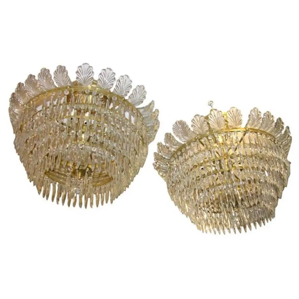 A set of fourteen French circa 1930s six-light gilt bronze flushmounted chandeliers with crystal drops on a tiered body crowned with crystal acanthus leaves. Sold individually.Measurements:Height 20"Diameter 25".