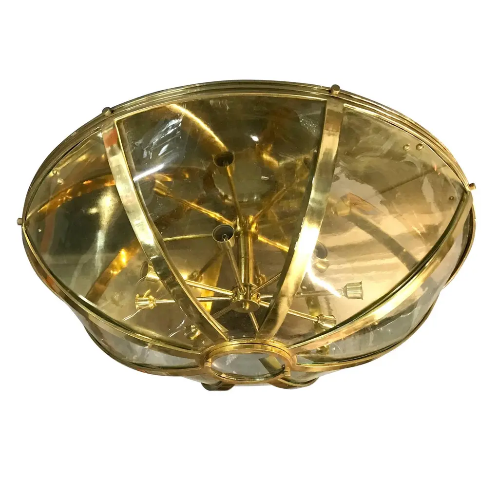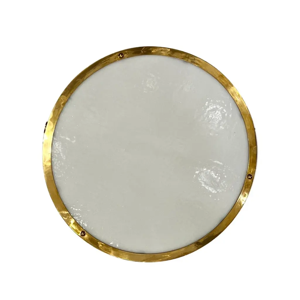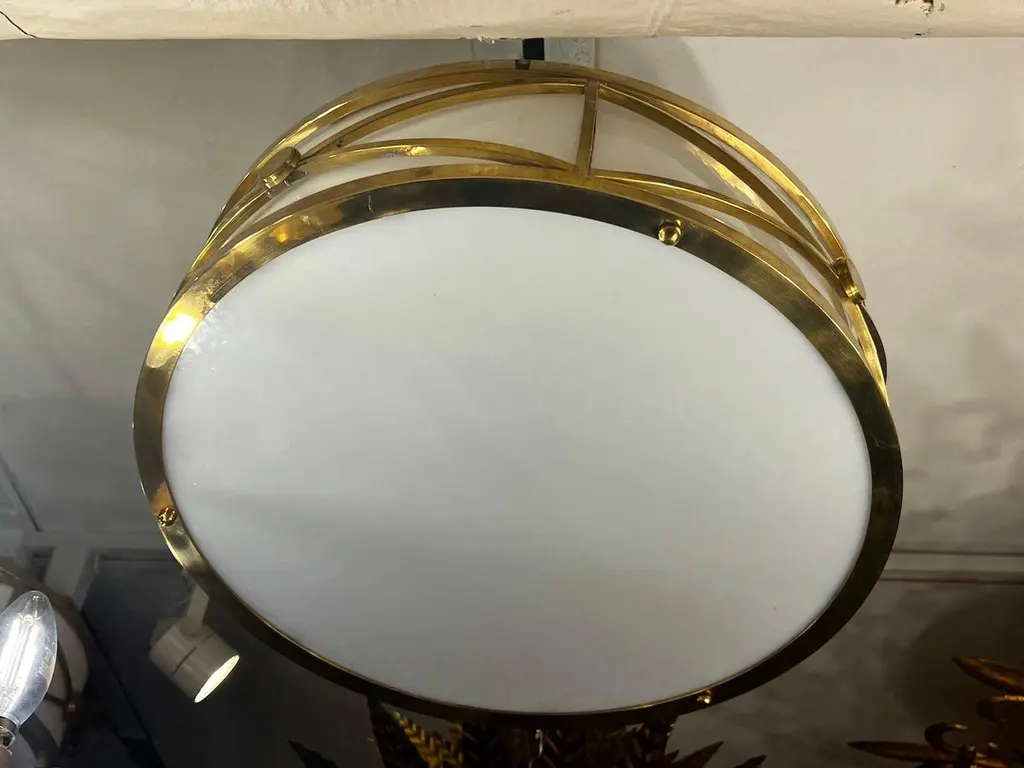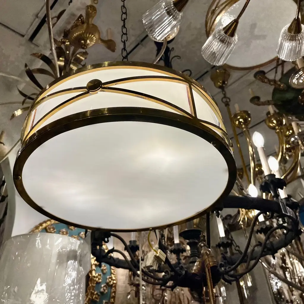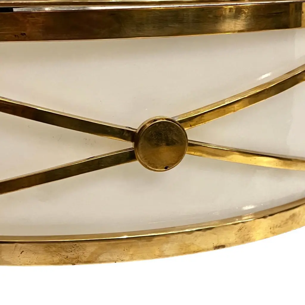 Set of four French mid century flush-mounted light fixtures with milk glass insets. Sold individually.Measurements:Diameter: 14"Drop: 4.75"