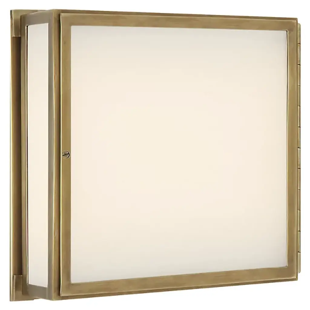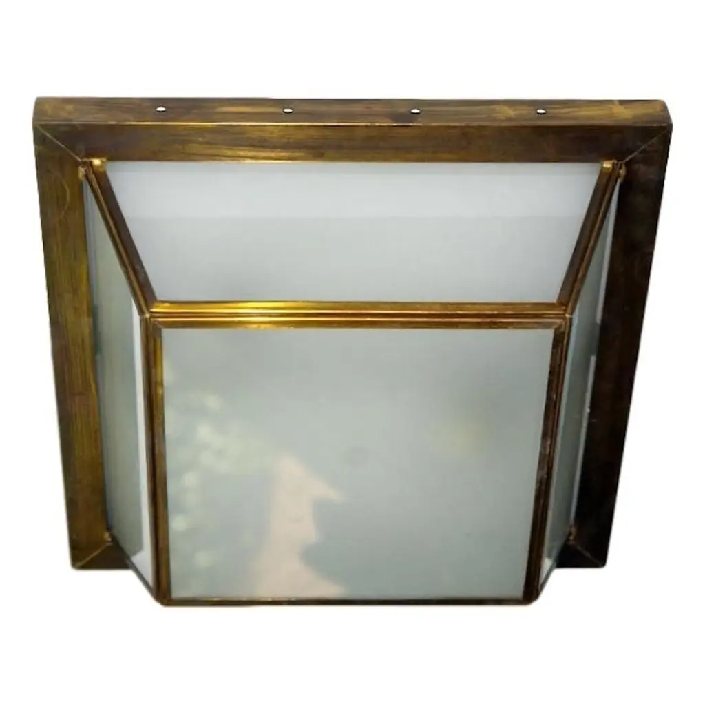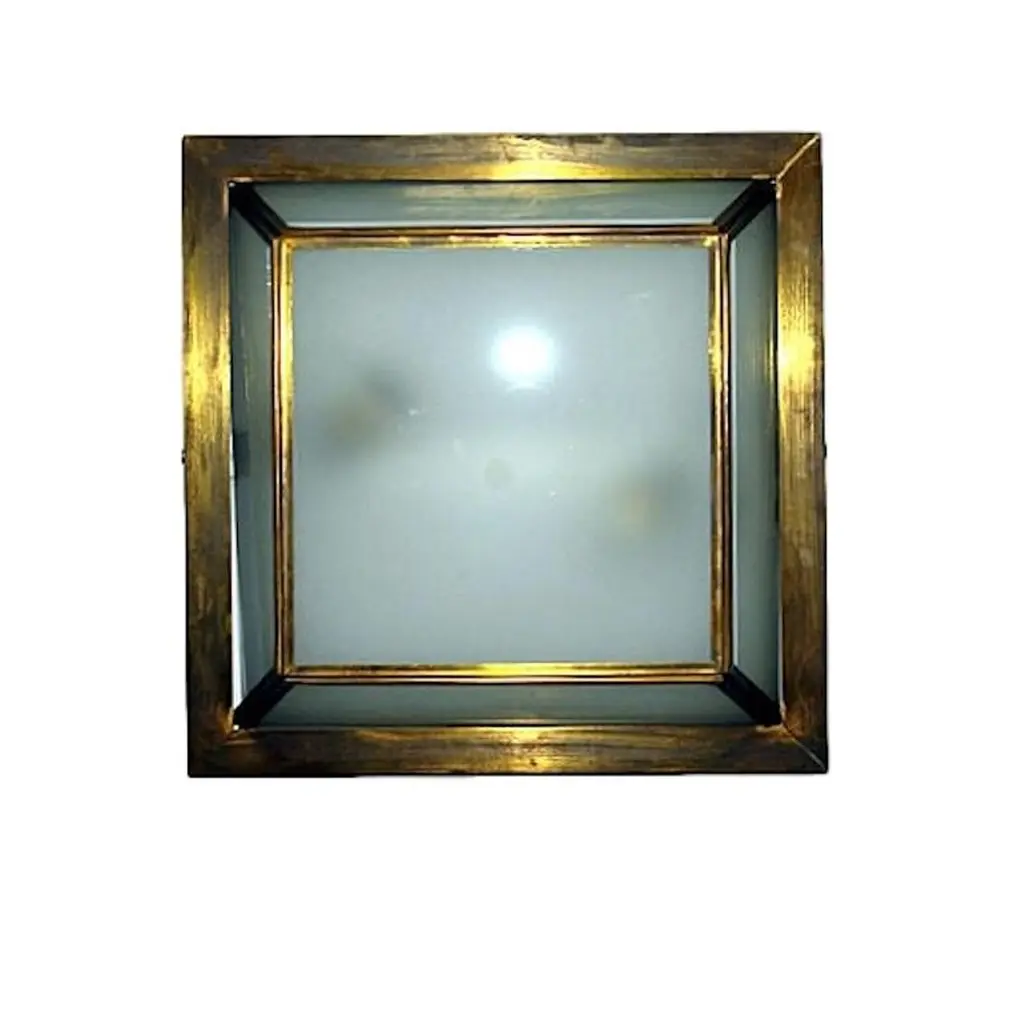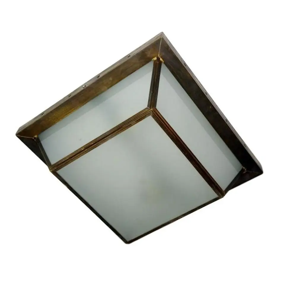 Set of eight flushmounted fixtures with frosted glass insets and two interior lights with original patina. Sold individually.Measurements:Drop 6"Width (square) 13.5".