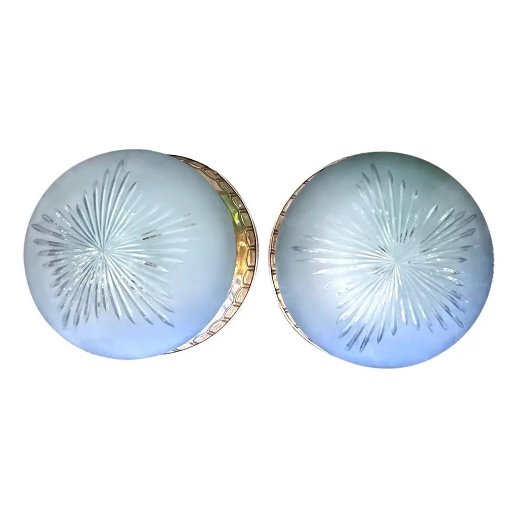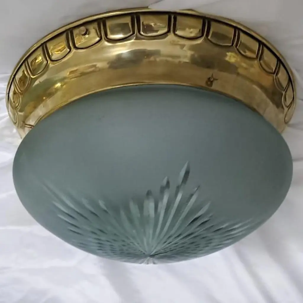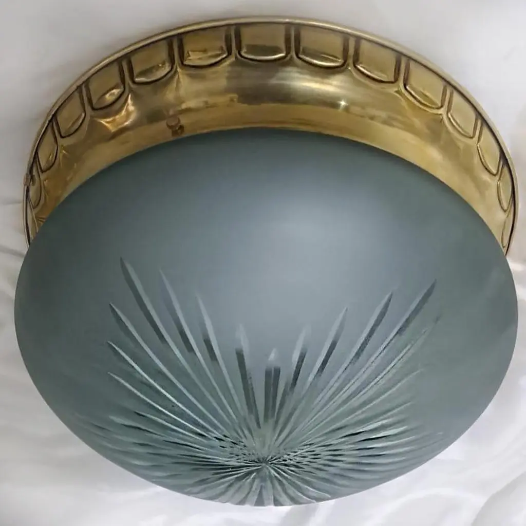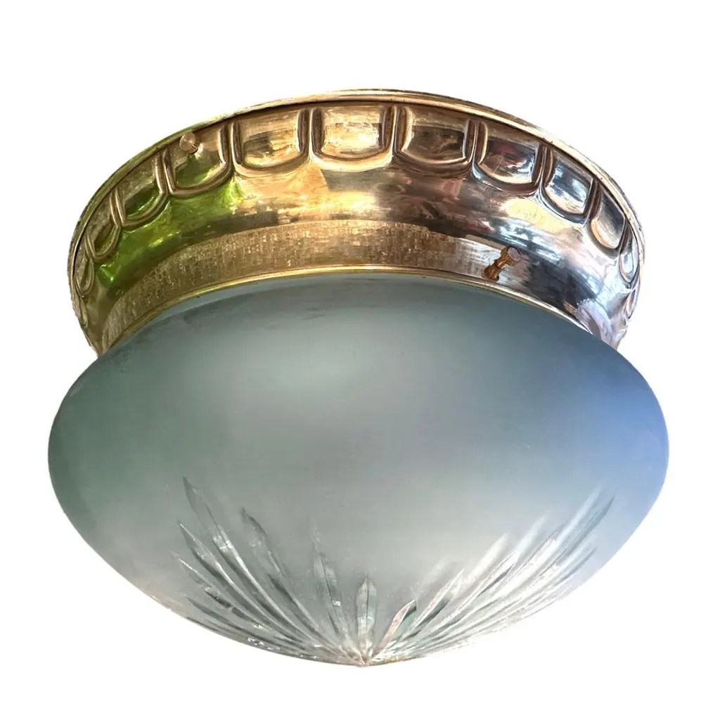 Set of 12 English circa 1940's flush mount light fixtures with frosted glass. Sold individually.Measurements:Diameter: 15"Depth: 8.5"