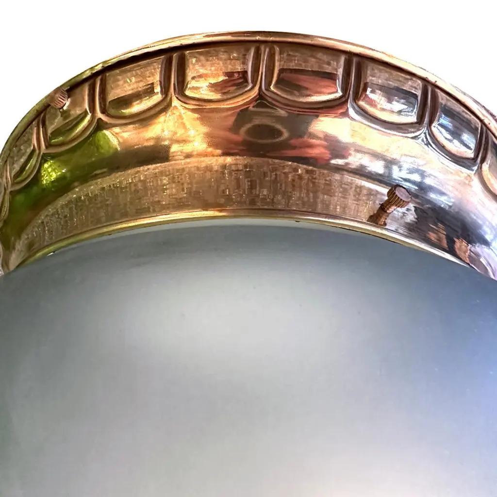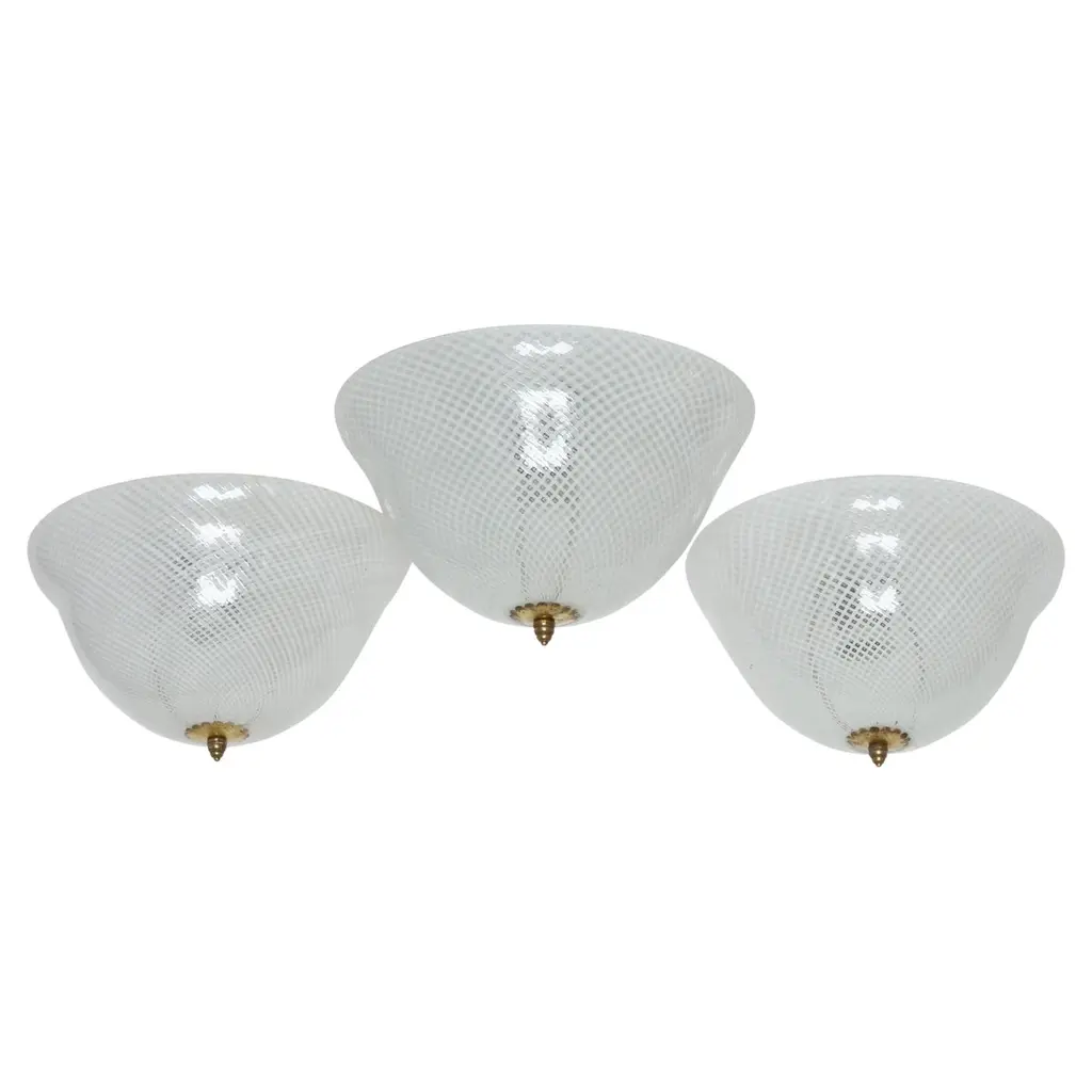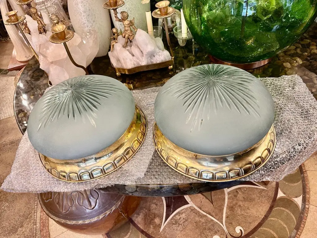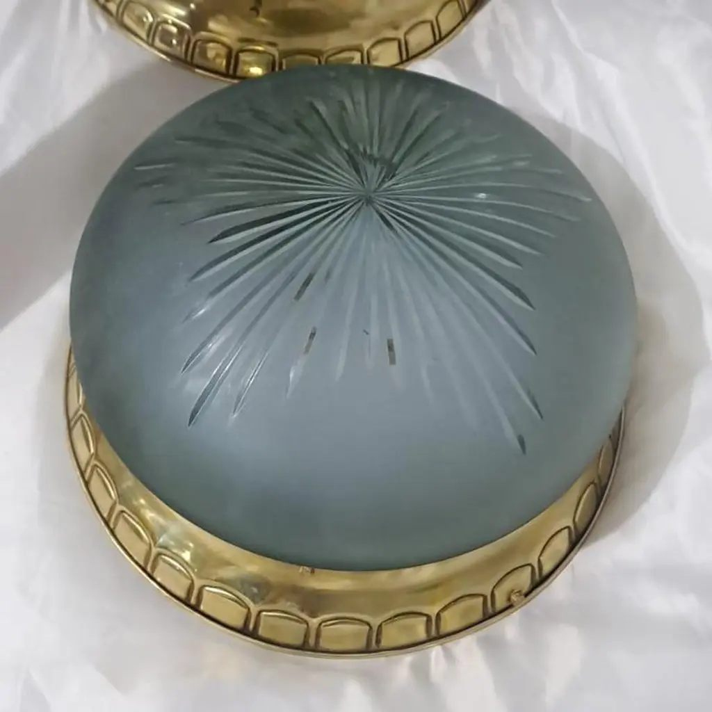 Set of 12 English circa 1940's flush mount light fixtures with frosted glass. Sold individually.Measurements:Diameter: 15"Depth: 8.5"