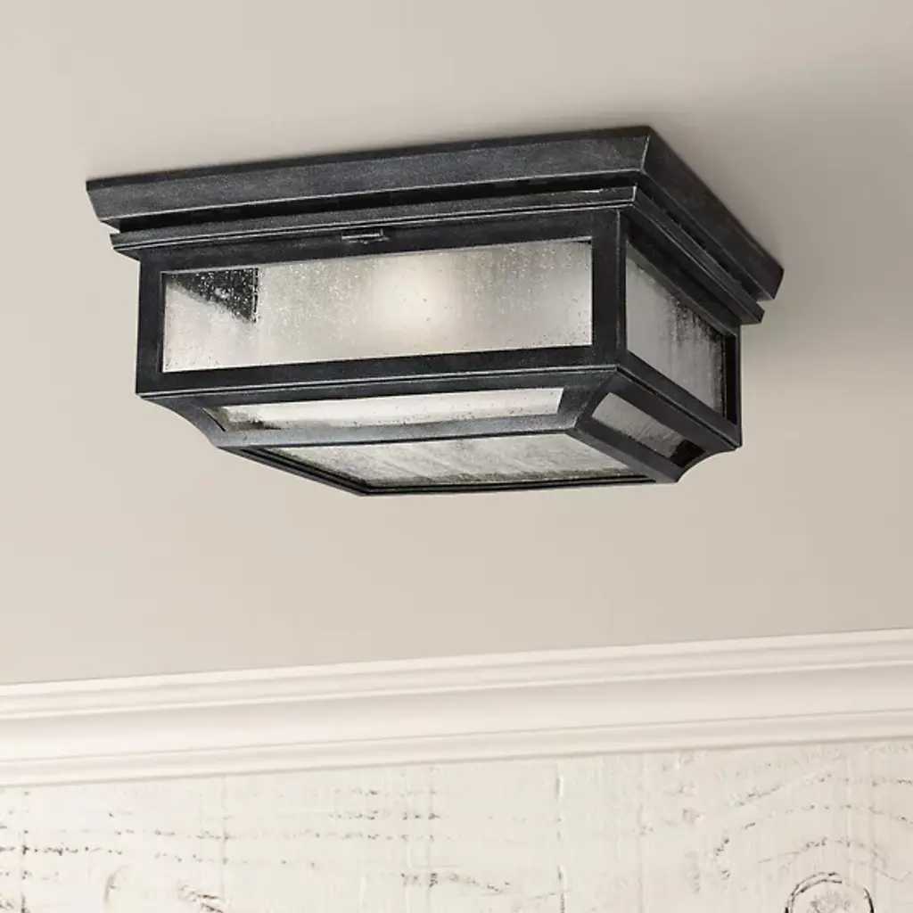 Attention to detail abounds in the Shepherd Outdoor Flushmount by Visual Comfort Studio, formerly known as Sean Lavin, Featuring their StoneStrong material, enabling it to withstand the harshest environmental conditions, this close-to-ceiling fixture employs smooth curves, sharp angles and hinge details to bring significant style to your outdoor space. Inner White glass smoothly diffuses ambient light to the space below, while Clear Seeded outer glass panels complete the look. You can create your ideal atmosphere with this product because it is dimmable with a standard incandescent dimmer (not included).