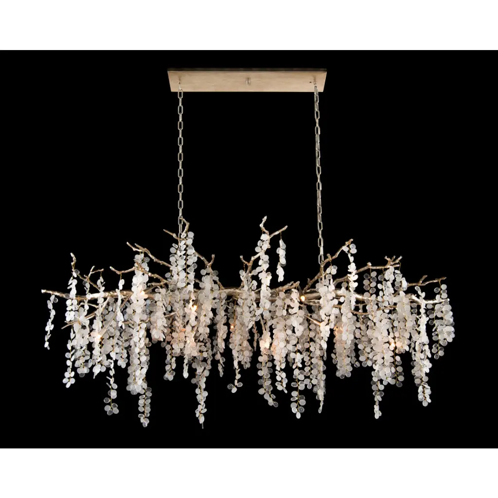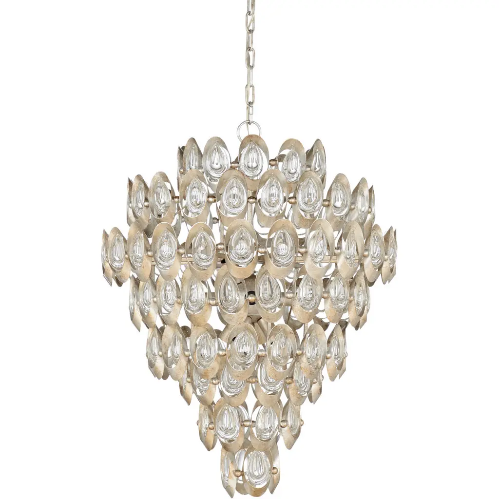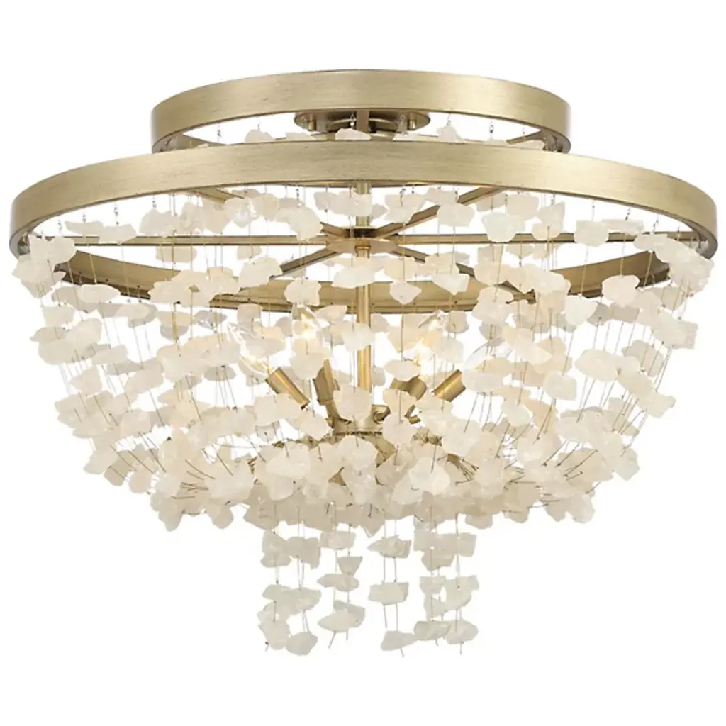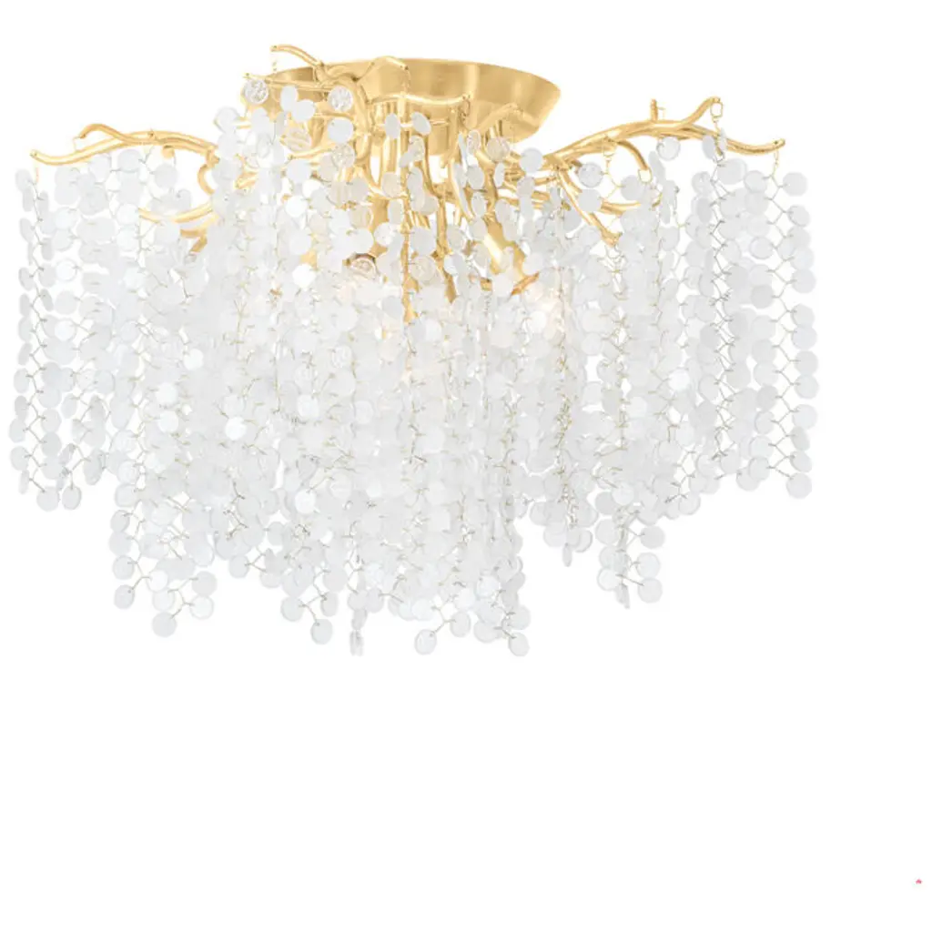 Shiro-noda variegated, frosted, and clear crystal clusters dramatically drip from this ornamentally stunning five-light flush chandelier. Maximum Overall Hang Height: 30"H. 40 Watt Max, 5 Type G9 Bulbs (included), Canopy: 6"