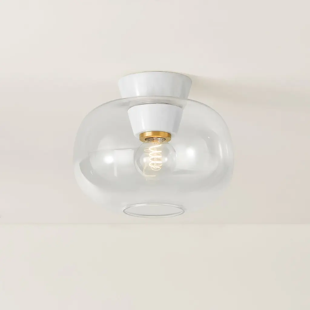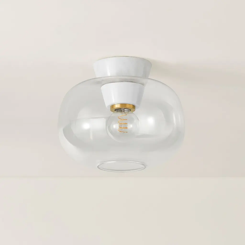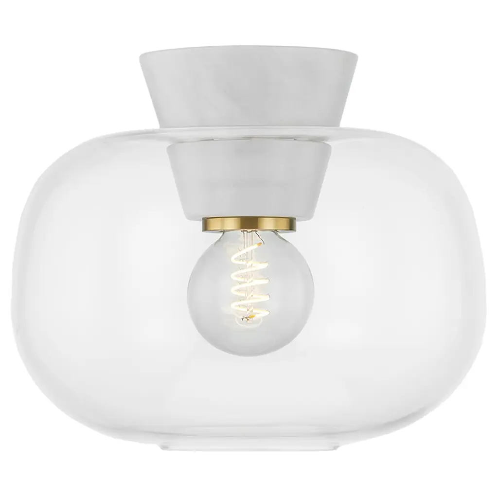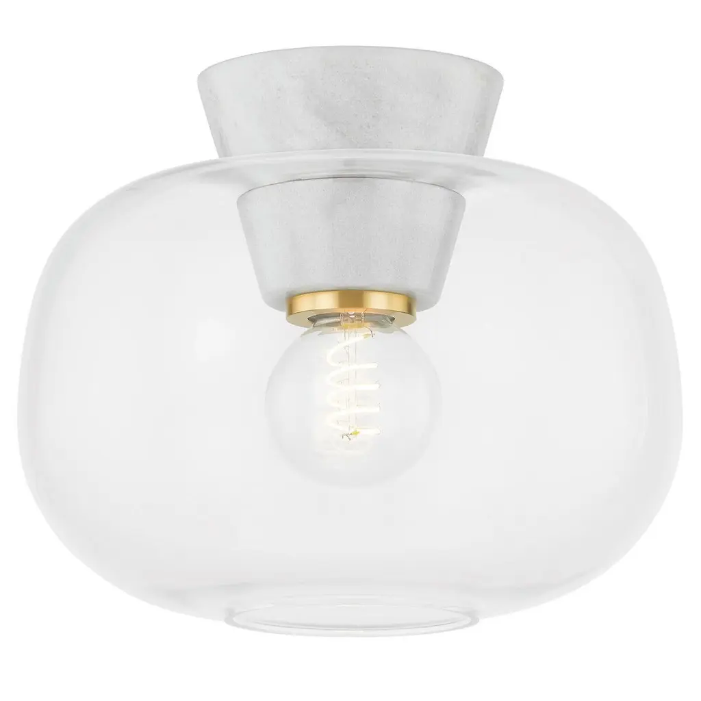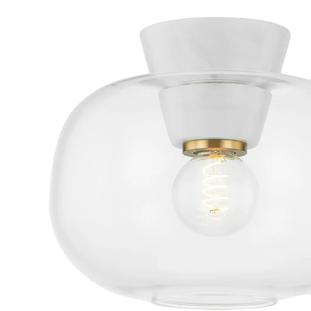 A marriage of opposing materials, this sculptural flush mount features a honed Thasos marble canopy, which creates the illusion of piercing through a soft glass shade. The bubble-like nature of the clear glass swells around the light source. Accessible, yet with a designer feel, Sienna floats overhead in contemporary bathrooms, bedrooms, and kitchens.