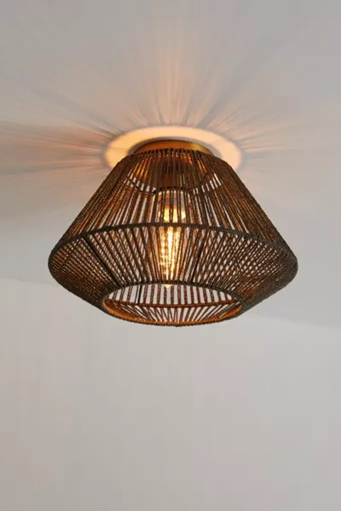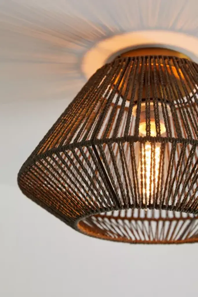 Crafted from jute and designed with a structural silhouette, this flush mount light adds the chicest boho vibes to your space. Complete with an iron base. **Features** \- Woven jute flush mount light \- Modern boho ceiling light \- Hardwired \- Requires E26 light bulb - not included **Content + Care** \- Hardwired; professional installation recommended \- Jute, iron \- Wipe clean \- Imported \- Made in compliance with US electrical standards. **Size** \- Dimensions: 14"l x 14"w x 9"h \- Wattage: 75W \- Weight: 2.4 lbs \- Shipping package dimensions: 15.75"l x 15.75"w x 11.8"h \- Shipping package weight: 3 lbs