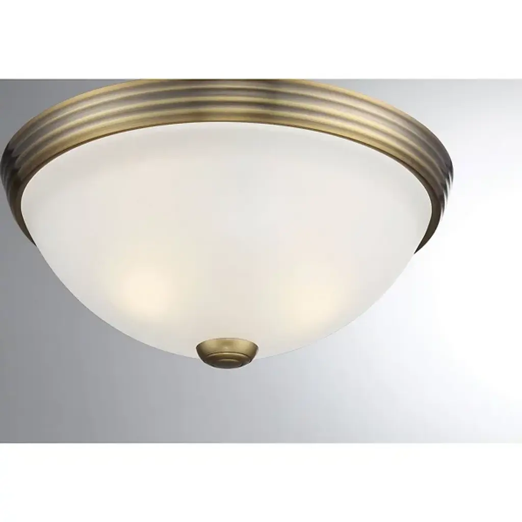 An elegant, understated profile that seamlessly fits with a range of interior decors and settings. The Signature Flushmount by Savoy House showcases a smooth dome shaped shade crafted from etched glass. This shade diffuses light from the 2 halogen lamps (sold separately) housed within to deliver ambient, even glow. This transitional piece is installed flush against the ceiling with a ribbed metal ceiling canopy and is accented at the bottom with a matching finial detail.
