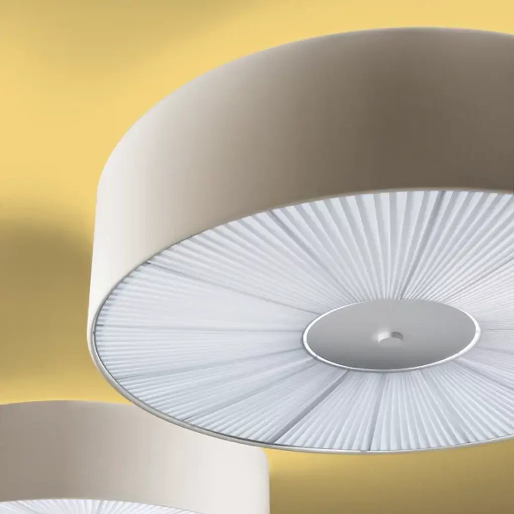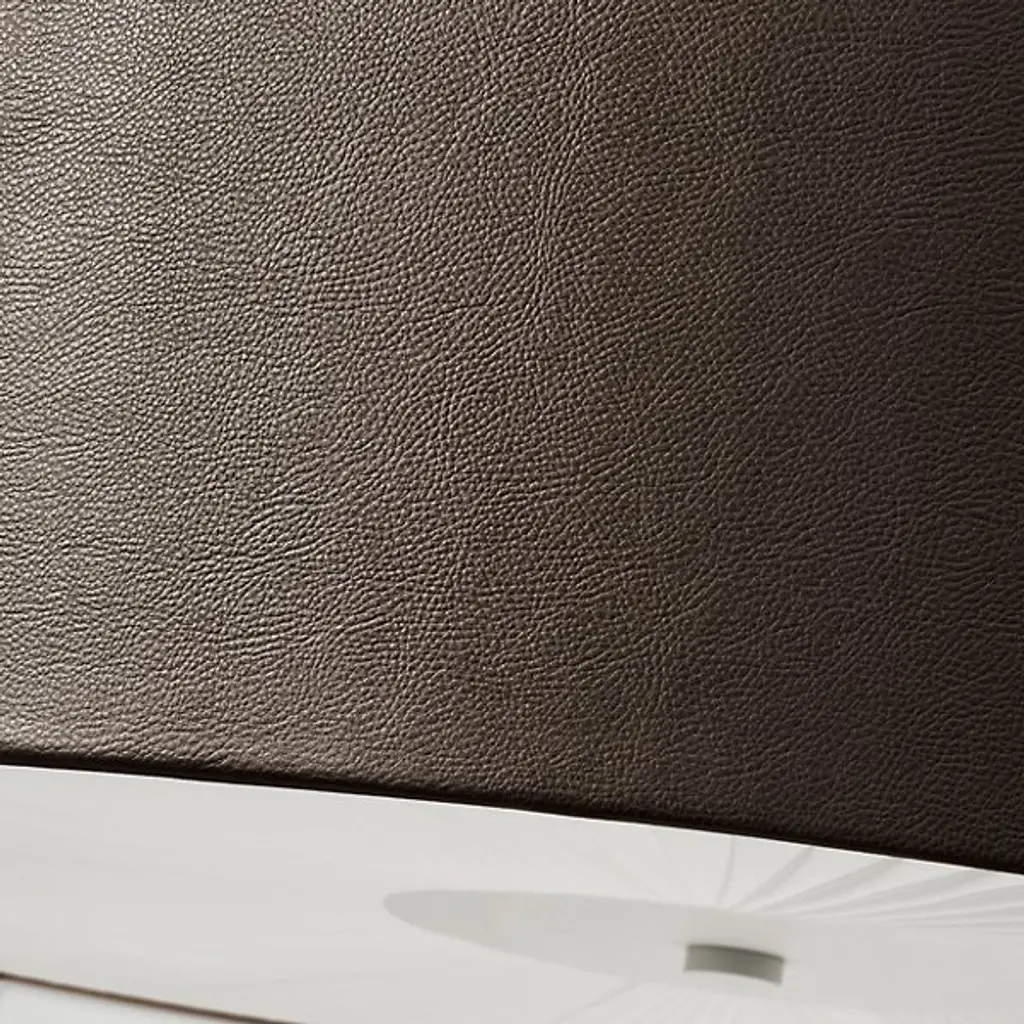 The Axolight Skin Flushmount fits contemporary interiors like a glove. It features a large eco-leather shade, its realistic pebbly texture complemented by the smooth strips of ponge fabric that comprise the diffuser. A thin halo of light peeks around the top of the shade, while the diffuser creates a textural, even wash of downlight.