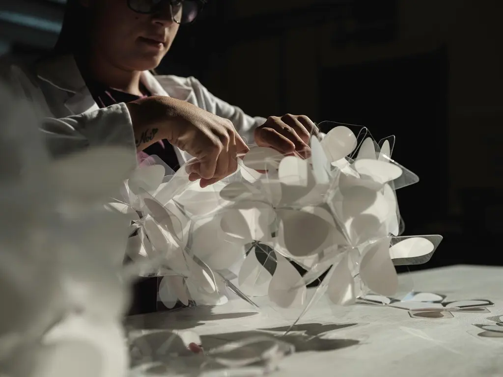 Clizia Mama Non Mama is an ode to joy, femininity, primordial love, and pure emotion. Once illuminated, the lamp’s delicate details create plays of light that together cast a positive aura. Handcrafted from interlocking Cristalflex petals, all three sizes have a magnetic system. The light, delicate petals bring a soft breeze of balanced allure into any interior.Size: Ø 32 cm x 15 cm / 12-1/2” x 5-3/4”Colors: Mama non mamaMaterials: CristalflexWith: Magnetic SystemLight source: Bulbs E14: 2 x 6W LED Filament.