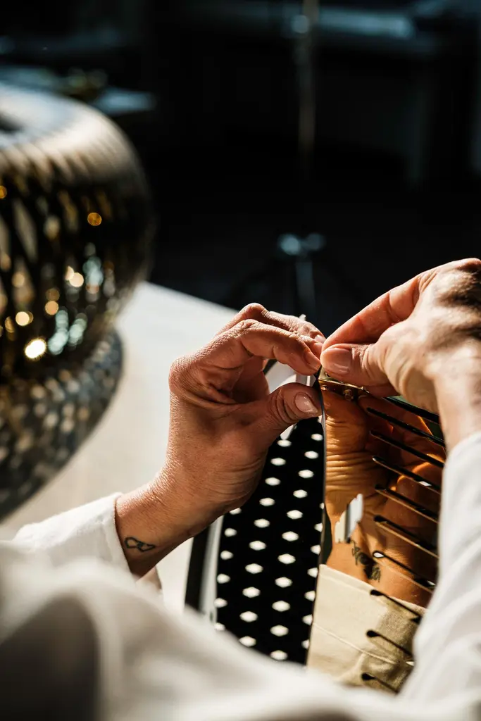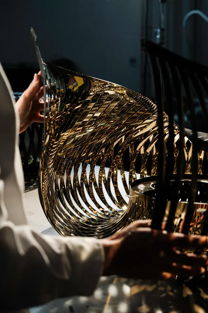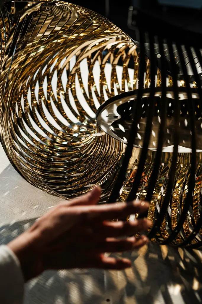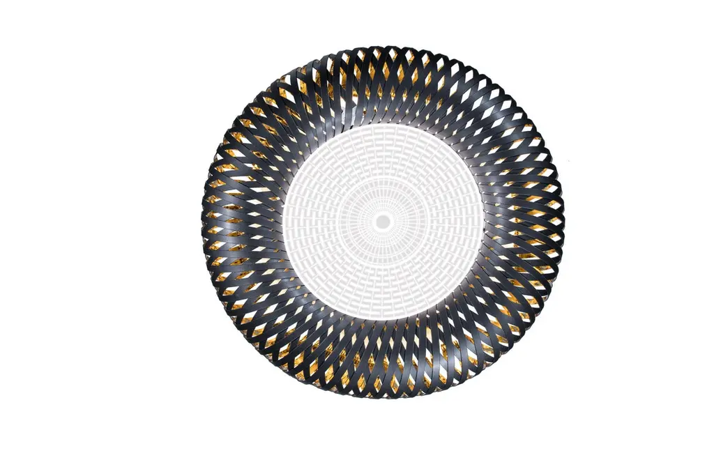 Inspired by the art of weaving, part of humanity from prehistoric times in the form of baskets and cane sacks, Kalatos revisits these archetypes with a modern take using Slamp’s advanced technopolymers; the collection has both suspension and ceiling versions. They come in two color combinations: matte black with an internal gold finish, or white with transparent Lentiflex.Size: Ø 63 cm x H 30 cm / Ø 24-1/2” x H 11-3/4”Available colors: Prisma and black/goldAvailable materials: Metalized polycarbonate or Lentiflex / polycarbonateWith: Magnetic systemLight source: 4 x 12W LED filament.