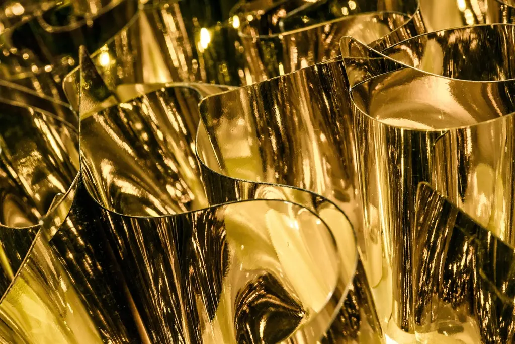 Inspired by the high fashion world, where folds, pleats and soft structural shapes reign, Veli is a sophisticated, glamorous collection featuring a series of handcrafted elements carefully connected in a sinuous, elegant design, mounted on a magnetic system. Veli’s varying colors and forms add value to any interior. E27 lighting. Made with Goldflex.This item is compatible only in the United States and Canada. For customers located outside of these regions, please inquire for availability in your area. Also available in other variations on 1stdibs including size, color, and material. Please inquire for more information on those variations.Size:Ø53 x h. 20 cmColors: GoldMaterials: Goldflex®Lighting: 2 X 12W E27 LED Filament BulbsWeight: kg 1,25Dimmerabile: dimmable bulbs needed, depending on wall dimmer