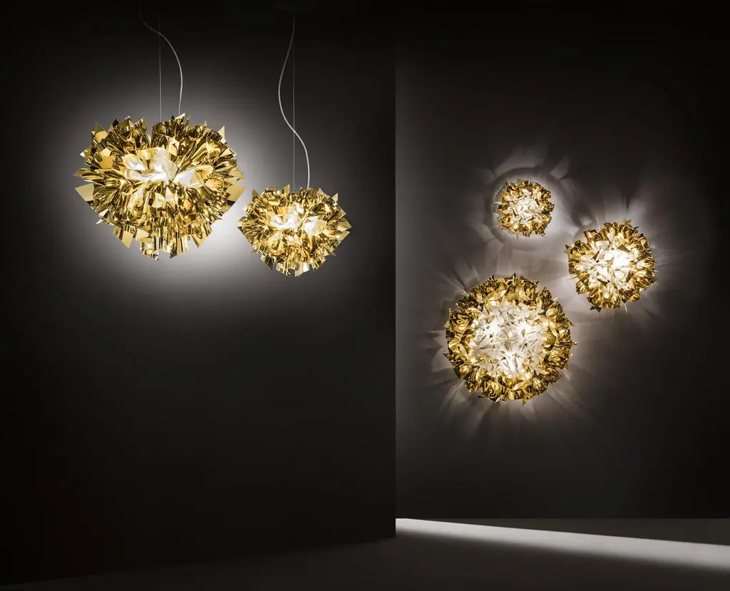 Inspired by the high fashion world, where folds, pleats and soft structural shapes reign, Veli is a sophisticated, glamorous collection featuring a series of handcrafted elements carefully connected in a sinuous, elegant design, mounted on a magnetic system. Veli’s varying colors and forms add value to any interior. E14 lighting. Made with Goldflex.This item is compatible only in the United States and Canada. For customers located outside of these regions, please inquire for availability in your area. Also available in other variations on 1stdibs including size, color, and material. Please inquire for more information on those variations.Size: Ø32 x h. 15 cmColors: GoldMaterials: Goldflex® Lighting: 2 X 6W E14 LED Filament BulbsWeight: kg 0,61Dimmerabile: dimmable bulbs needed, depending on wall dimmer