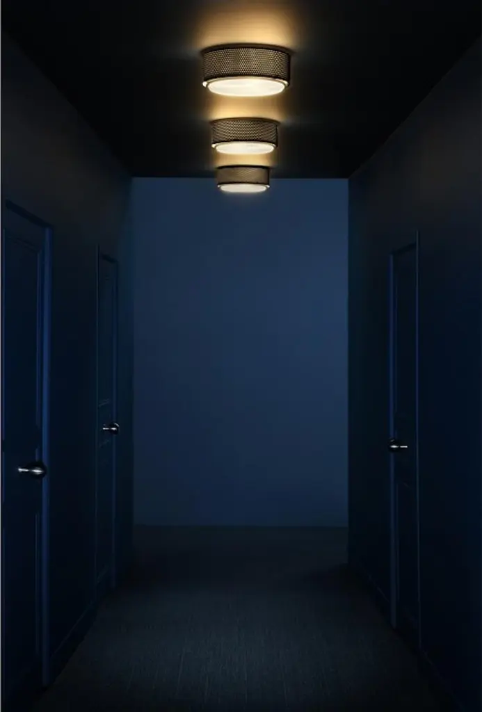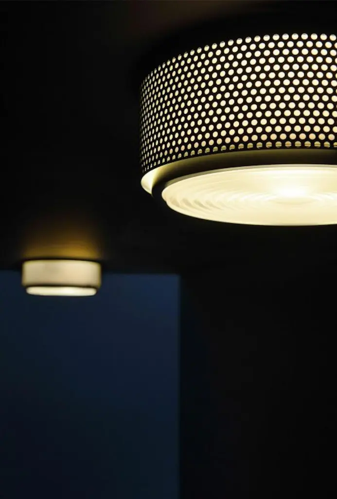 Small Model G13 flush mount wall/ceiling light by Pierre Guariche. Originally designed in 1952, this current edition is made in France by Sammode Studio. Black perforated metal base, authentic Fresnel glass lens. Wired for U.S. standards The G13 is available in 3 sizes (small, medium and large) and 3 finishes black, white and grey, and can be used alone or as a series to create as many compositions as desired. Manufactured, assembled and packaged at the Châtillon-sur-Saône production plant in the Vosges region of France. Manufacturer recommends Power max 11W LED dimmable bulb. Bulbs not provided.