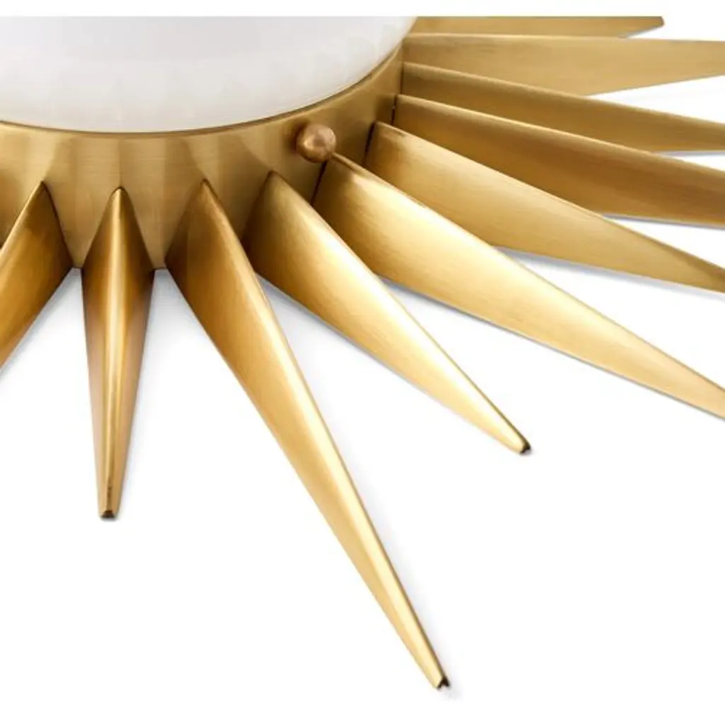 Designed by us and available only at One Kings Lane: This midcentury-inspired flush mount features an impressive steel body in a classic sunburst design. An antiqued brass finish completes the look and adds to this fixture's eye-catching appeal. Hardwired.