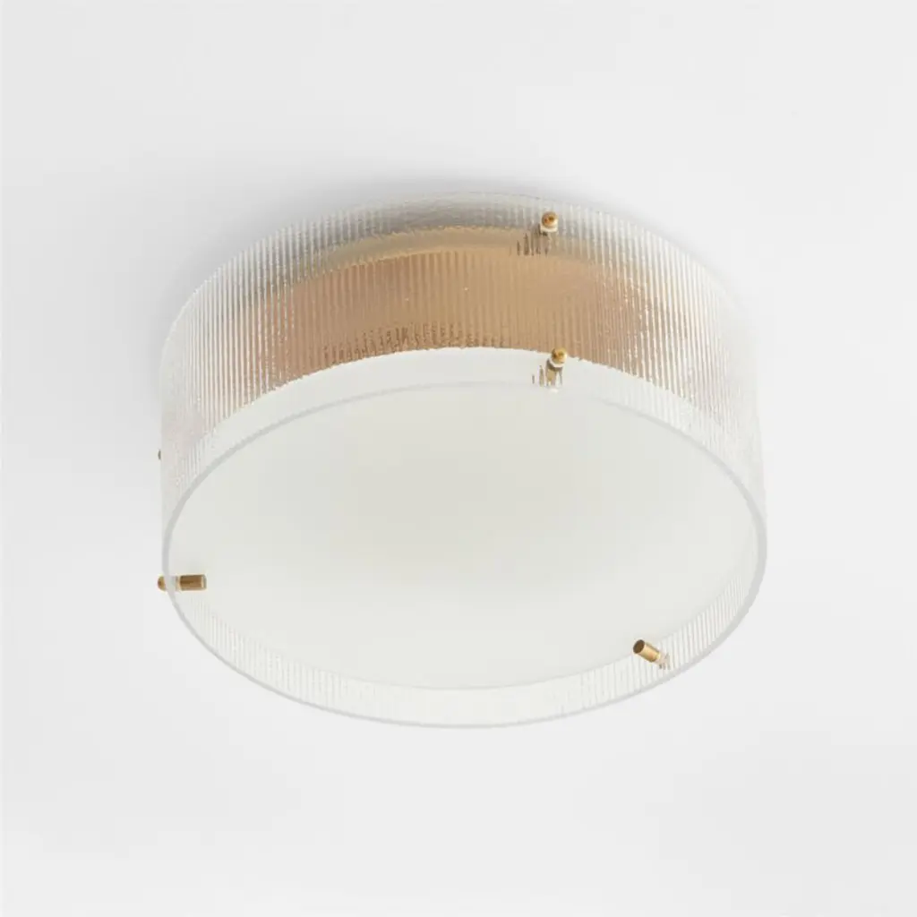 A modern take on classic Art Deco style, our Soleil flush mount casts an ambient glow with sparkling glass and gleaming brass. A round base with a burnished brass finish supports a cylindrical shade of clear fluted glass with a frosted glass diffuser to soften the glow. Install the Soleil flush mount light in a closet or entryway or in multiples down a hallway to light the way.