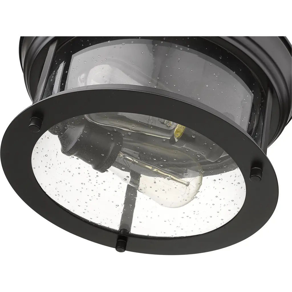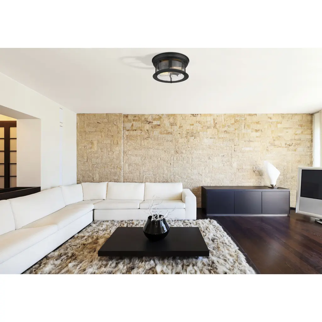 Cool industrial ambiance offers a stylish look to transitional spaces in need of functional, fashionable fixtures. With beautiful Bronze finish metal providing a circular cage-like frame and a wide cylindrical clear seedy glass shade completing its visual package, this two-light flush mount ceiling light wraps up a custom kitchen or living area design.