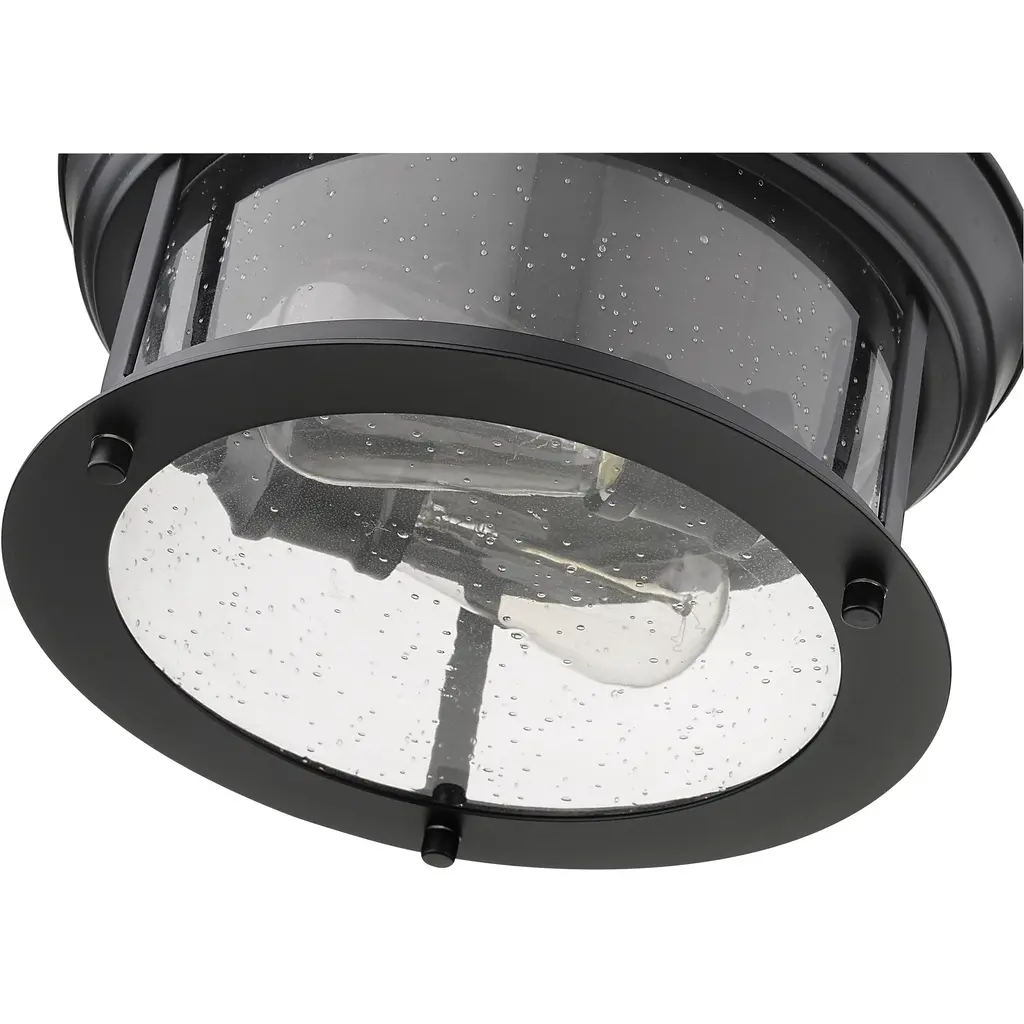 Cool industrial ambiance offers a stylish look to transitional spaces in need of functional, fashionable fixtures. With bold Matte Black finish metal providing a circular cage-like frame and a wide cylindrical clear seedy glass shade completing its visual package, this two-light flush mount ceiling light wraps up a custom kitchen or living area design.
