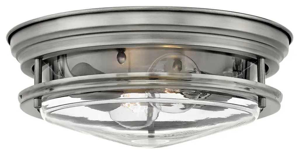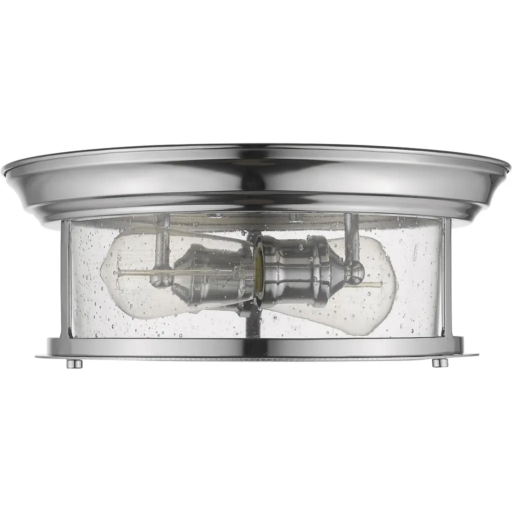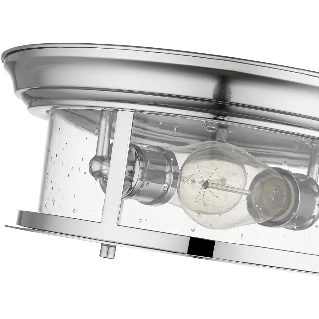 Cool industrial ambiance offers a stylish look to transitional spaces in need of functional, fashionable fixtures. With brilliant Chrome finish metal providing a circular cage-like frame and a wide cylindrical clear seedy glass shade completing its visual package, this two-light flush mount ceiling light offers a focal point in a redesigned space devoted to carefree living.