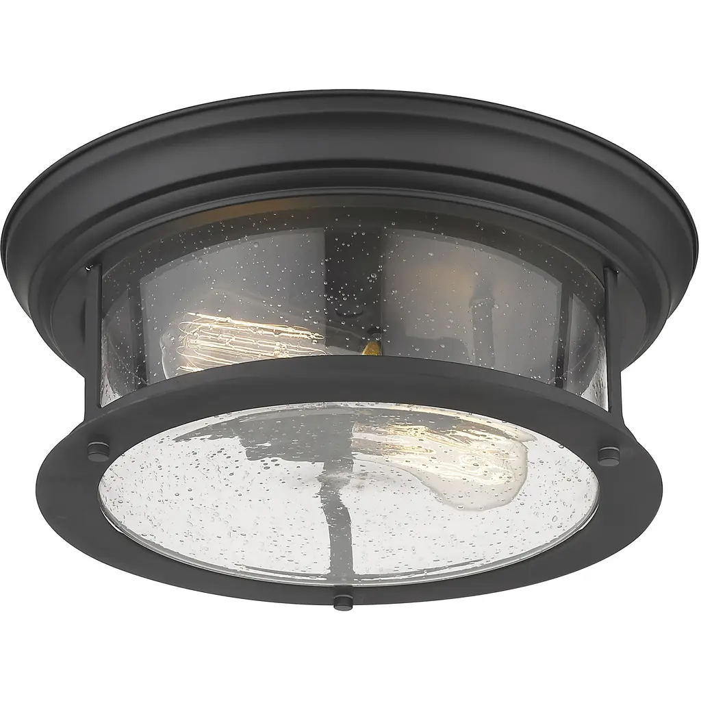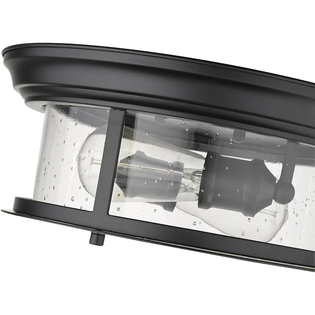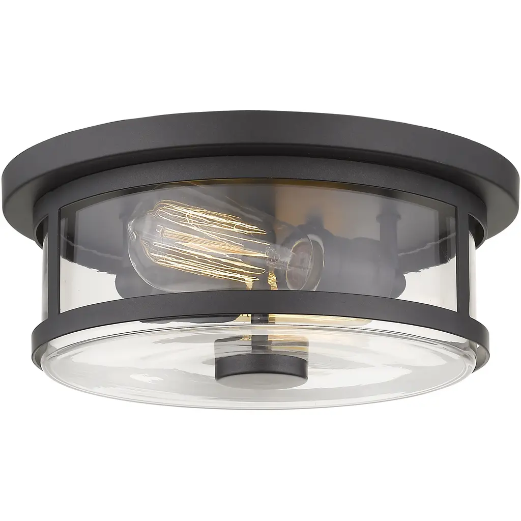 Cool industrial ambiance offers a stylish look to transitional spaces in need of functional, fashionable fixtures. With bold Matte Black finish metal providing a circular cage-like frame and a wide cylindrical clear seedy glass shade completing its visual package, this two-light flush mount ceiling light offers a focal point in a redesigned space devoted to carefree living.