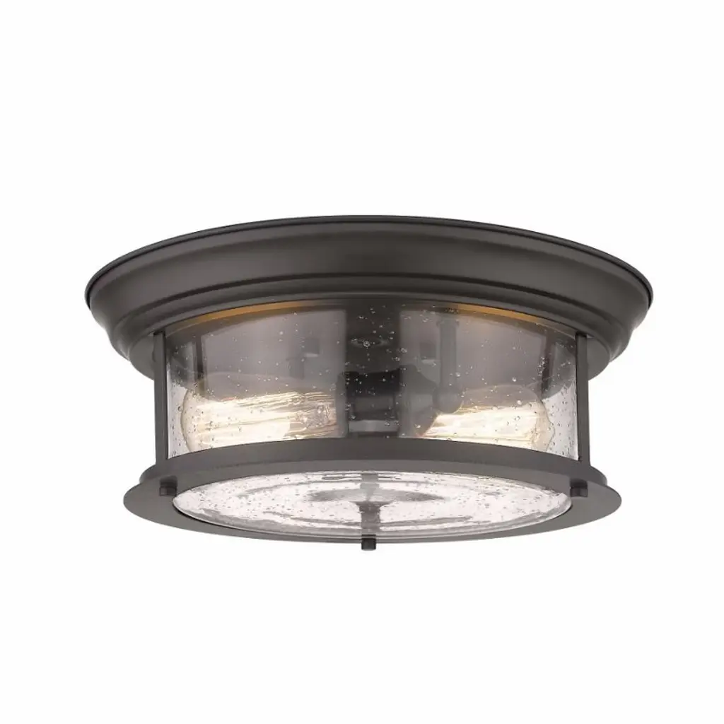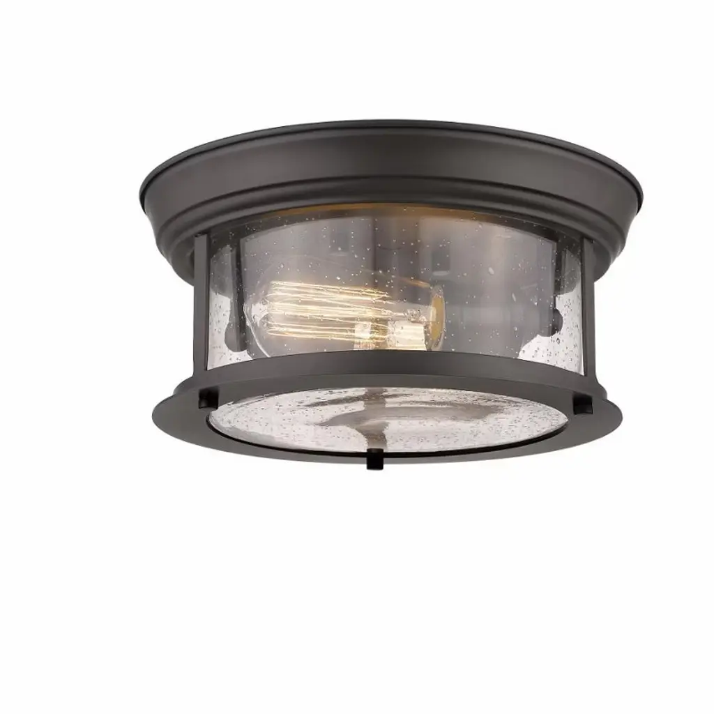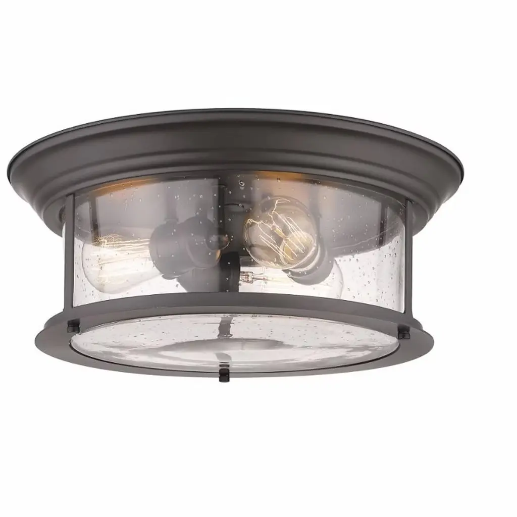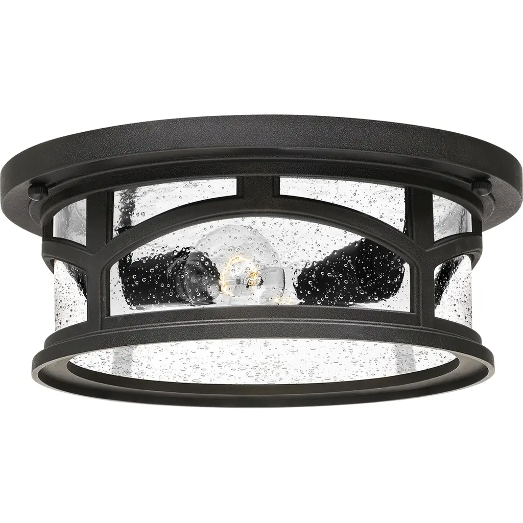 Cool industrial ambiance offers a stylish look to transitional spaces in need of functional, fashionable fixtures. With bold Matte Black finish metal providing a circular cage-like frame and a wide cylindrical clear seedy glass shade completing its visual package, this two-light flush mount ceiling light offers a focal point in a redesigned space devoted to carefree living.