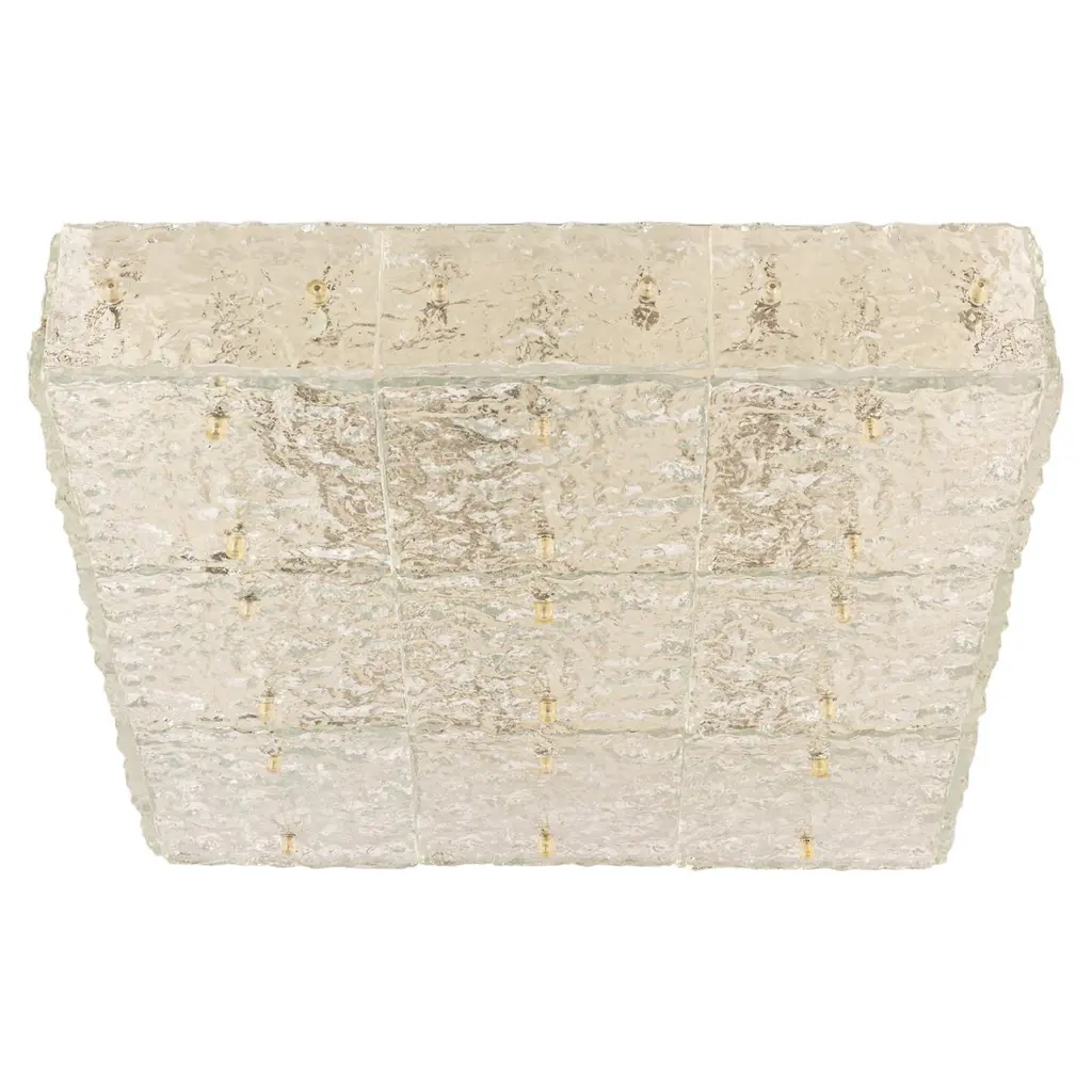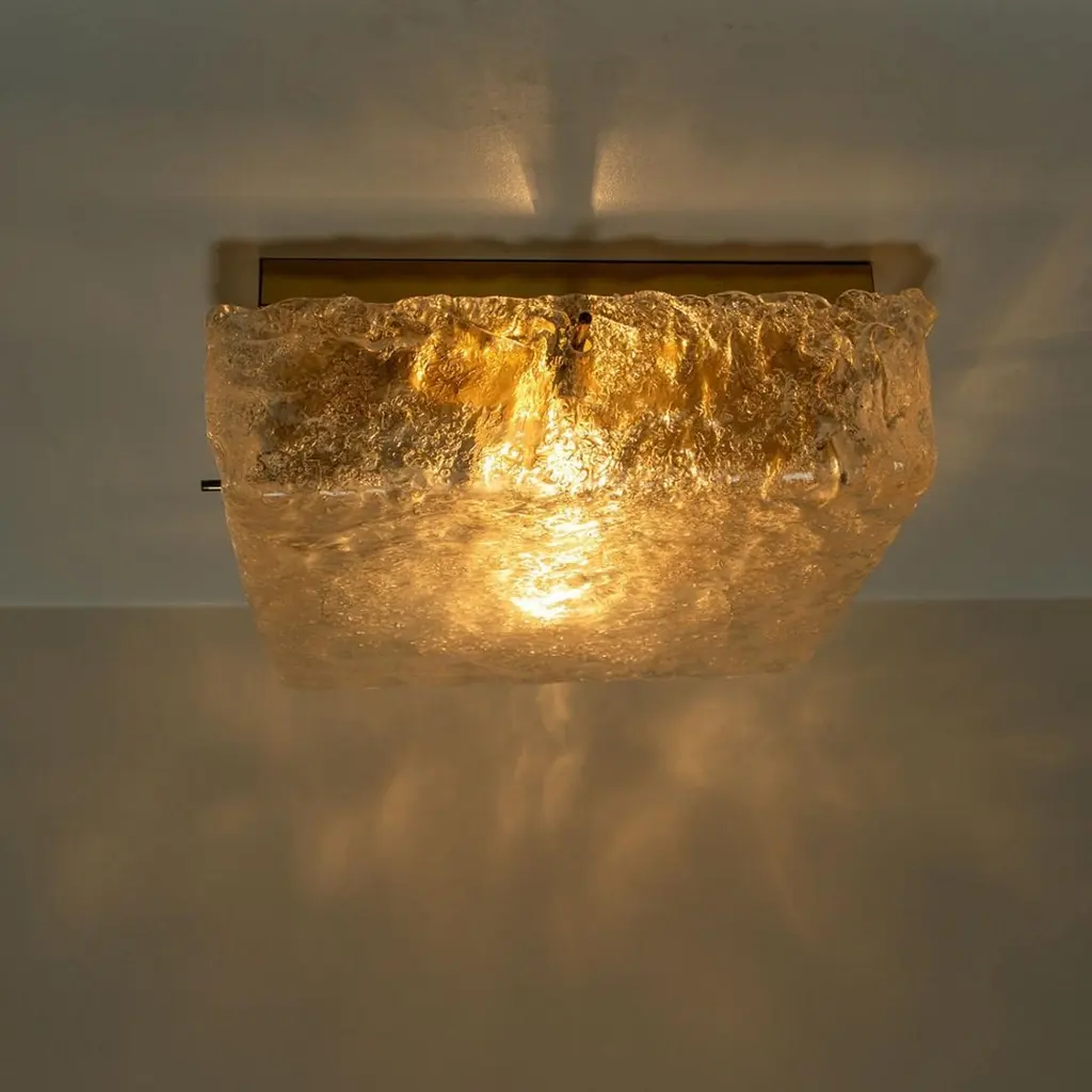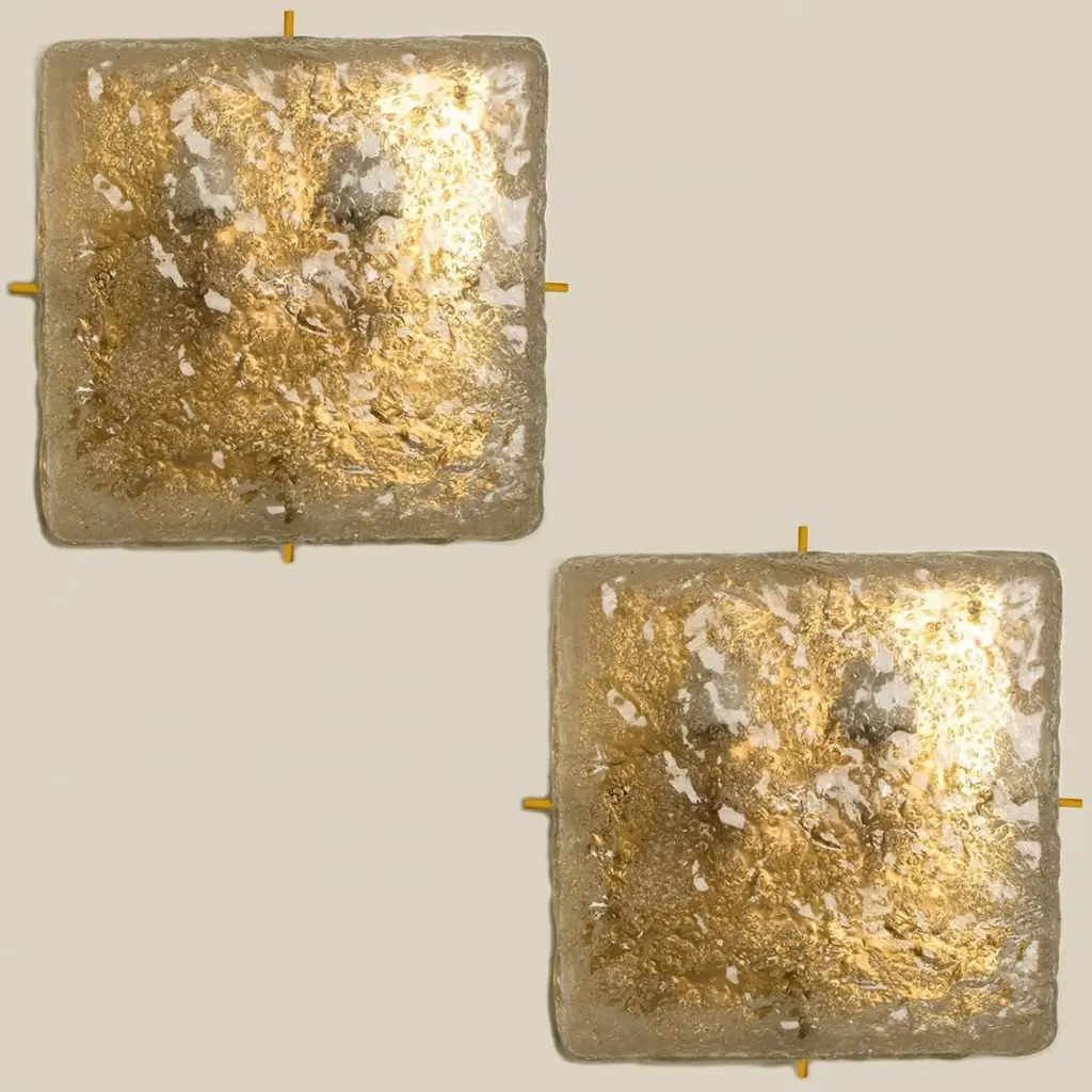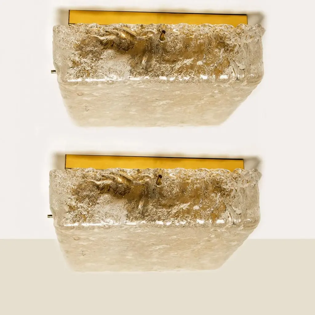 Square shaped flush mounts lights in clear glass with brass details. Manufactured by Glashütte Limburg in Germany during the 1970s.Nice craftsmanship. Minimal and simply shaped design. The glass has small air bubbles in it, what gives a nice diffuse light effect and a nice pattern on ceiling, walls and floor.Can work also as impressive wall light.Please note the price is for one piece. We have two lights available.Cleaned, well-wired and ready to use.