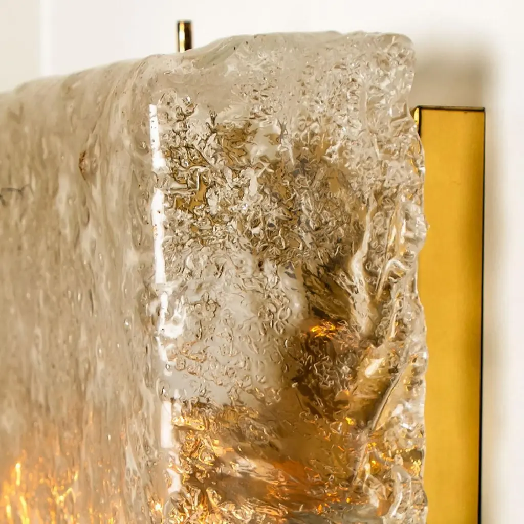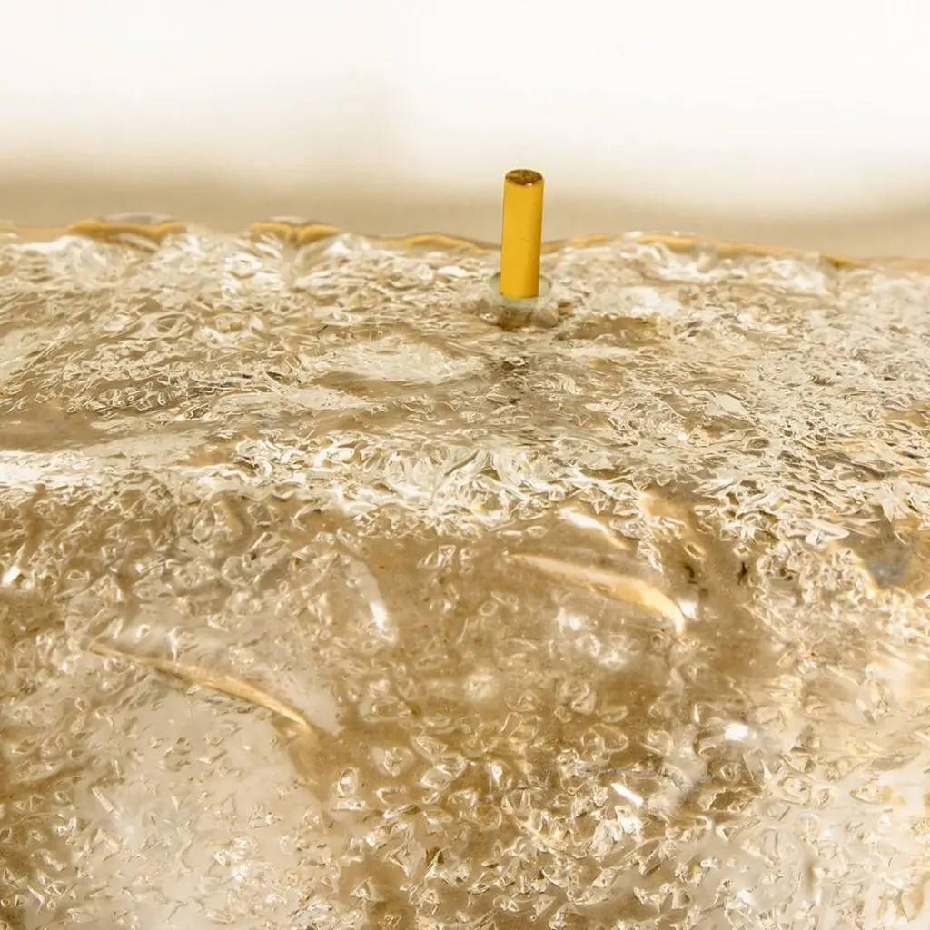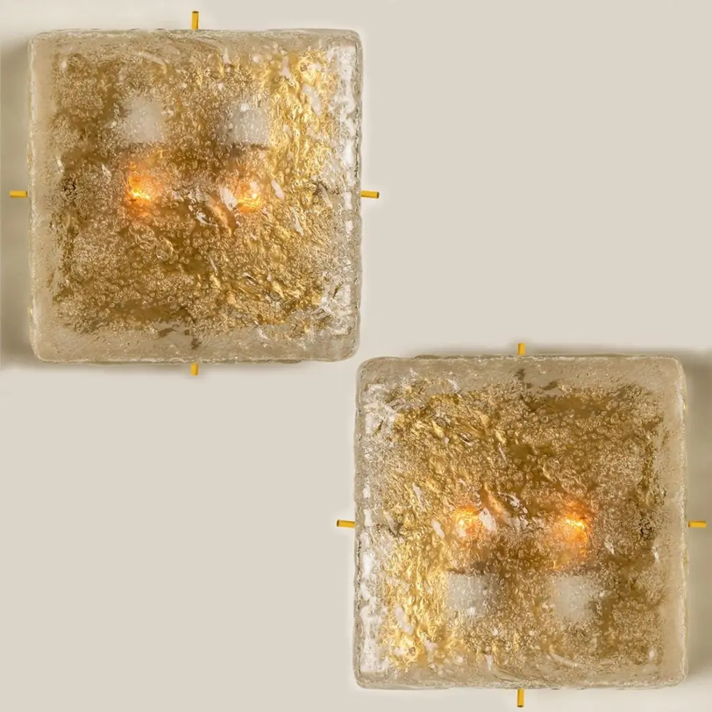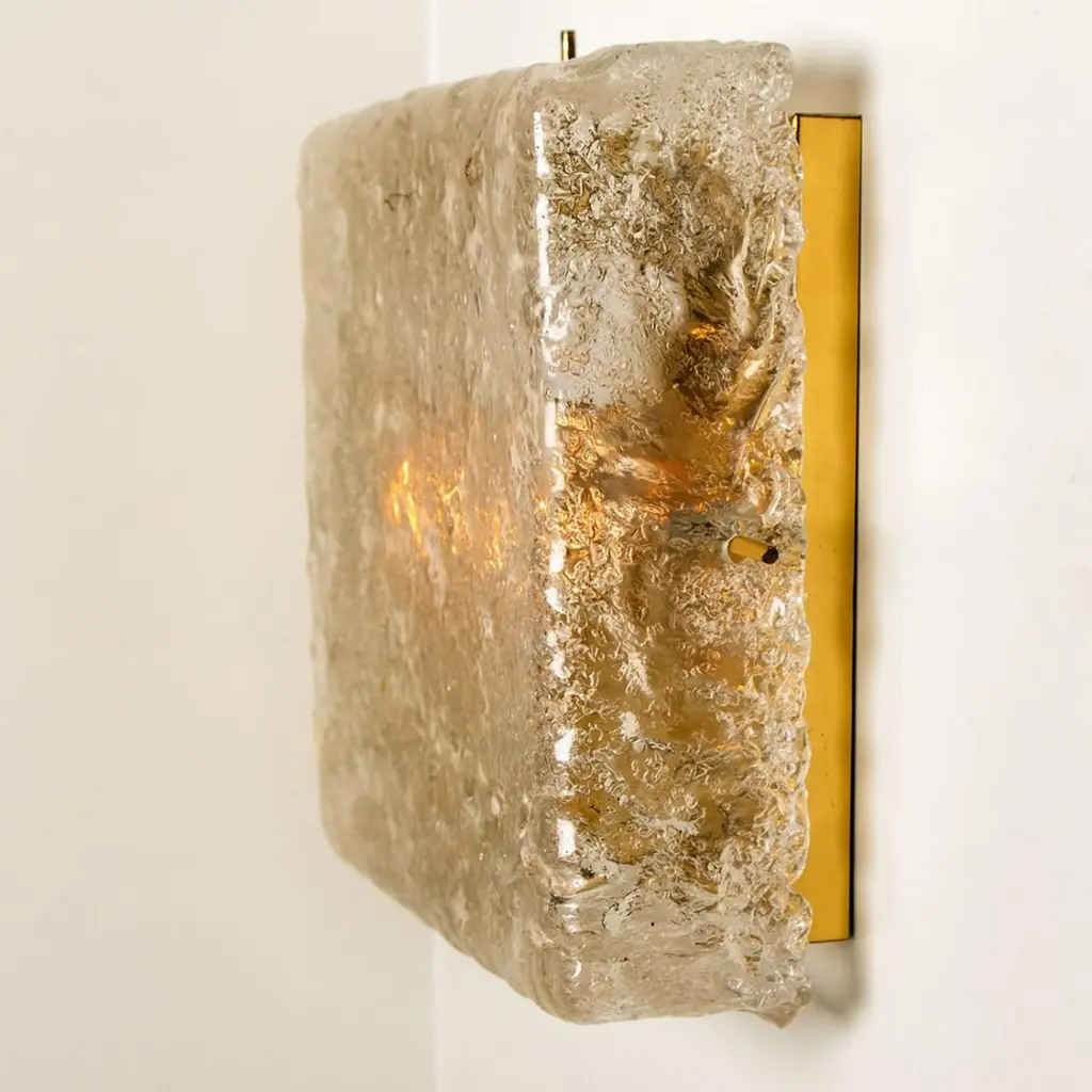 Square shaped flush mounts lights in clear glass with brass details. Manufactured by Glashütte Limburg in Germany during the 1970s.Nice craftsmanship. Minimal and simply shaped design. The glass has small air bubbles in it, what gives a nice diffuse light effect and a nice pattern on ceiling, walls and floor.Can work also as impressive wall light.Please note the price is for one piece. We have two lights available.Cleaned, well-wired and ready to use.