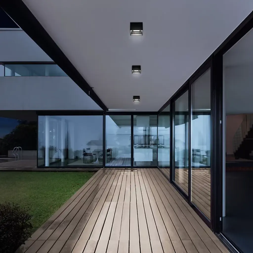 The Squat LED Outdoor Flushmount from Modern Forms offers an arresting and tasteful minimalist character well-suited to covered outdoor areas like porches, patios, or outdoor entryways. A boxy housing fashioned from robust aluminum descends from its mounting surface, incorporating a temperature-adjustable and efficient LED lamp at its center. A glass diffuser with a beveled rim retention is inset into the housing, dispensing a mix of focused downlight and outward-radiating, even ambiance.