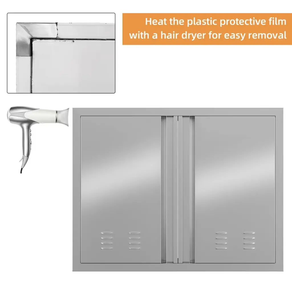 TROPOW Commercial-Grade Stainless Steel BBQ Door - 42"W x 21"H with Recessed Handle (Silver)¡ï¡ï¡ï¡ï¡ï PROFESSIONAL OUTDOOR KITCHEN SOLUTION1. INDUSTRY-LEADING DURABLE CONSTRUCTIONHeavy-duty 304 stainless steel (2mm thickness)Extra-wide 42" design for full equipment accessMarine-grade corrosion resistance400¡ãF+ heat resistant for intense grilling2. CHEF-APPROVED FUNCTIONAL DESIGNDeep recessed handle (2" grip clearance)Dual magnetic closure system (7-lb pull)Integrated ventilation slots for airflowScratch-resistant brushed finish (No.4)3. EFFORTLESS 15-MINUTE INSTALLATIONPrecisely pre-drilled holes for perfect alignmentTrue flush mount (1/4" reveal)Includes all stainless steel hardwareFits standard 42"W x 21"H openings4. PREMIUM OUTDOOR PERFORMANCESelf-adjusting stainless hingesEasy wipe-clean surfaceRounded safety edges (3/4" radius)Thermal-stable construction5. VERSATILE LUXURY UPGRADEPerfect for: ? Professional outdoor kitchens ? Commercial BBQ stations ? Poolside bar cabinets ? Pizza oven enclosures ? RV kitchen makeovers?? TECHNICAL SPECIFICATIONS? Dimensions: 42"W ¡Á 21"H ¡Á 0.75"D? Material: 304 Stainless Steel (Type 18-8)? Finish: Brushed Silver (180-grit)? Weight Capacity: 80 lbs? Weather Rating: IP54