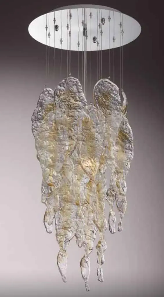 Italian flush mount shown with amber and clear Murano glasses hand blown to form beautiful dangling stalactite shaped glasses, mounted on round stainless steel ceiling plate / inspired by Mazzega / Made in Italy3 lights / E26 or E27 type / max 60W eachMeasures: Diameter 16 inches / height 37.5 inches plus cable and ceiling plateOrder only / This item ships from ItalyOrder reference #: FABIOLTD C799