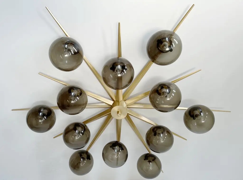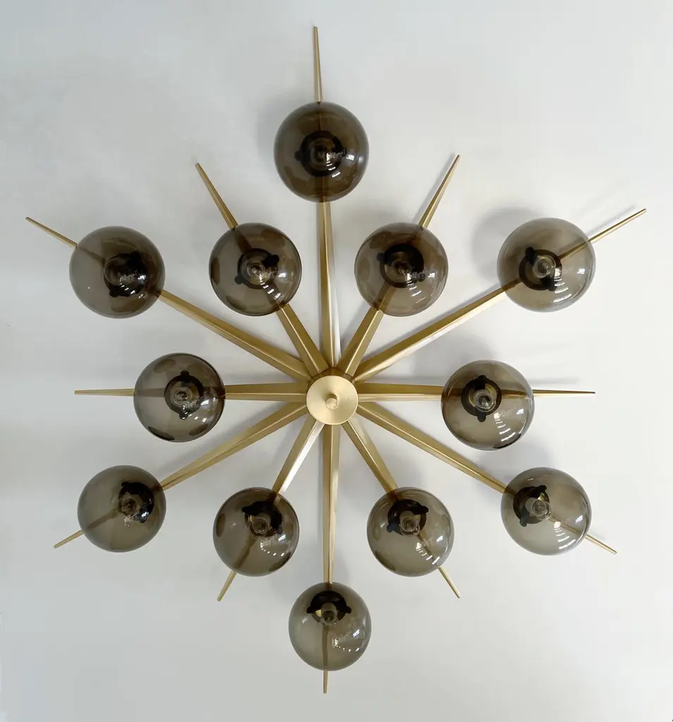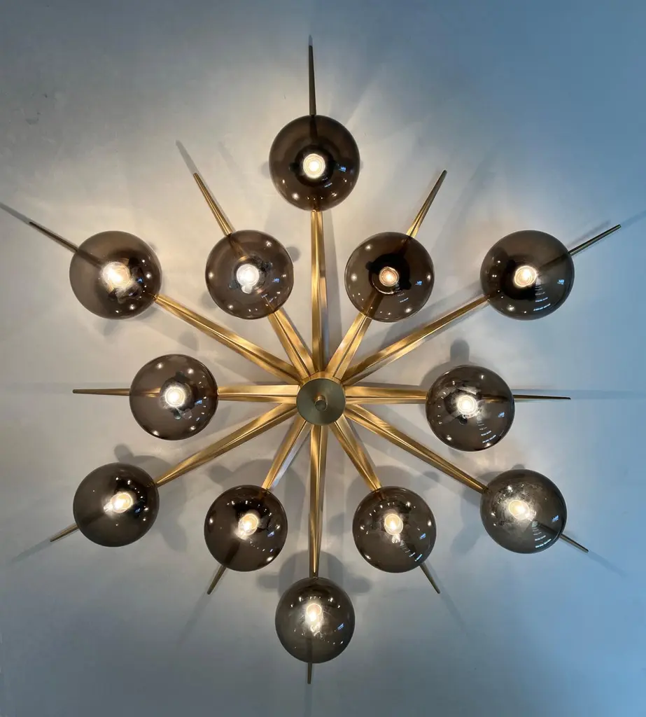 Italian flush mount with 12 large Murano glass globes mounted on brass frame / Made in Italy12 lights / E12 or E14 type / max 40W eachDiameter: 64 inches / Height: 14 inchesOrder Only / This item ships from ItalyPlease inquire for custom options / pricing / current lead timesOrder Reference #: FABIOLTD STAR FLUSH MOUNTThe listed price applies to all Brass finishes : Unlacquered Natural Brass, Unlacquered Polished Brass, Lacquered Polished Brass, Lacquered Satin BrassOther finishes available with upcharge of $600: Bronzed, Polished Chrome, Satin Chrome, Polished Nickel, Satin Nickel, Polished Black Nickel, Satin Black Nickel, Polished Copper, Satin Copper