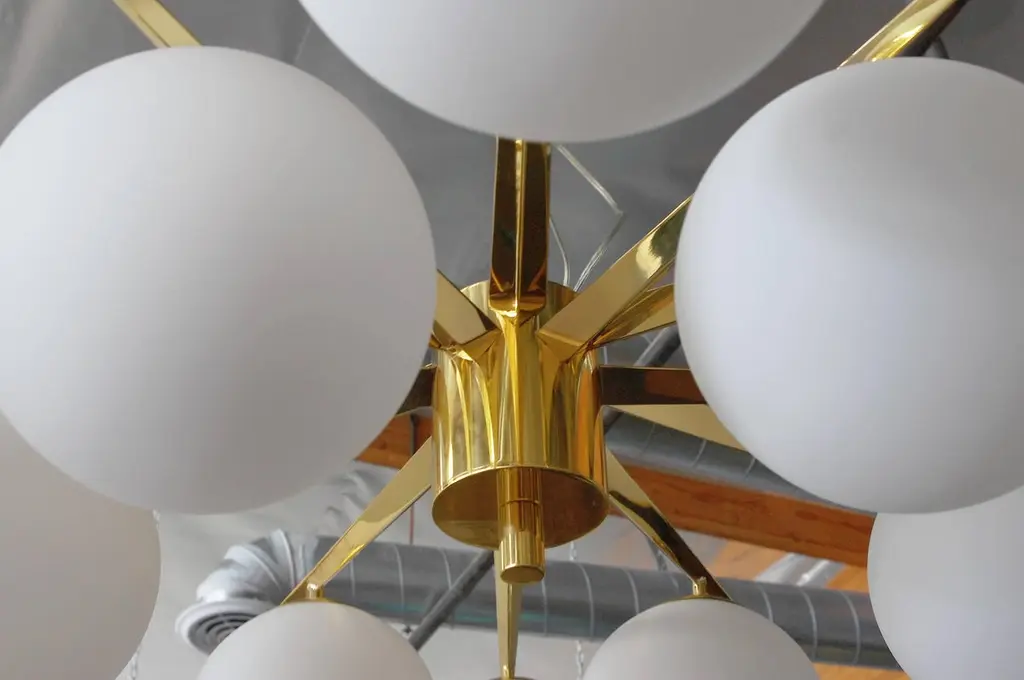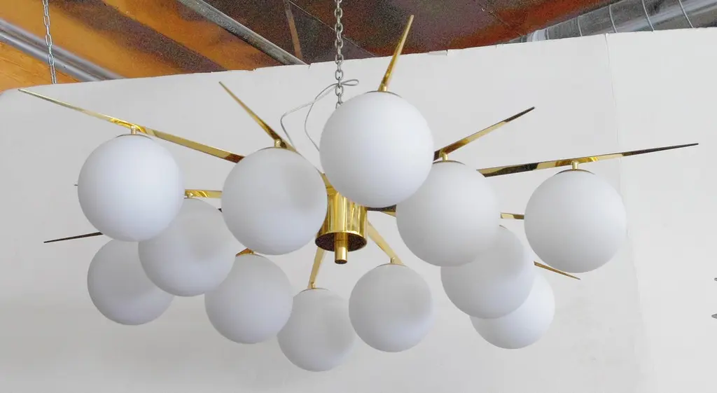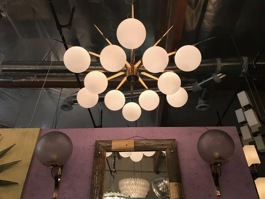 Italian flush mount with 12 large Murano glass globes mounted on brass frame / Made in Italy12 lights / E12 or E14 type / max 40W eachDiameter: 64 inches / Height: 14 inchesOrder Only / This item ships from ItalyPlease inquire for custom options / pricing / current lead timesOrder Reference #: FABIOLTD STAR FLUSH MOUNTThe listed price applies to all Brass finishes : Unlacquered Natural Brass, Unlacquered Polished Brass, Lacquered Polished Brass, Lacquered Satin BrassOther finishes available with upcharge of $600: Bronzed, Polished Chrome, Satin Chrome, Polished Nickel, Satin Nickel, Polished Black Nickel, Satin Black Nickel, Polished Copper, Satin Copper