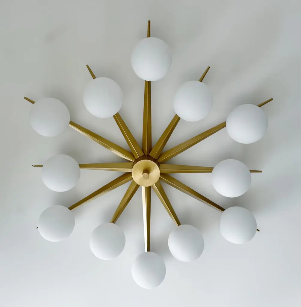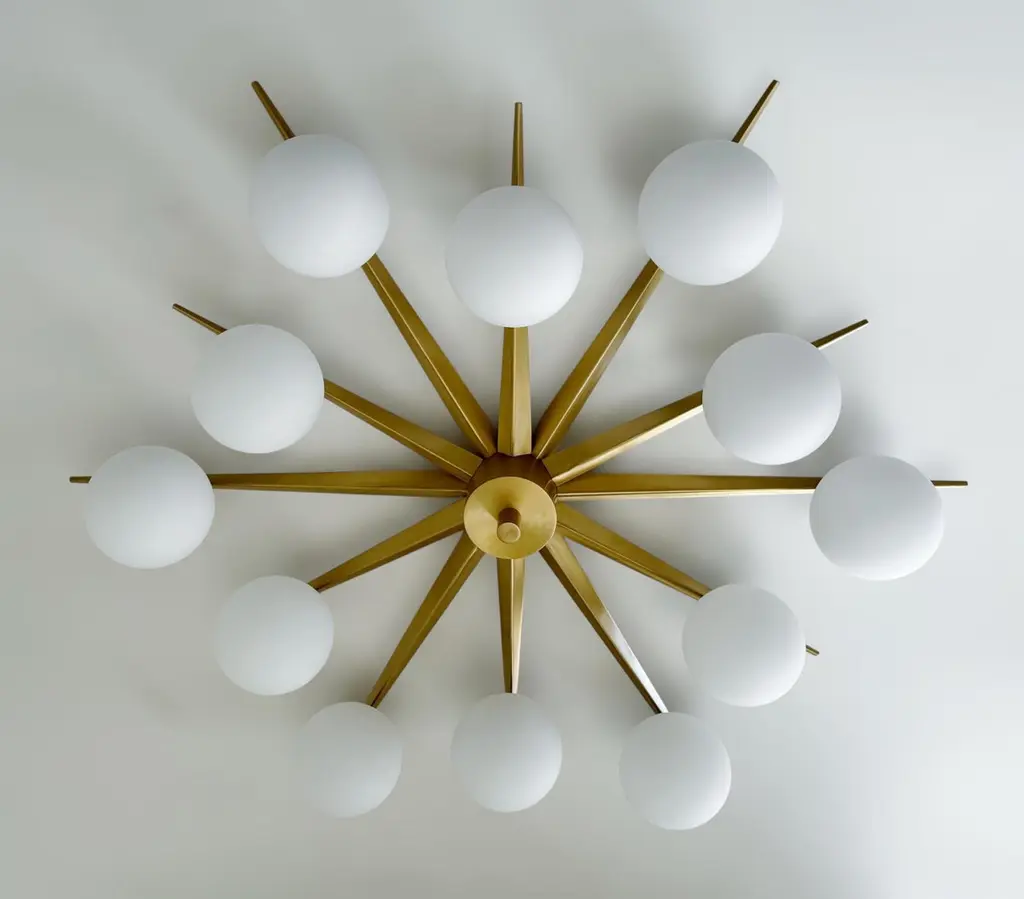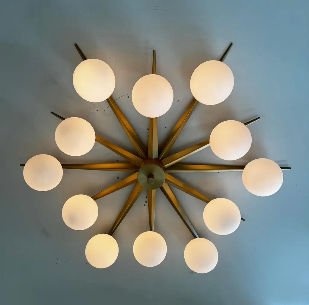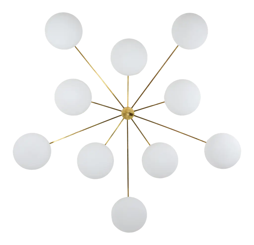 Italian flush mount with 12 matte white Murano glass globes mounted on solid brass frame in satin brass finish / Made in Italy12 lights / E12 or E14 type / max 40W eachDiameter: 47 inches / Height: 12 inchesOrder Only / This item ships from ItalyPlease inquire for custom options / pricing / current lead timesOrder Reference #: FABIOLTD STAR PICCOLO FLUSH MOUNTThe listed price applies to all Brass finishes : Unlacquered Natural Brass, Unlacquered Polished Brass, Lacquered Polished Brass, Lacquered Satin BrassOther finishes available with upcharge of $600: Bronzed, Polished Chrome, Satin Chrome, Polished Nickel, Satin Nickel, Polished Black Nickel, Satin Black Nickel, Polished Copper, Satin Copper