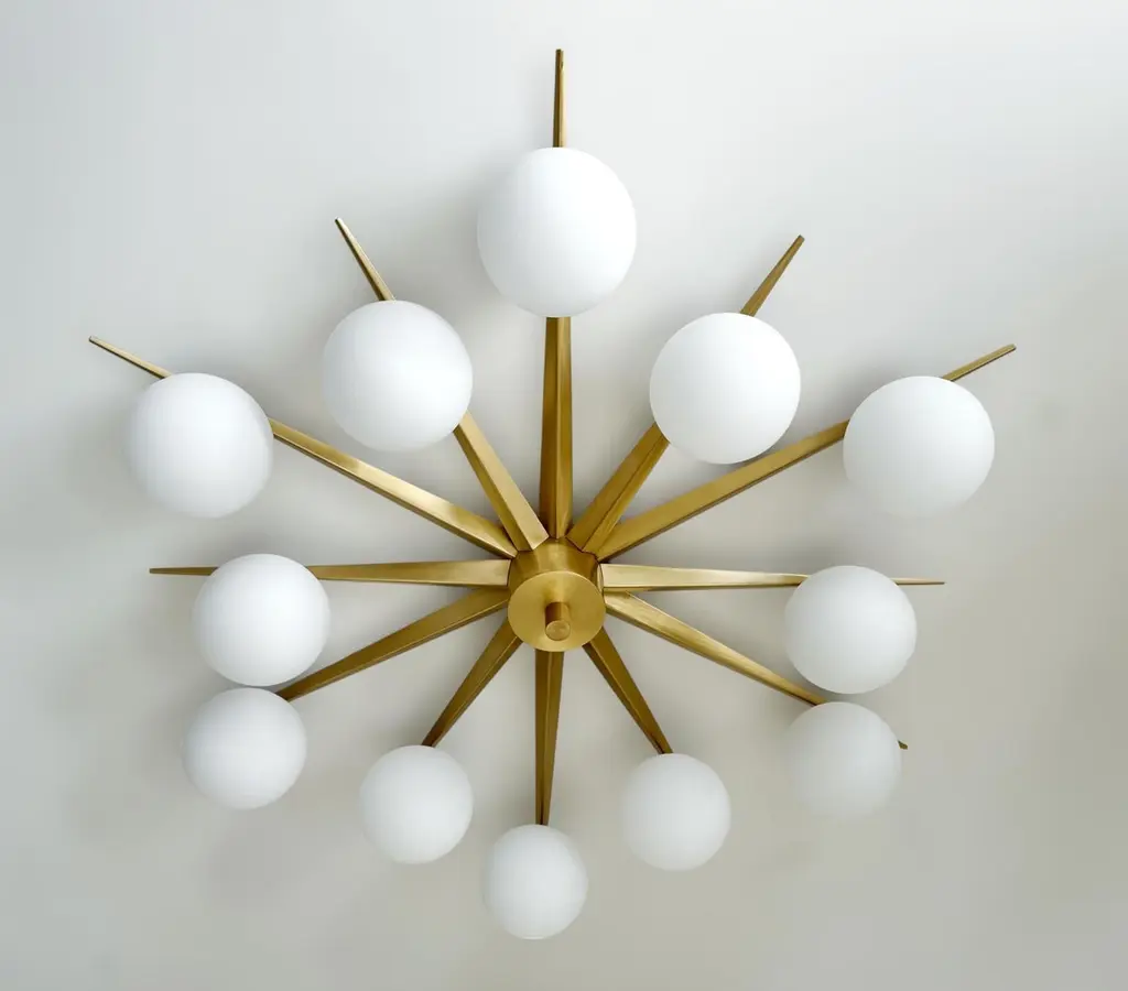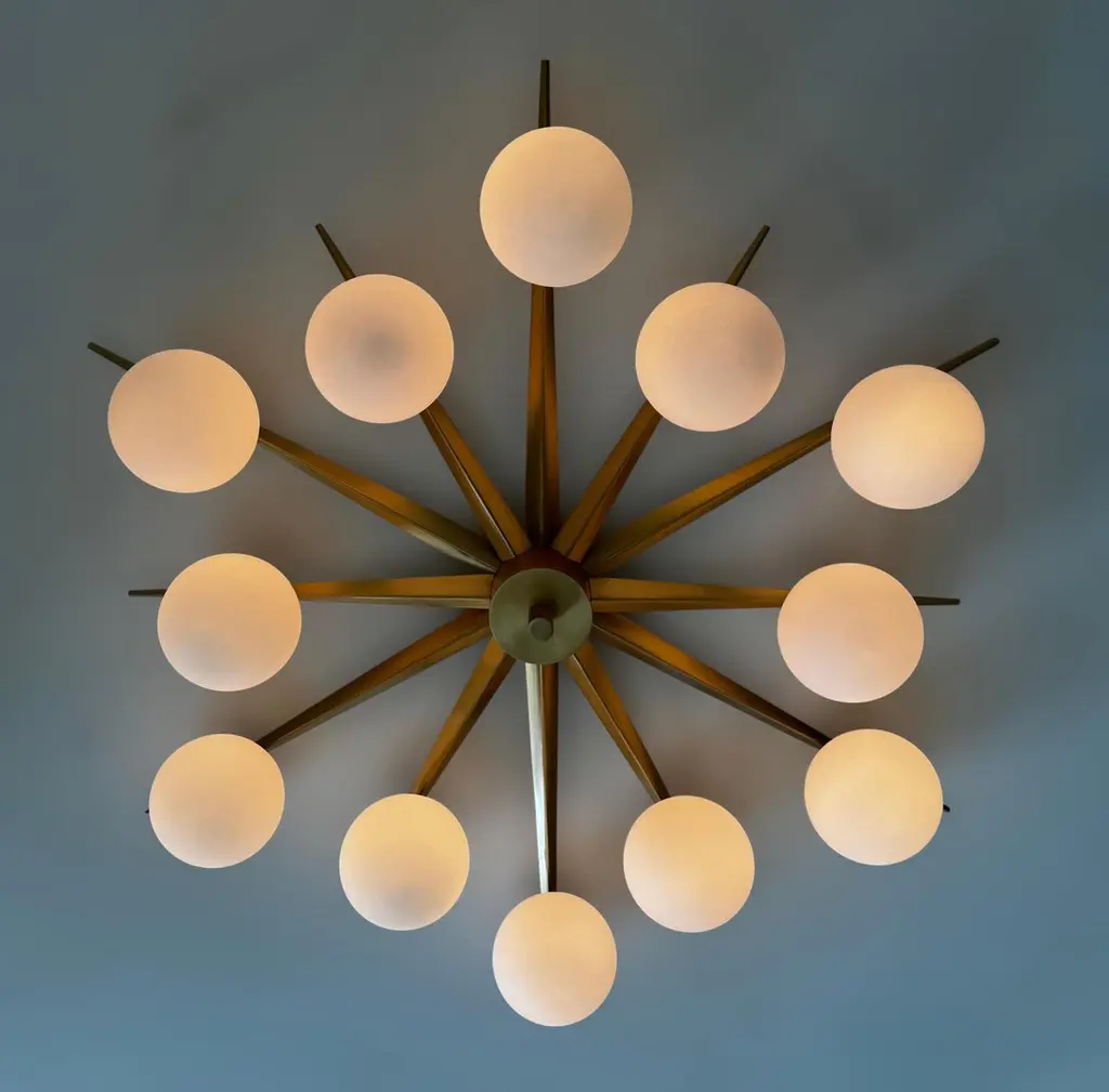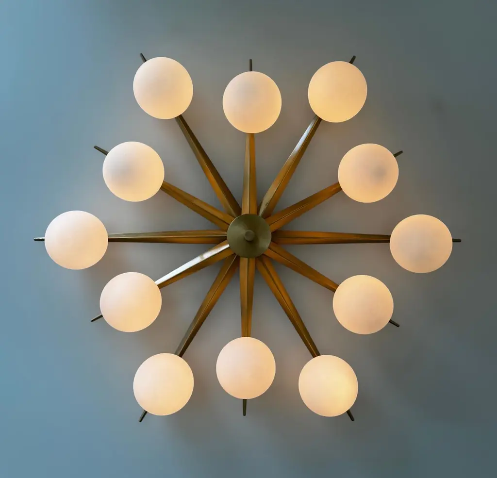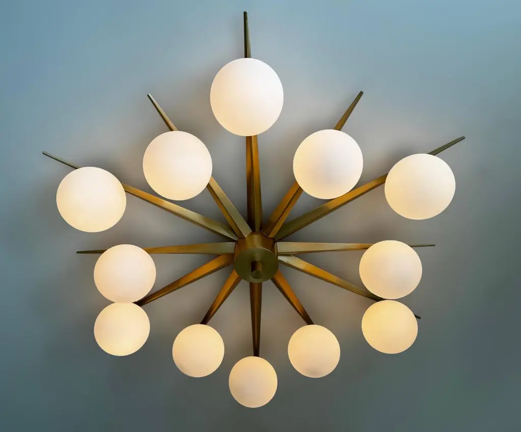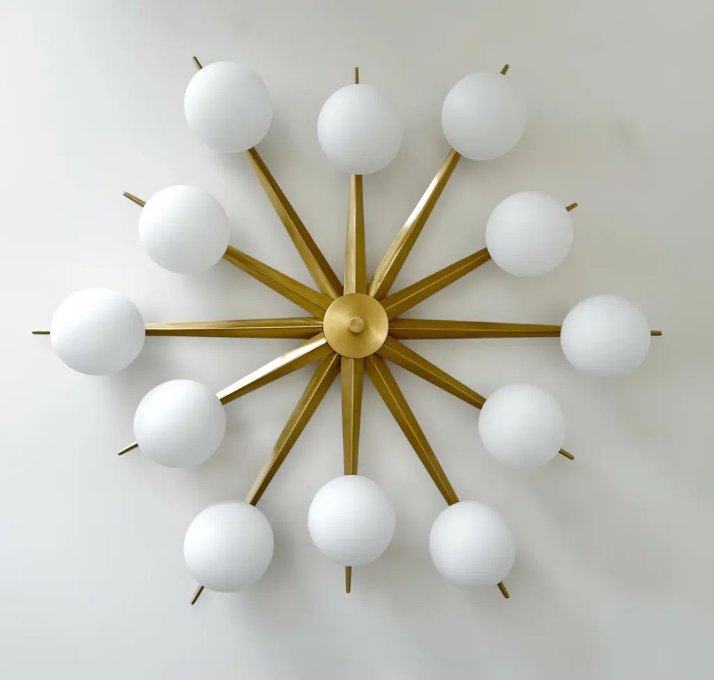Italian flush mount with 12 matte white Murano glass globes mounted on solid brass frame in satin brass finish / Made in Italy12 lights / E12 or E14 type / max 40W eachDiameter: 47 inches / Height: 12 inchesOrder Only / This item ships from ItalyPlease inquire for custom options / pricing / current lead timesOrder Reference #: FABIOLTD STAR PICCOLO FLUSH MOUNTThe listed price applies to all Brass finishes : Unlacquered Natural Brass, Unlacquered Polished Brass, Lacquered Polished Brass, Lacquered Satin BrassOther finishes available with upcharge of $600: Bronzed, Polished Chrome, Satin Chrome, Polished Nickel, Satin Nickel, Polished Black Nickel, Satin Black Nickel, Polished Copper, Satin Copper