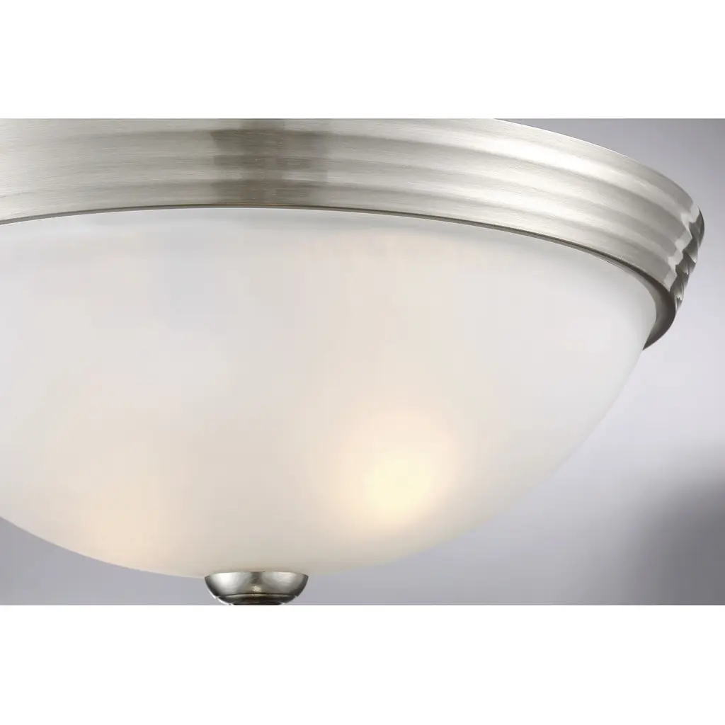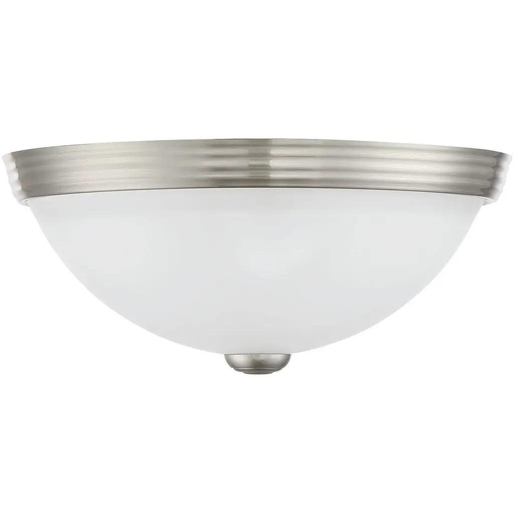 Use this versatile Savoy House 2-light ceiling flush mount to better illuminate any space. Its white etched glass shade ensures bright, comfortable light. satin nickel finish. Flush mounts can be used on the ceiling of pretty much any interior room, including foyers, hallways, stairways, closets, bathrooms, bedrooms, kitchens and more Bulbs not included. The satin nickel finish can be paired with nickel hardware or mixed with hardware in other finishes. This is a terrific ceiling lighting option for any style of room. When you choose a Savoy House lighting fixture, you can be certain you've selected a piece that will withstand the test of time.