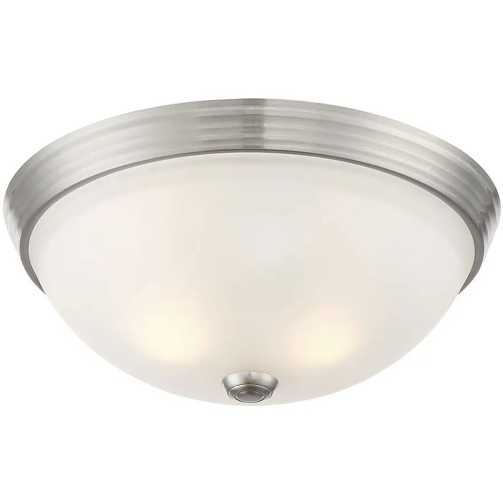 Use this versatile Savoy House 2-light ceiling flush mount to better illuminate any space. Its white etched glass shade ensures bright, comfortable light. satin nickel finish. Flush mounts can be used on the ceiling of pretty much any interior room, including foyers, hallways, stairways, closets, bathrooms, bedrooms, kitchens and more Bulbs not included. The satin nickel finish can be paired with nickel hardware or mixed with hardware in other finishes. This is a terrific ceiling lighting option for any style of room. When you choose a Savoy House lighting fixture, you can be certain you've selected a piece that will withstand the test of time.
