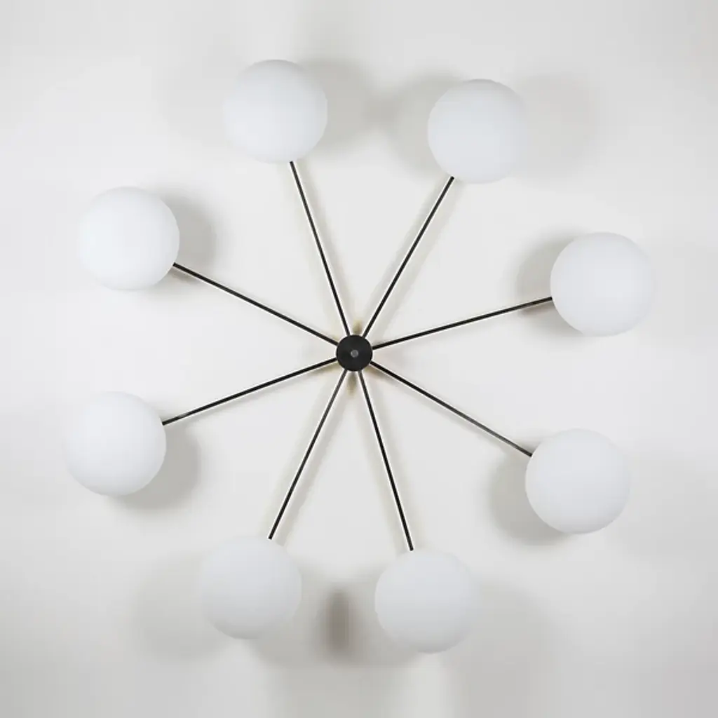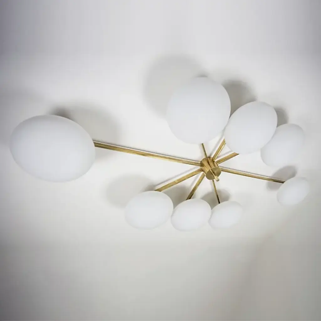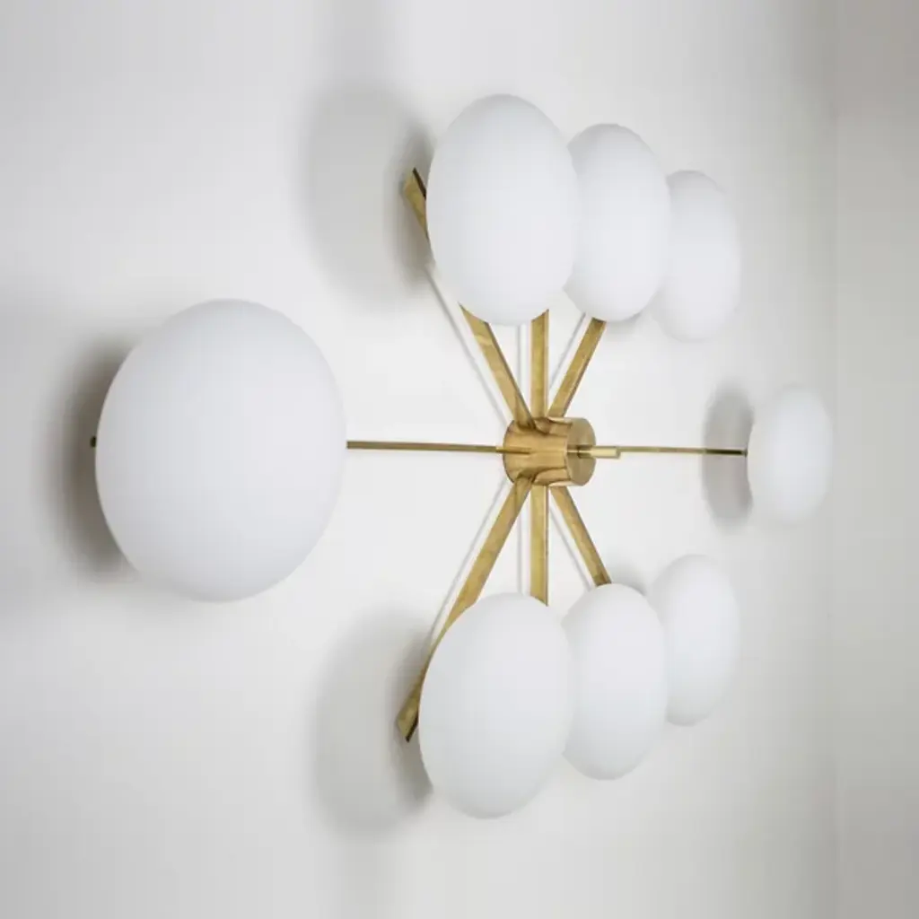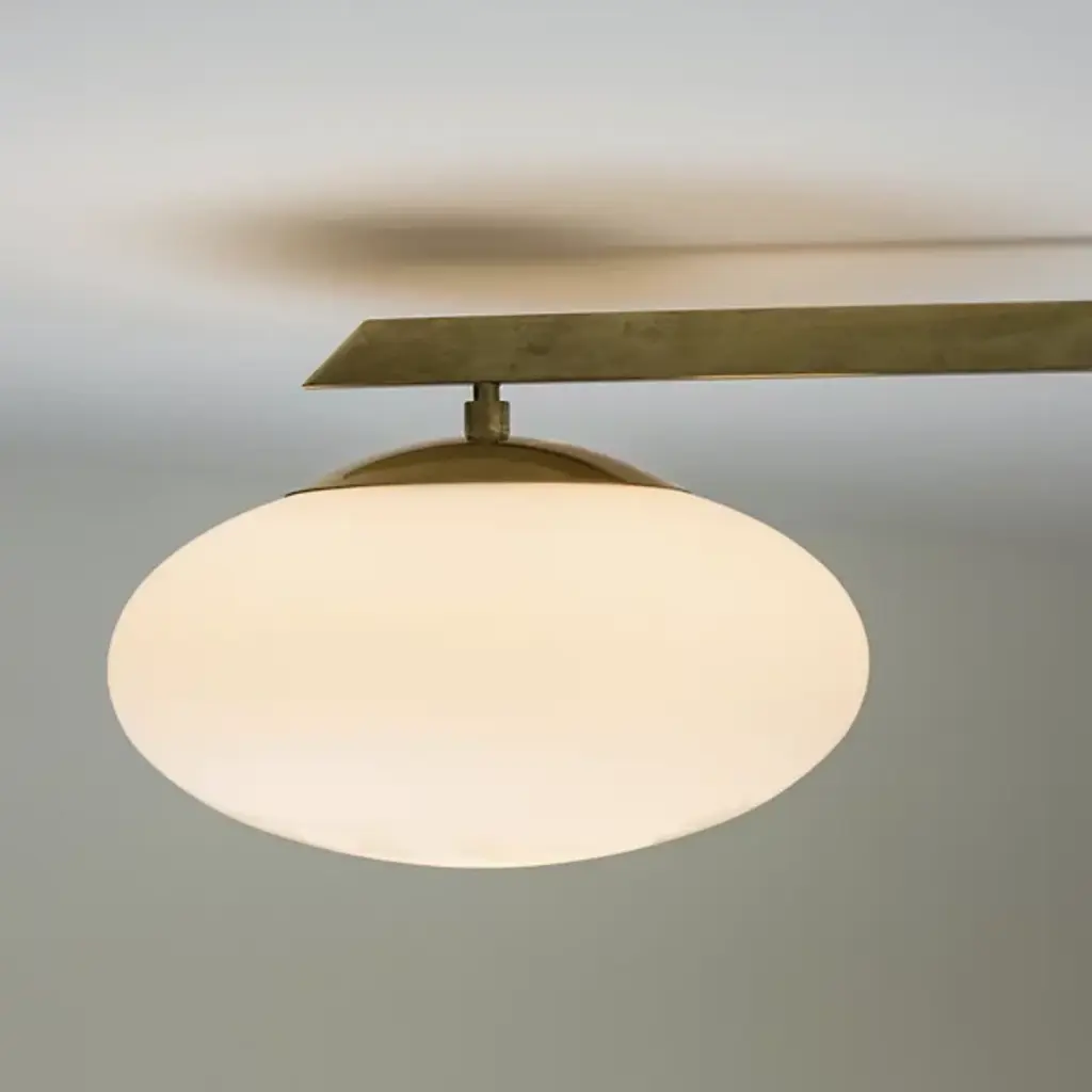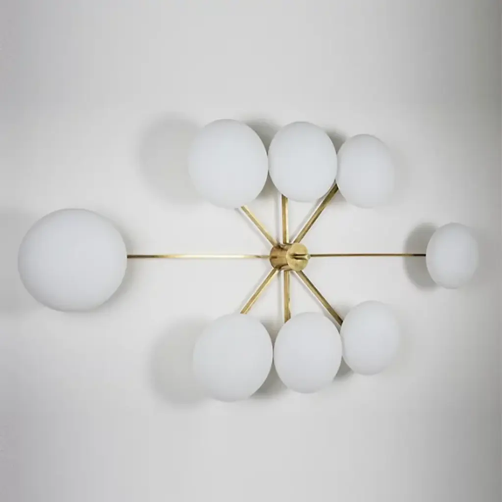 The Evening Wall / Ceiling Light from Design For Macha delights at any time of day with a playful configuration of geometry inspired by mid-century Italian design. Design For Macha's pieces honors the noble brass material and true craftsmanship. Here, artisans create a central brass body that can be mounted overhead or against the wall. This body visually bursts with fine brass arms that underscore a graphic silhouette. Dotting the arms, Murano opaline glass globes give off a floating quality in their pristine shape and color. A soothing glow fills up each globe and exits to glaze the room.