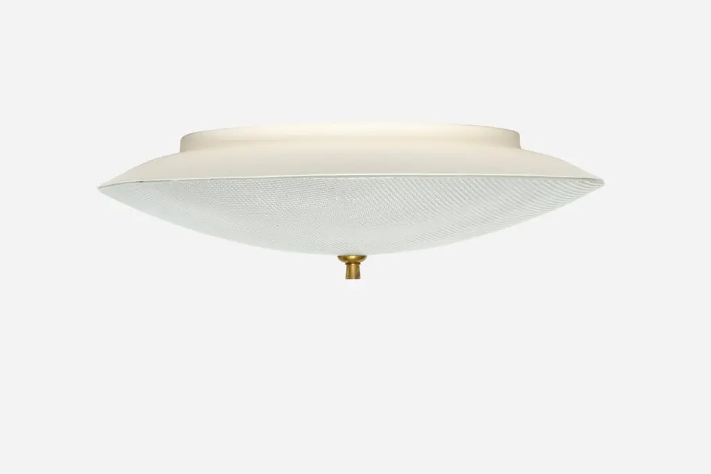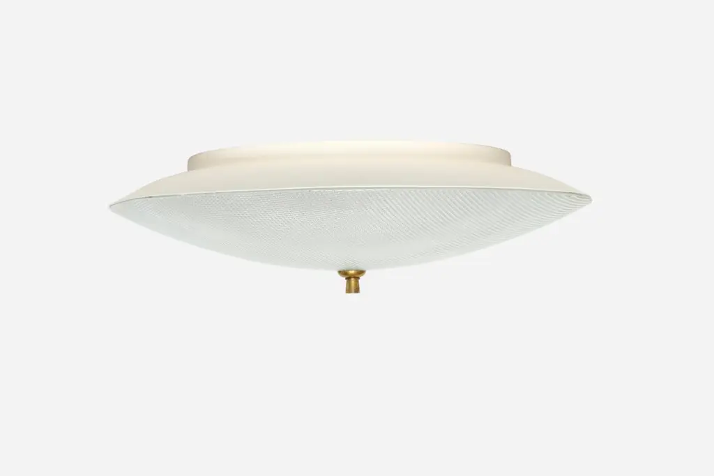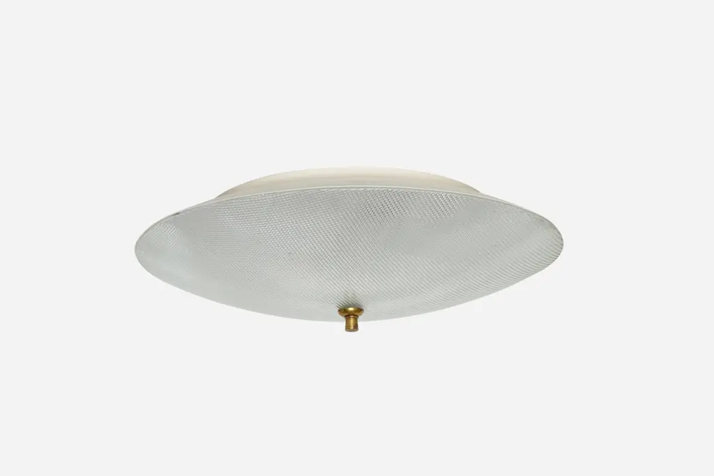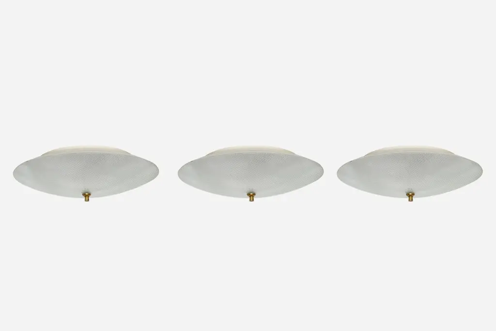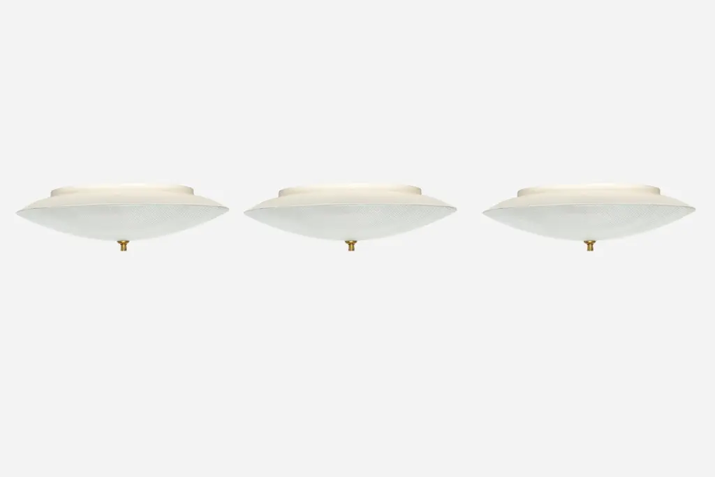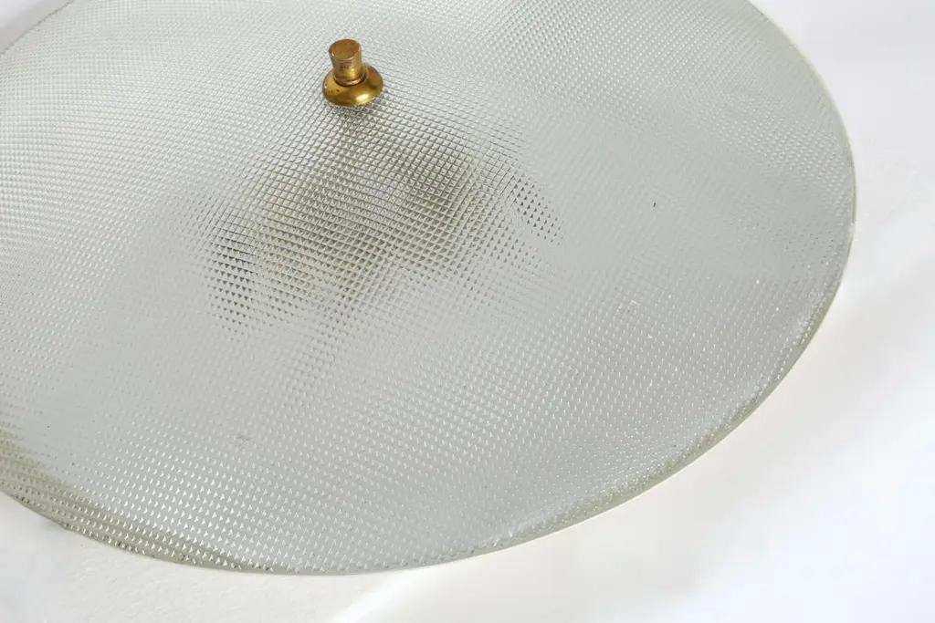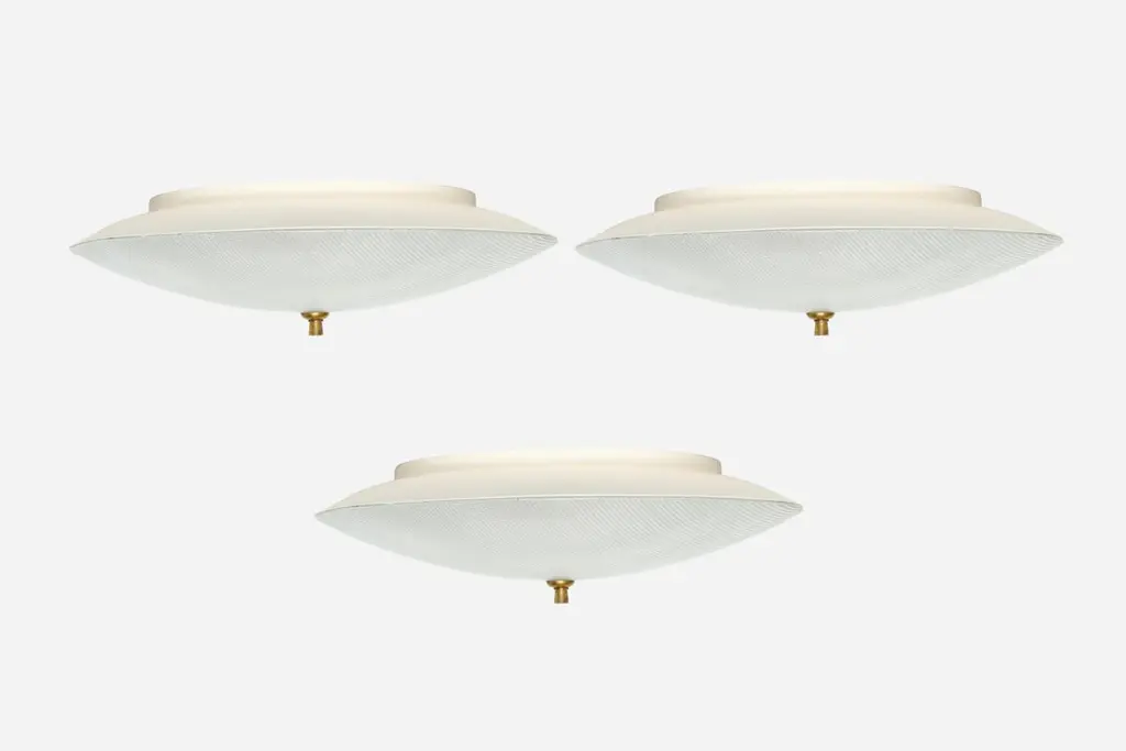 Stilnovo flush mount ceiling lightMade in Italy in 1960s.Textured glass, enameled metal, brass.Each takes 3 medium base bulbs each.Complimentary US rewiring upon request.Price is for 1 light.3 lights are available.FREE US rewiring upon request.FREE US Continental shipping.NO TARIFFS, Duties or Customs fees on US orders.We are located in the US.We take pride in bringing vintage fixtures to their full glory again.At Illustris Lighting our main focus is to deliver lighting fixtures to our clients in ready to install condition. Every item in our collection goes through strict condition inspection and receives careful restoration if it’s needed.We work with highly skilled restorers, the very best in the business. They are experts in European lighting and happy to do custom modifications, exquisite patinas and give the vintage lights their second lease on life.Every single fixture comes with a complimentary US rewiring and adapted to US standards.