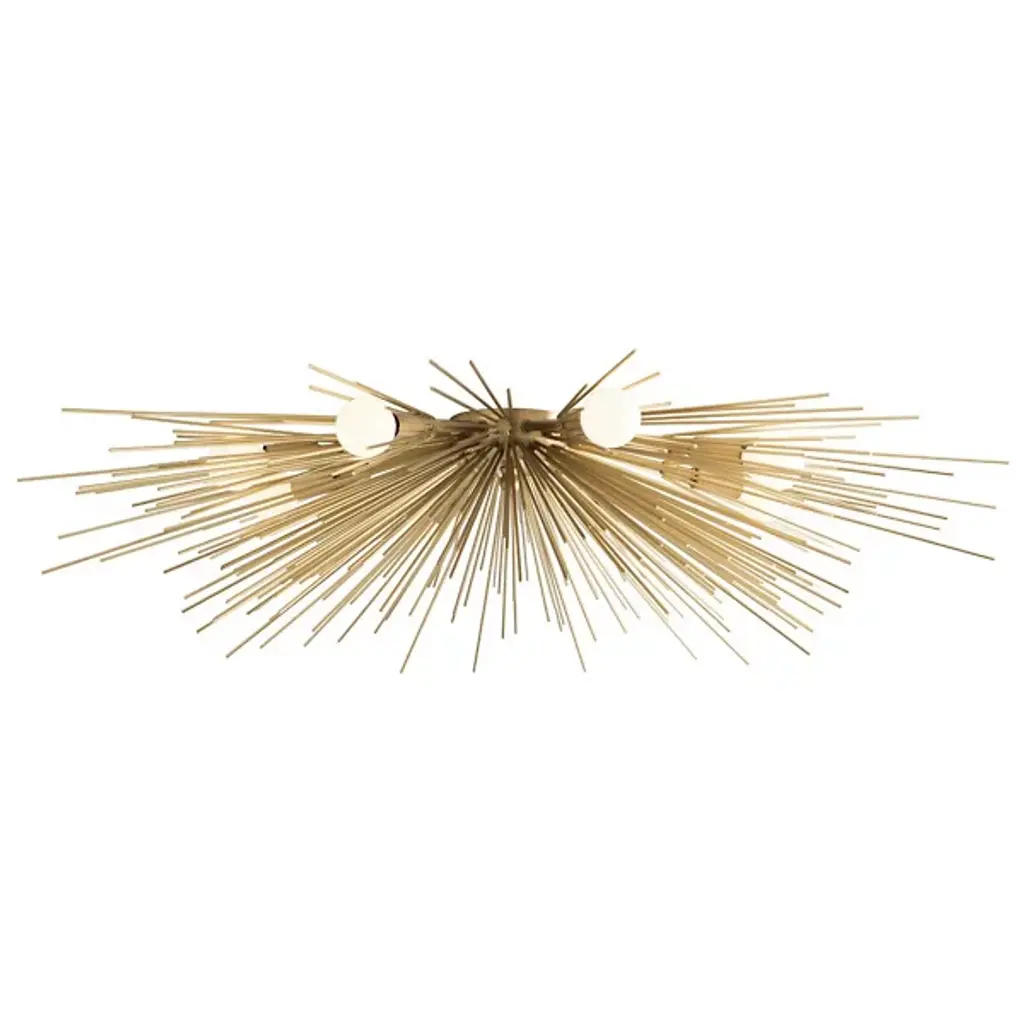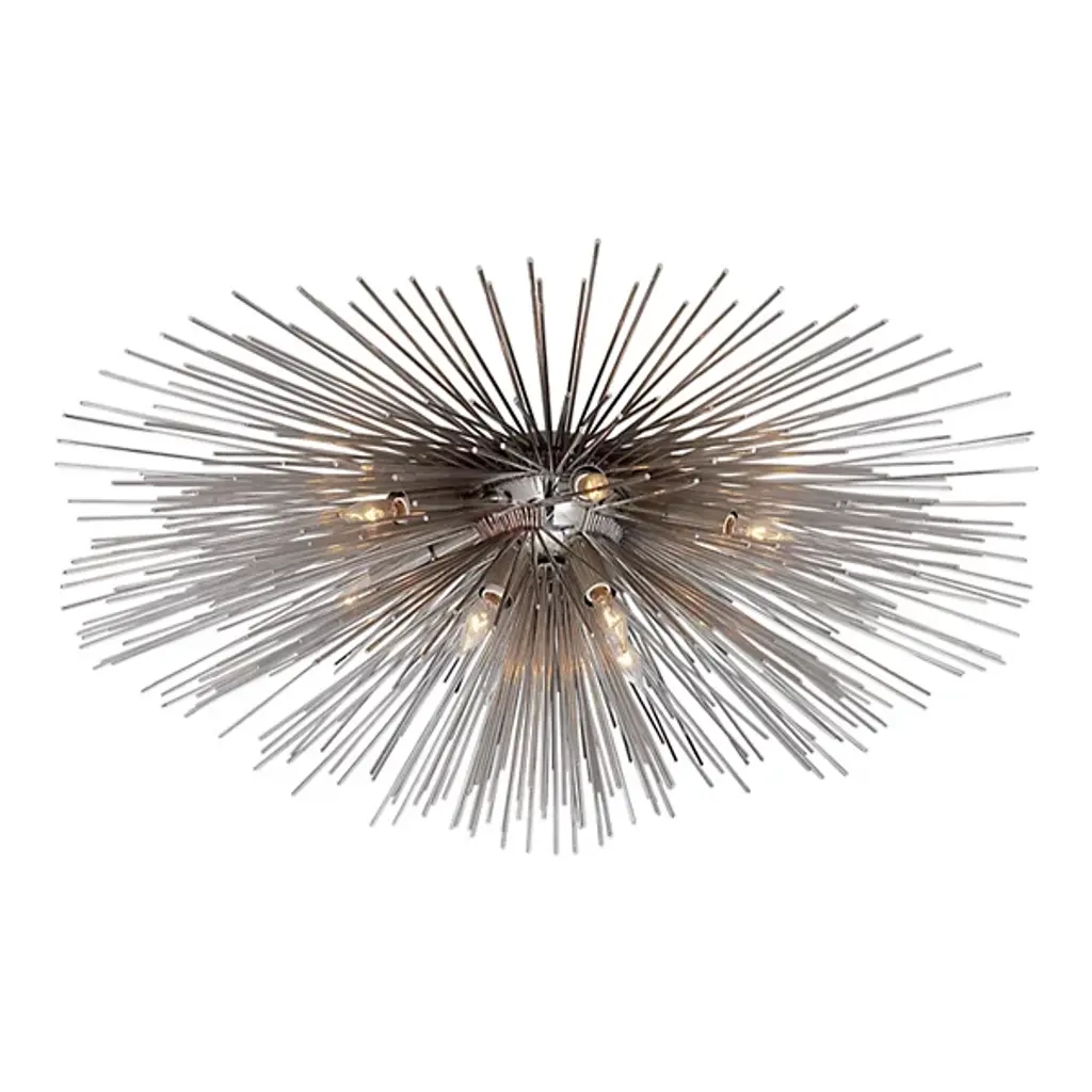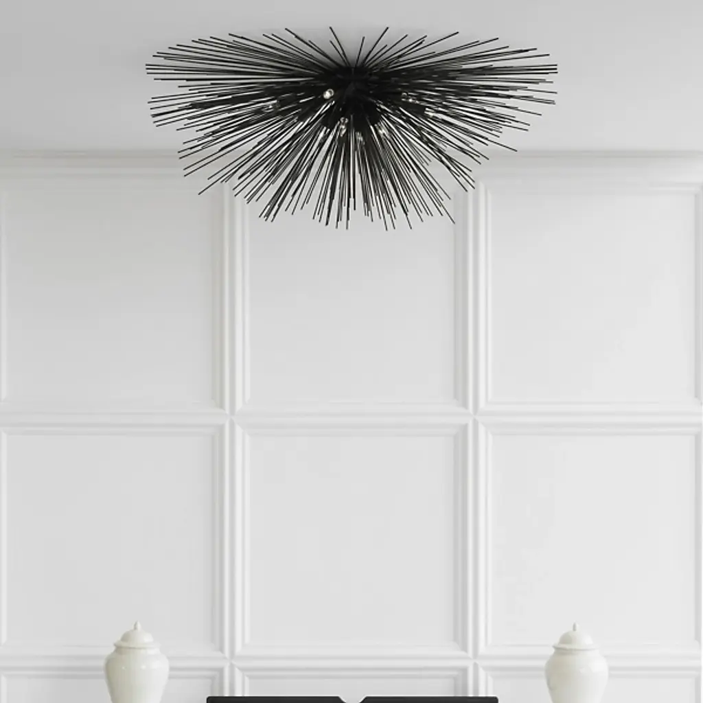Bursting with personality, the Strada Flushmount by Visual Comfort Signature, formerly known as Visual Comfort, is a captivating centerpiece fit for any living space. Its explosive silhouette features a series a thin metal rods which extend from a central spherical hub. Once lit, the fixture produces a unique, dynamic effect that shimmers like a distant star as your perspective changes.