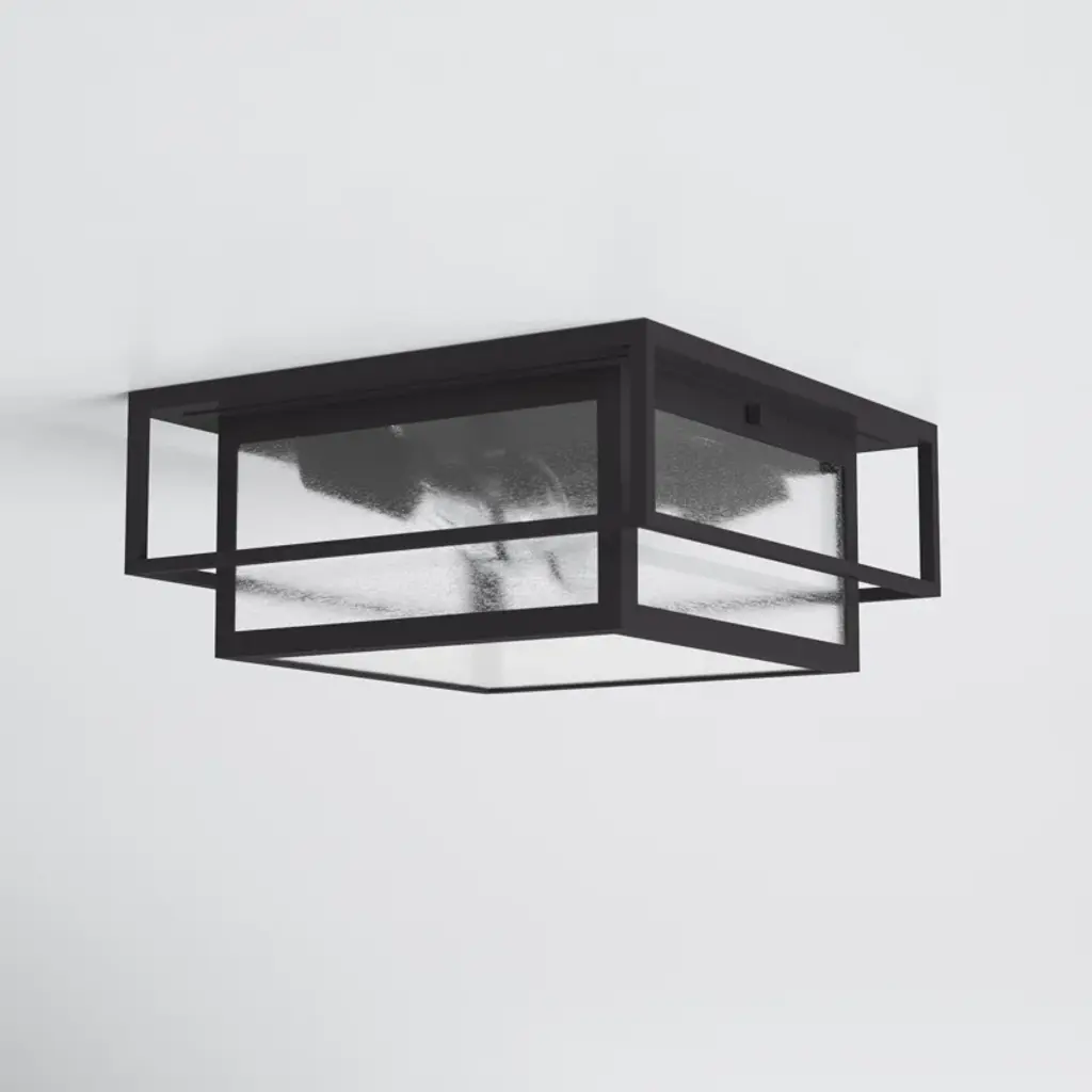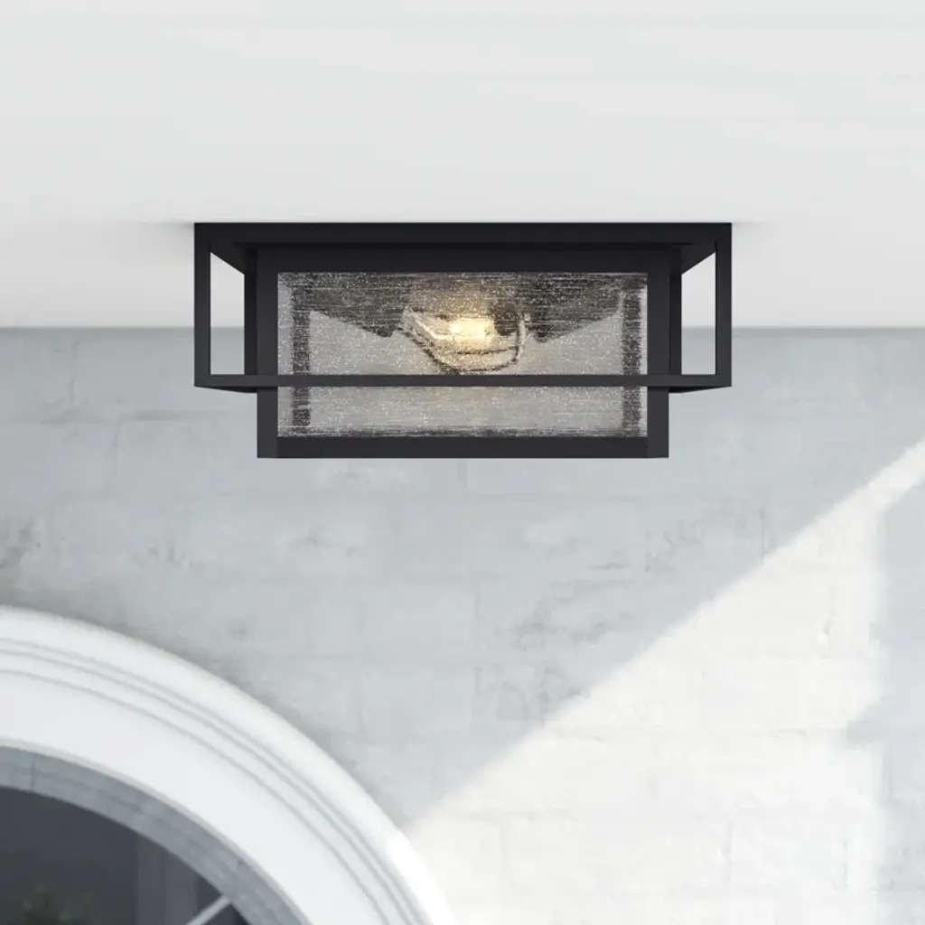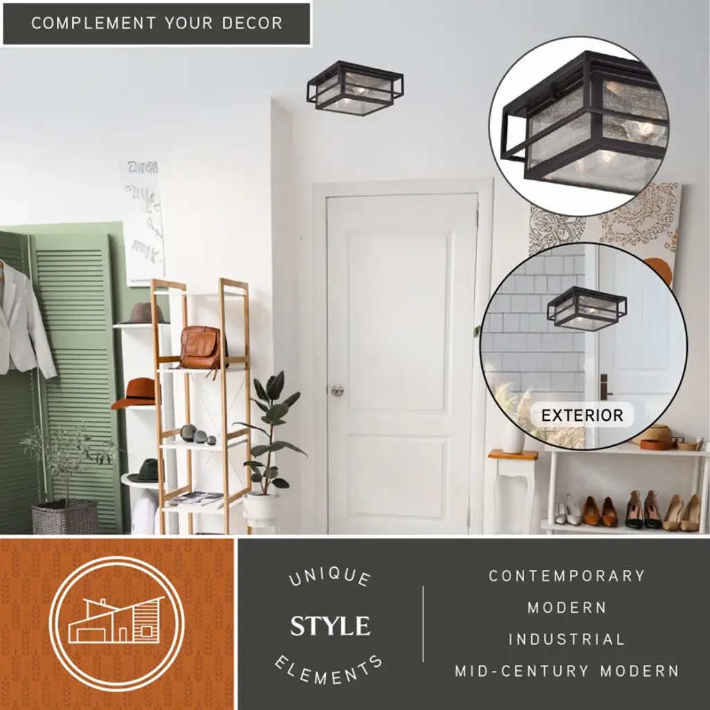 This 2-light outdoor flush mount shows off clean lines and seeded glass surfaces for a well-worn, antique-inspired look. Crafted from steel with an espresso bronze finish, it's square in shape with an outer open frame. An inner glass-paneled one filters the light from two 60W max bulbs (sold separately). This mount is compatible with dimmer switches and safe to install in enclosed outside locations like a covered front porch or beneath an awning. With a hanging height of 12", it also doesn't get in the way when people walk underneath.