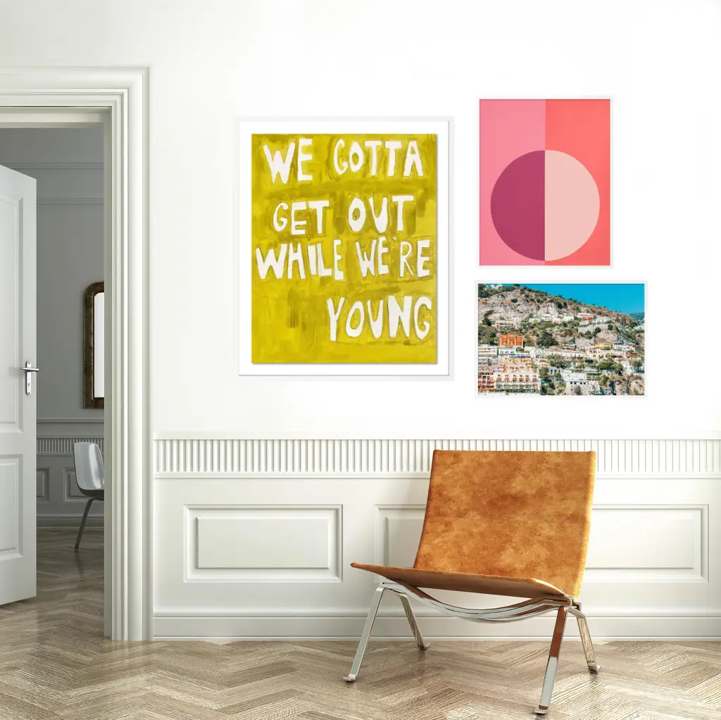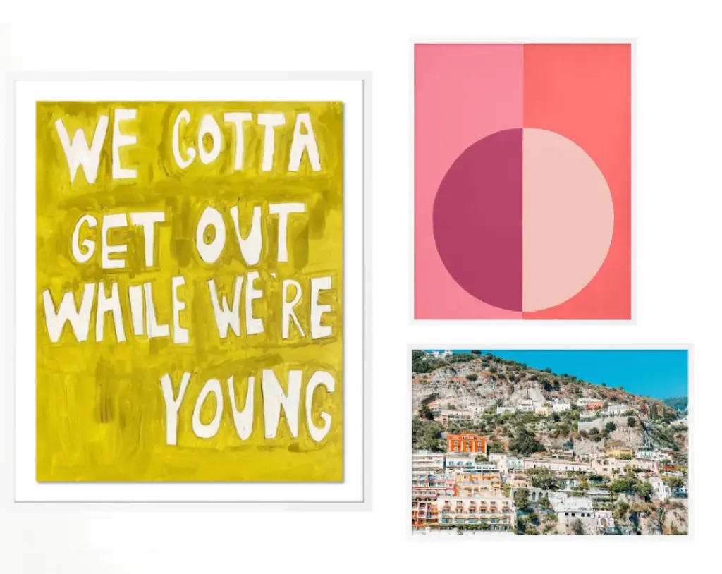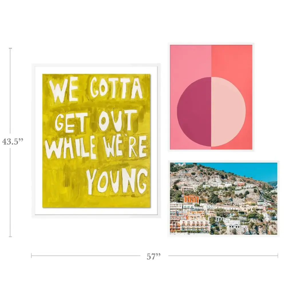 With the purchase of this item, you will be receiving the following prints, framed and ready to hang: 1. We Gotta Get Out While We're Young by Virginia Chamlee Overall Size: 30x36. Image Size: 25x31. Orientation: Vertical. Mounting Style: Float. Frame Color: White. Hanging Hardware: Picture Perfect. 2. Pink Forever by Stephanie Henderson Overall Size: 19x24. Image Size: 18x23. Orientation: Vertical. Mounting Style: Flush. Frame Color: White. Hanging Hardware: Picture Perfect. 3. Positano 1 by Natalie Obradovich Overall Size: 24x16.5. Image Size: 23x15.5. Orientation: Horizontal. Mounting Style: Flush. Frame Color: White. Hanging Hardware: Picture Perfect. Additional Framing Information: - Includes acrylic glazing, which has less glare than standard glass and is far lighter - Each piece is finished with a black tyvek dust cover on the back - Arrives ready to hang with picture perfect hanging hardware kit (consumer friendly hanging hardware)