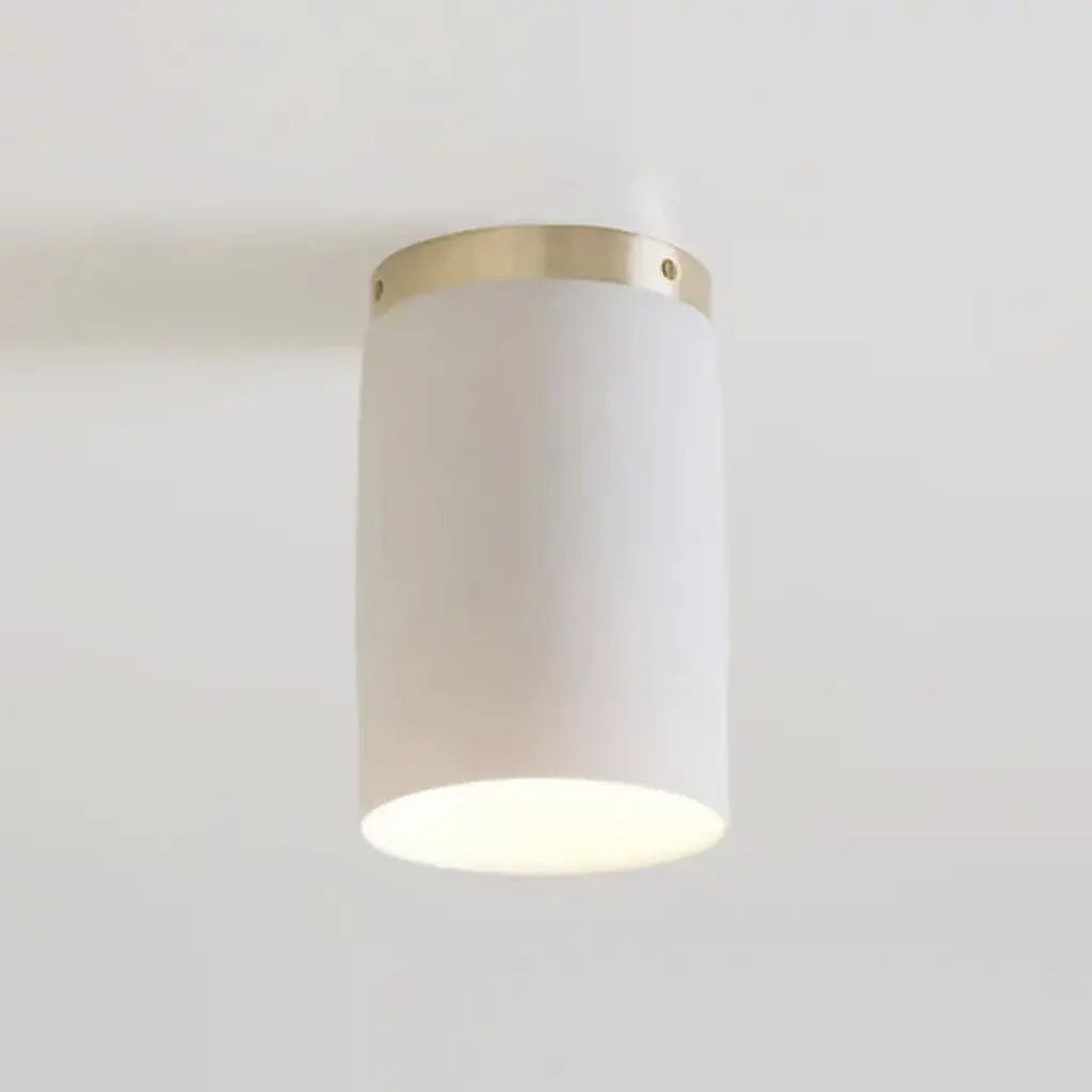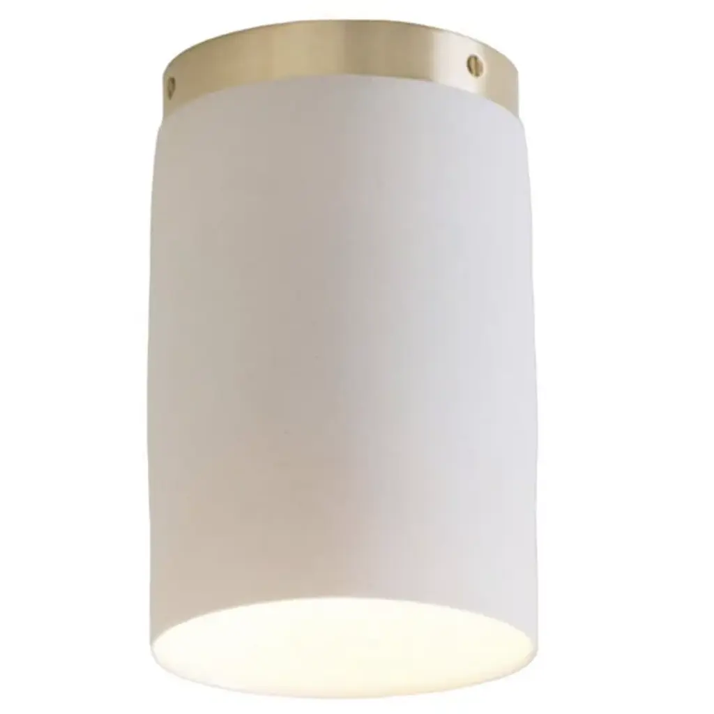 Lend a well-regarded retro appeal to interior ceilings with the Surface Flushmount from Roll & Hill. A restrained Nash Martinez design that pairs functionality with fab craftsmanship, it starts with a brass circular ceiling mount and collar, placing strong lamping inside a cylindrical ceramic shade. This shade provides continuity of shape with the upper collar while taking on a mix of reflected radiant glow and a direct pool of task light emanating below.