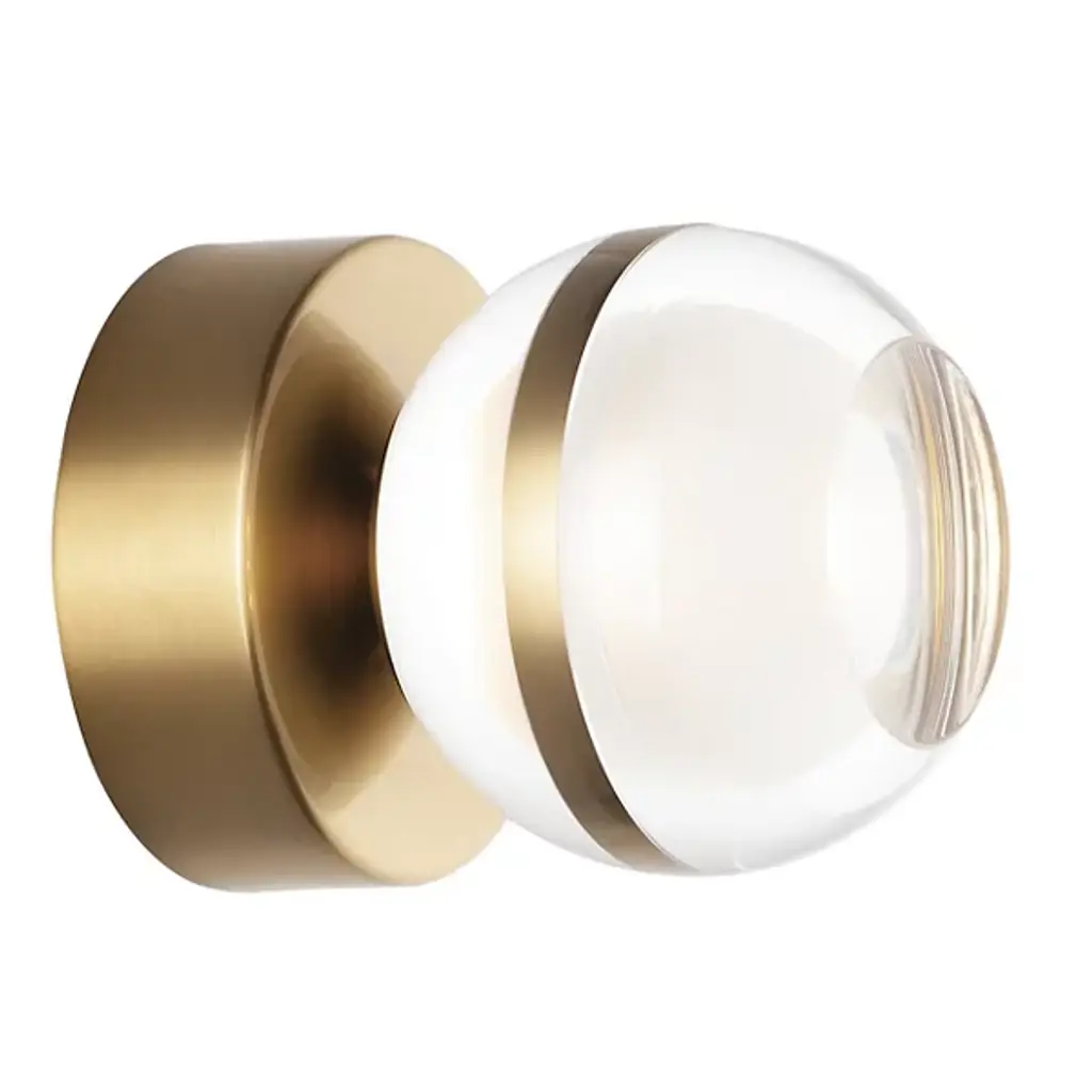 Add a warm and comforting glow to your modern home with the Sylvana LED Wall / Flushmount from Huxe. Presenting an appealing contrast of materials, this piece starts with a rounded wall mount made of smooth metal. A slim central band wraps around the glass orb shade and matches with the wall mount. A frosted glass sphere rests within the clear glass layer, holding an integrated LED which emits a bright and warming illumination.