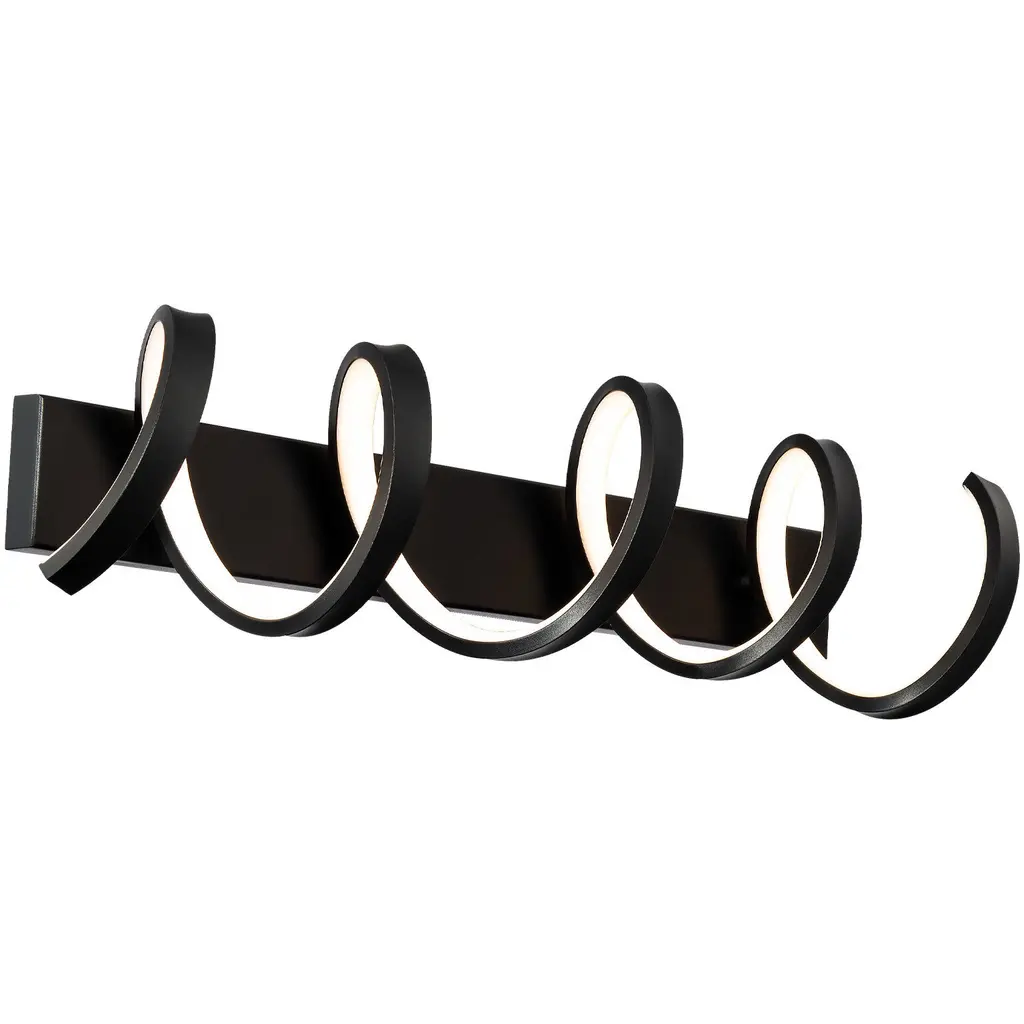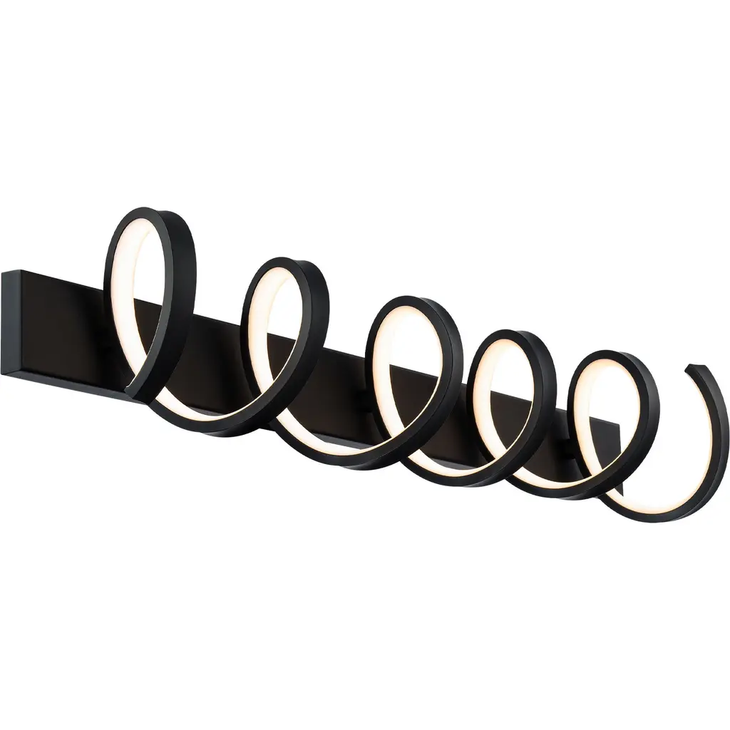 A looping radiant line casts light across space in a continuous helical path. The Synergy series is characterized by the rolled rectangular extrusion, which emits soft light through the silicon opal lens. Configured in both linear and ring arrangements, the arcing aluminum allows the curated finishes to be visible at every angle.