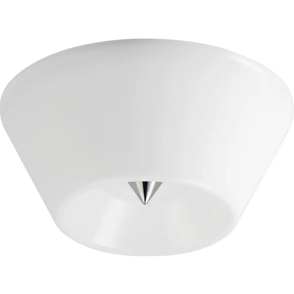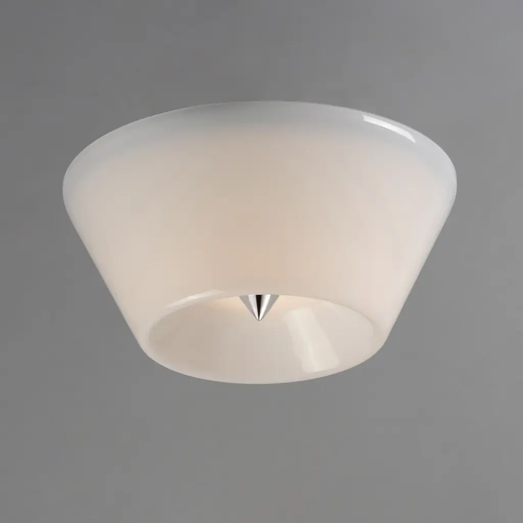 Accentuating the cone shape, this LED surface mounted fixture features a tapered glass shade and is supported by a conical finial in complementary finishes. Available in Polished Chrome, Matte Black, or Natural Aged Brass this simple design adds flair to a simple application.