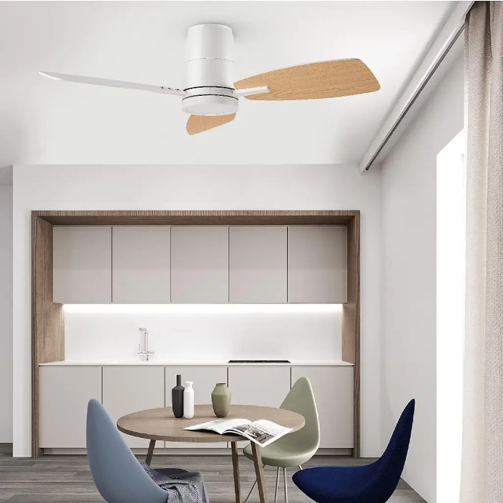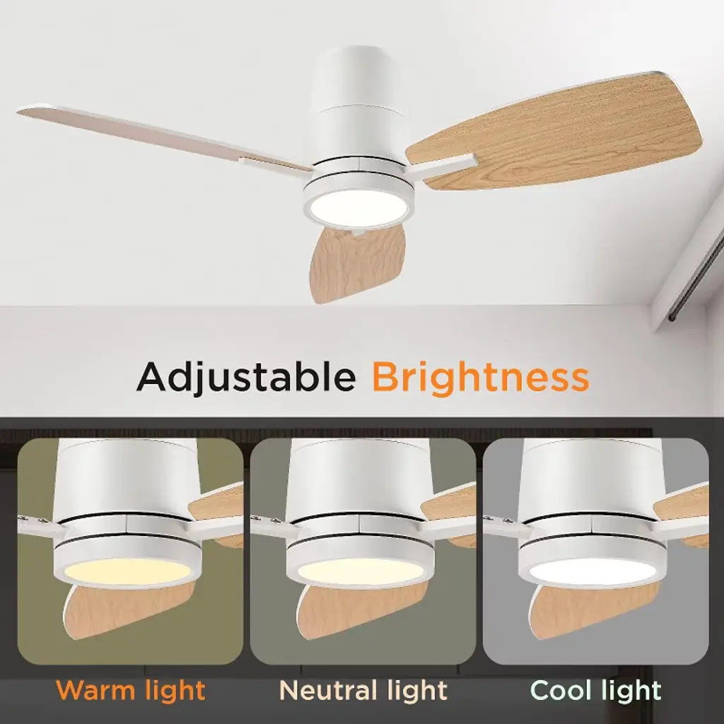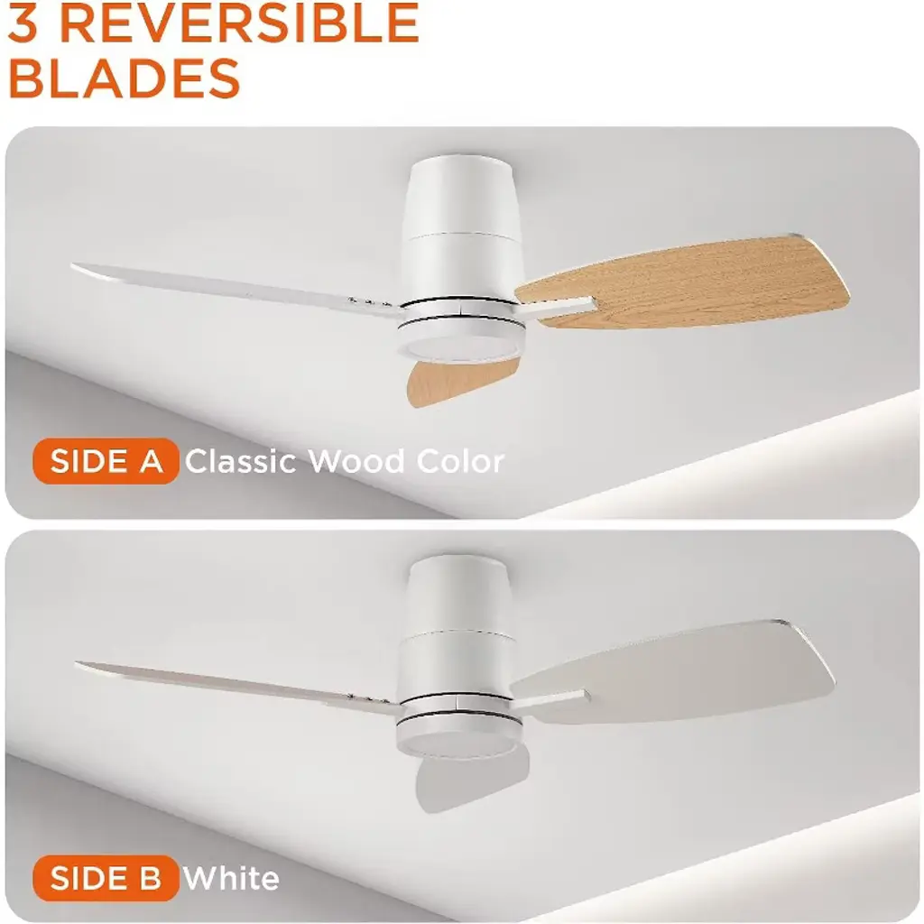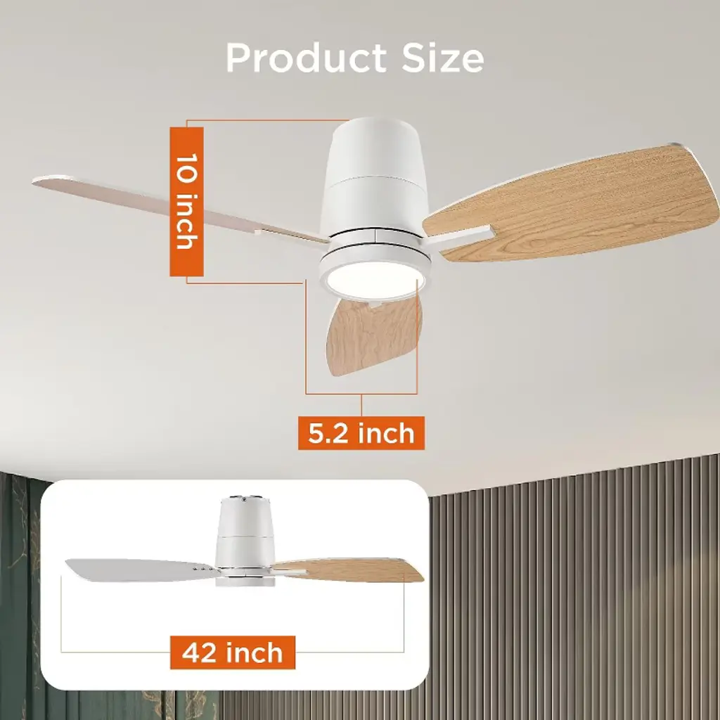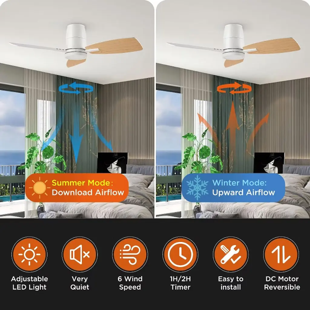 The modern ceiling fan features a quiet and reversible DC motor, which delivers strong and cool wind during summer and optimizes air circulation in winter.The flush mount ceiling fan comes with a user-friendly remote control included in the package, allowing you to easily adjust the fan speed among 6 options and switch between forward and reverse modes.