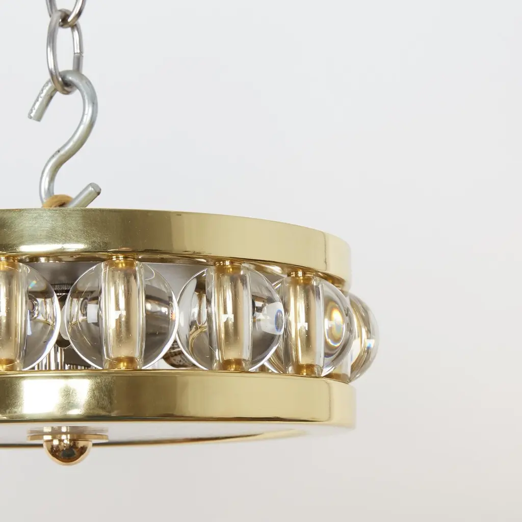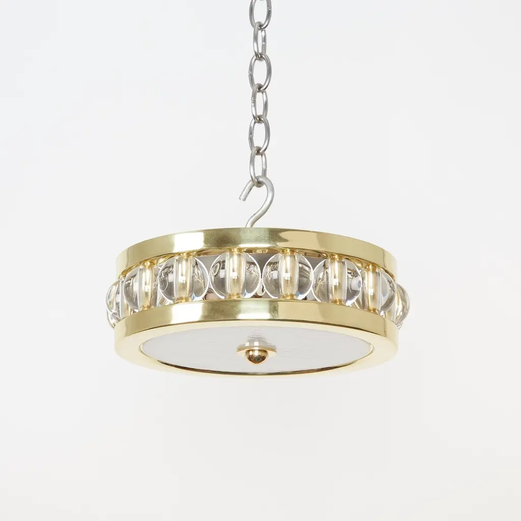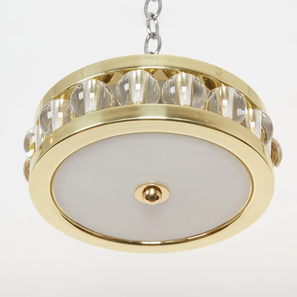 A 12.5" round flush-mounted ceiling fixture, the metal frame securing a flat piece of white swirl glass with finial in center on underside, the sides with overscaled Murano glass beads.The interior of fixture fitted with four Edison sockets.Maximum wattage 100/socket (Recommended wattage 60/socket)Pricing includes standard non-UL wiring.